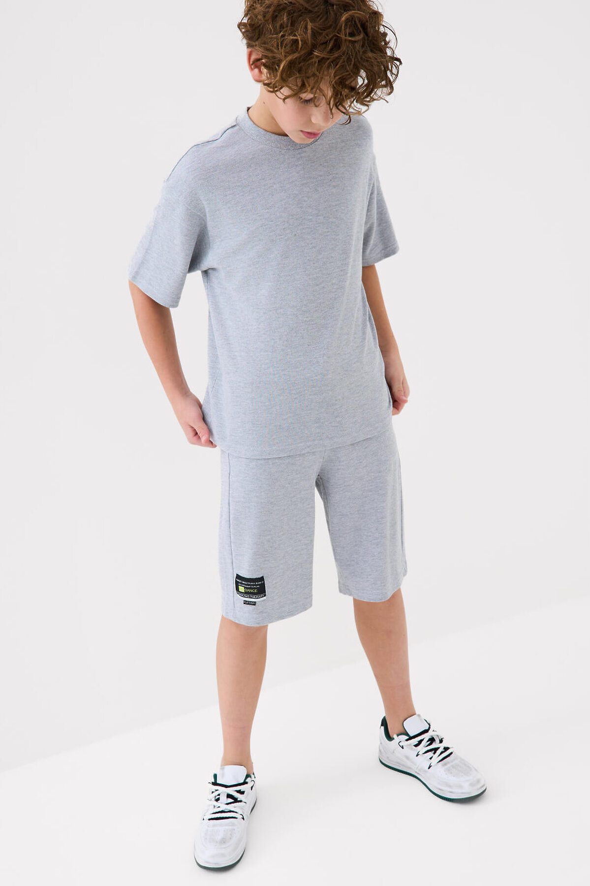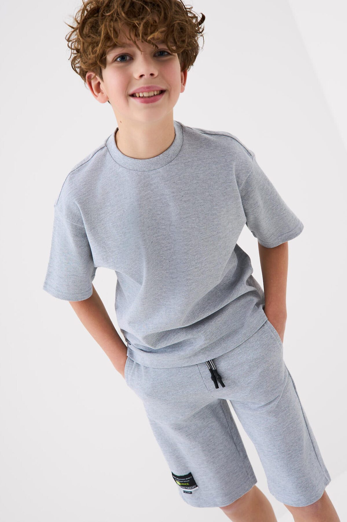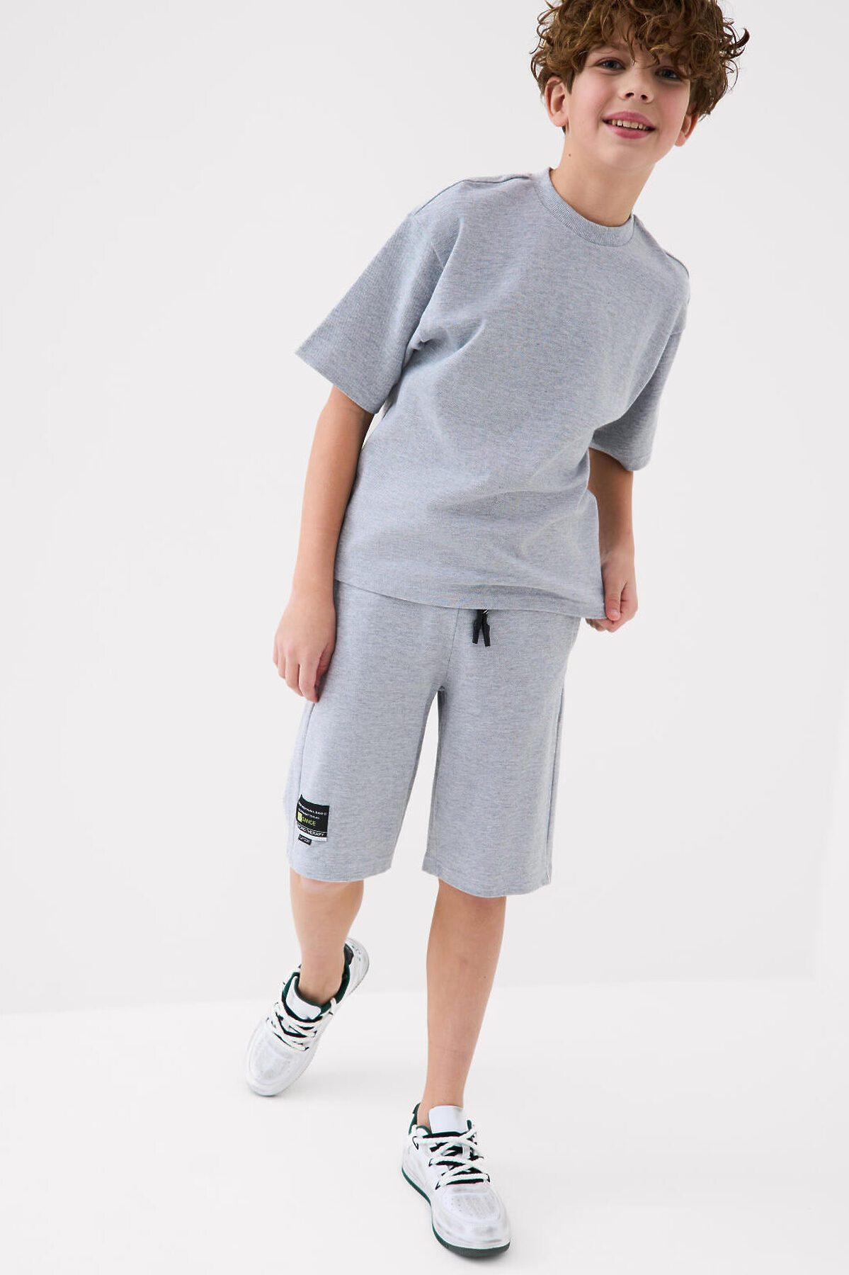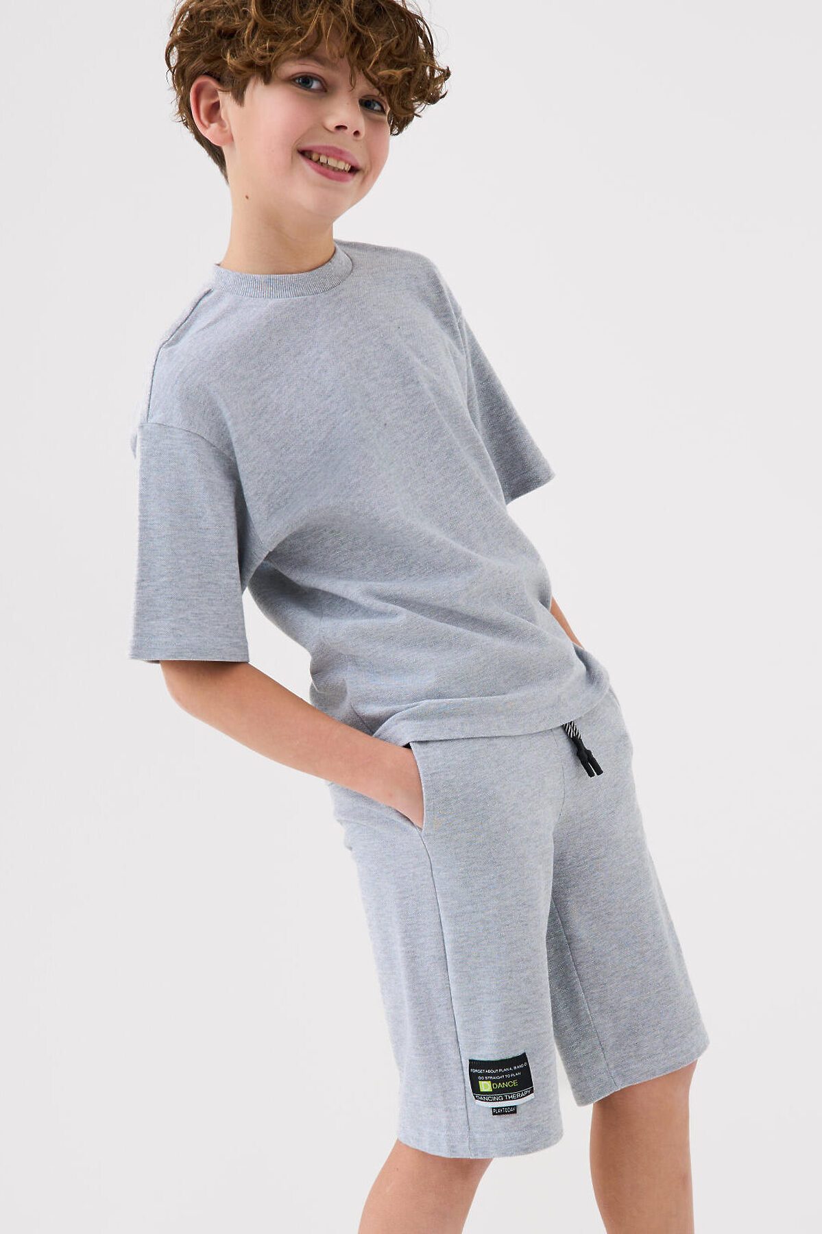 Костюм базовый для мальчика подростка. Состоит из футболки и шорт. Выполнен из хлопкового трикотажа пике. Футболка оверсайз, с коротким рукавом. Шорты свободные, с эластичным поясом и шнурком для регулировки посадки. По бокам расположены карманы. Декоративная нашивка.