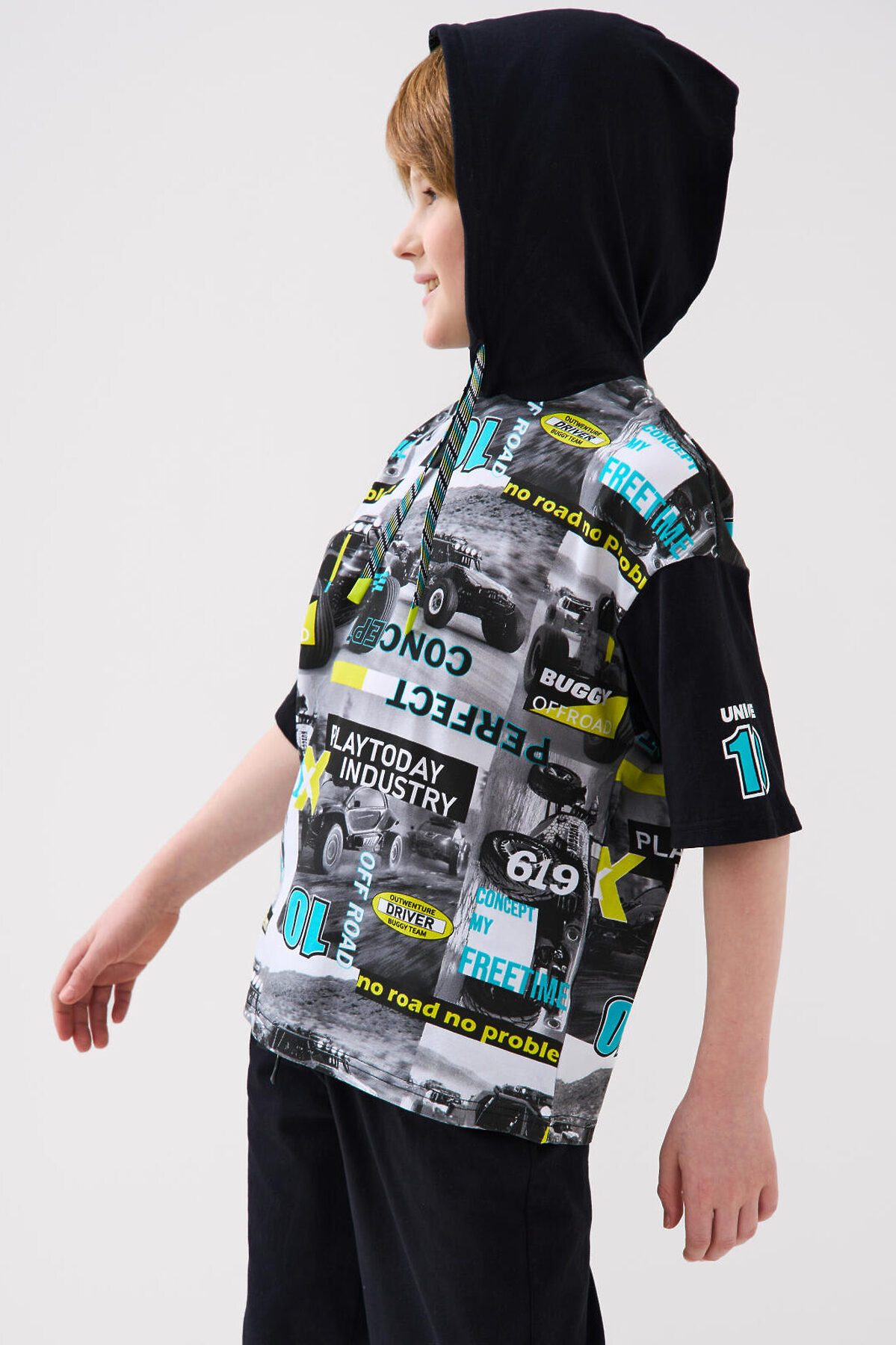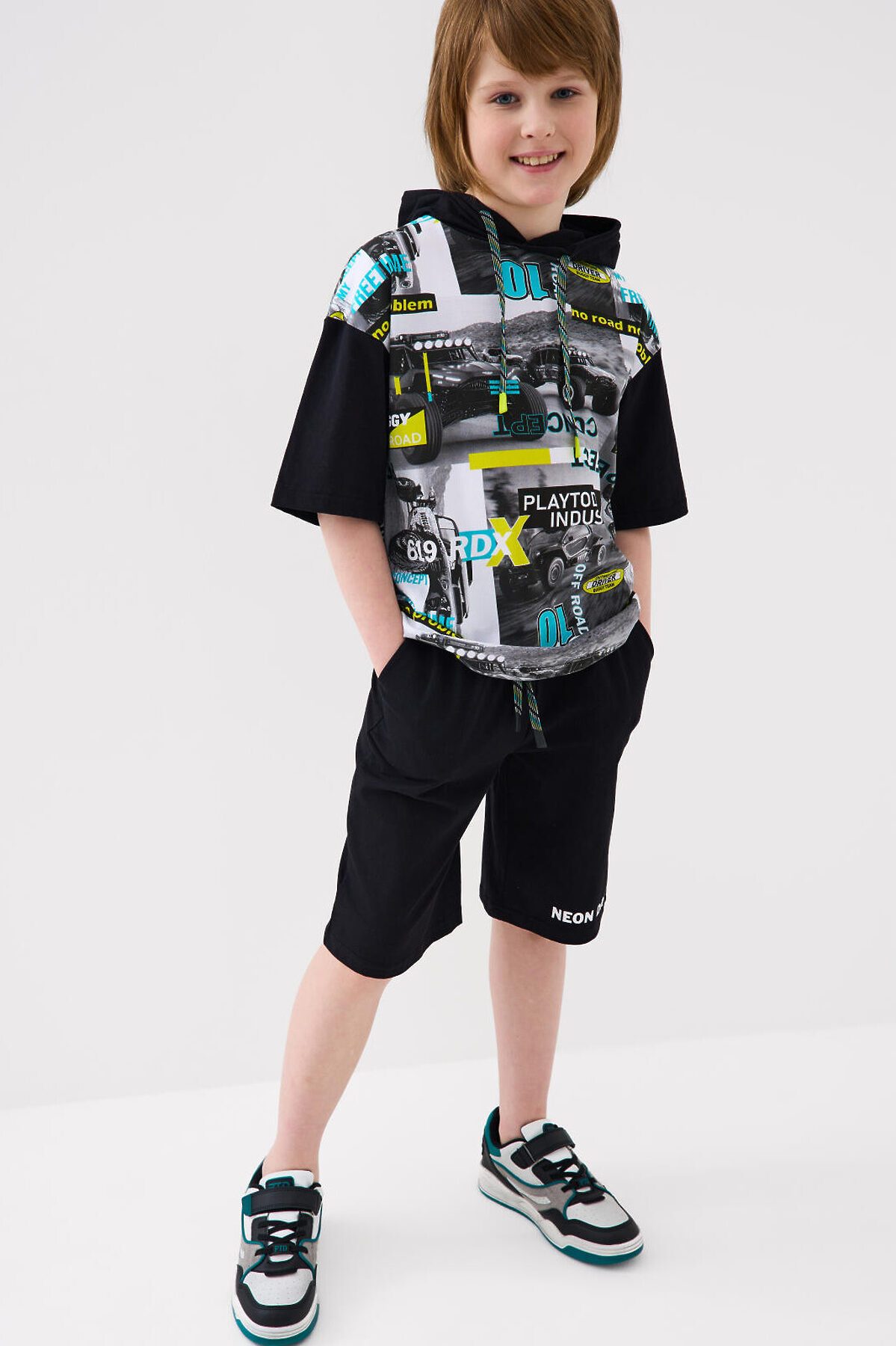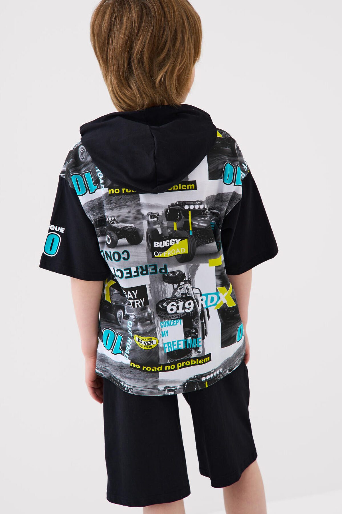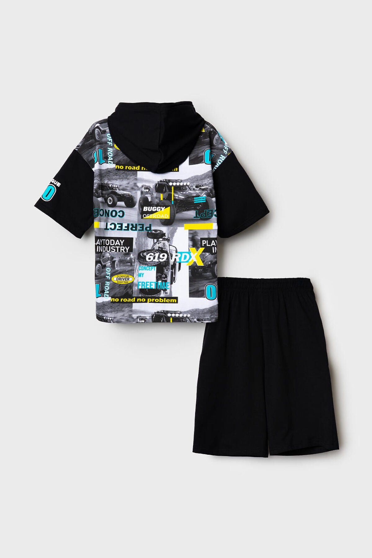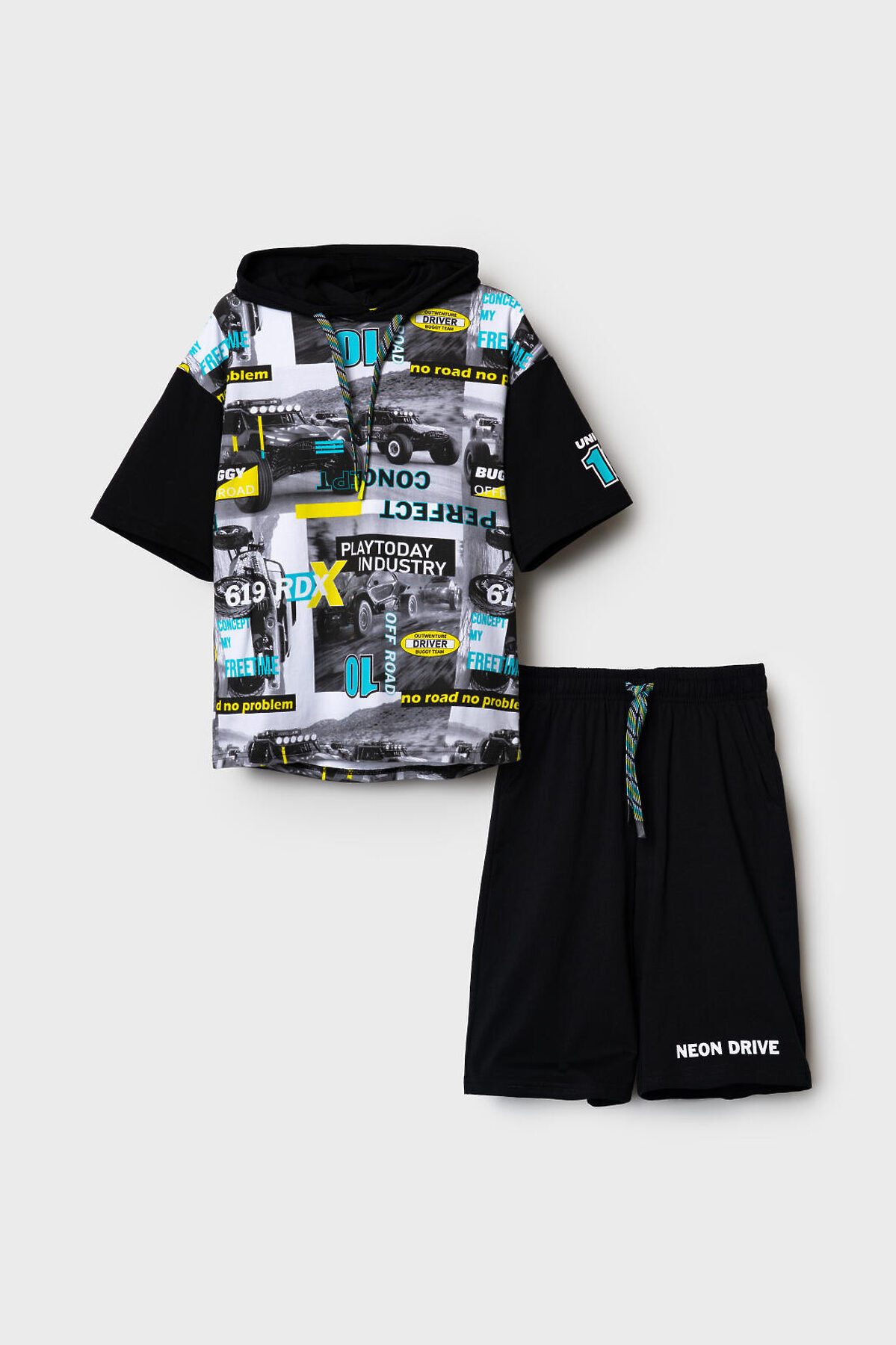 Костюм для мальчика подростка. Состоит из футболки и шорт. Выполнен из хлопкового трикотажа. Футболка прямого кроя с капюшоном. Регулировка капюшона шнуром. Яркий принт в гоночной тематике. Шорты свободные, с эластичным поясом и шнурком для регулировки посадки. По бокам расположены карманы.