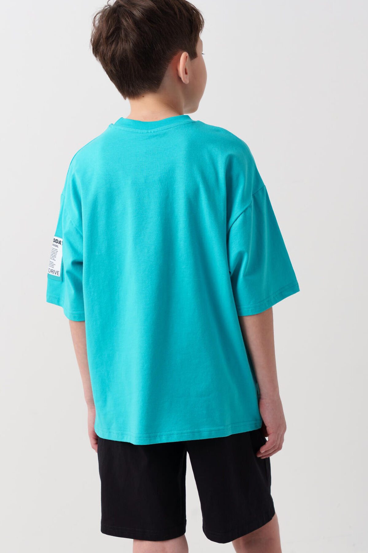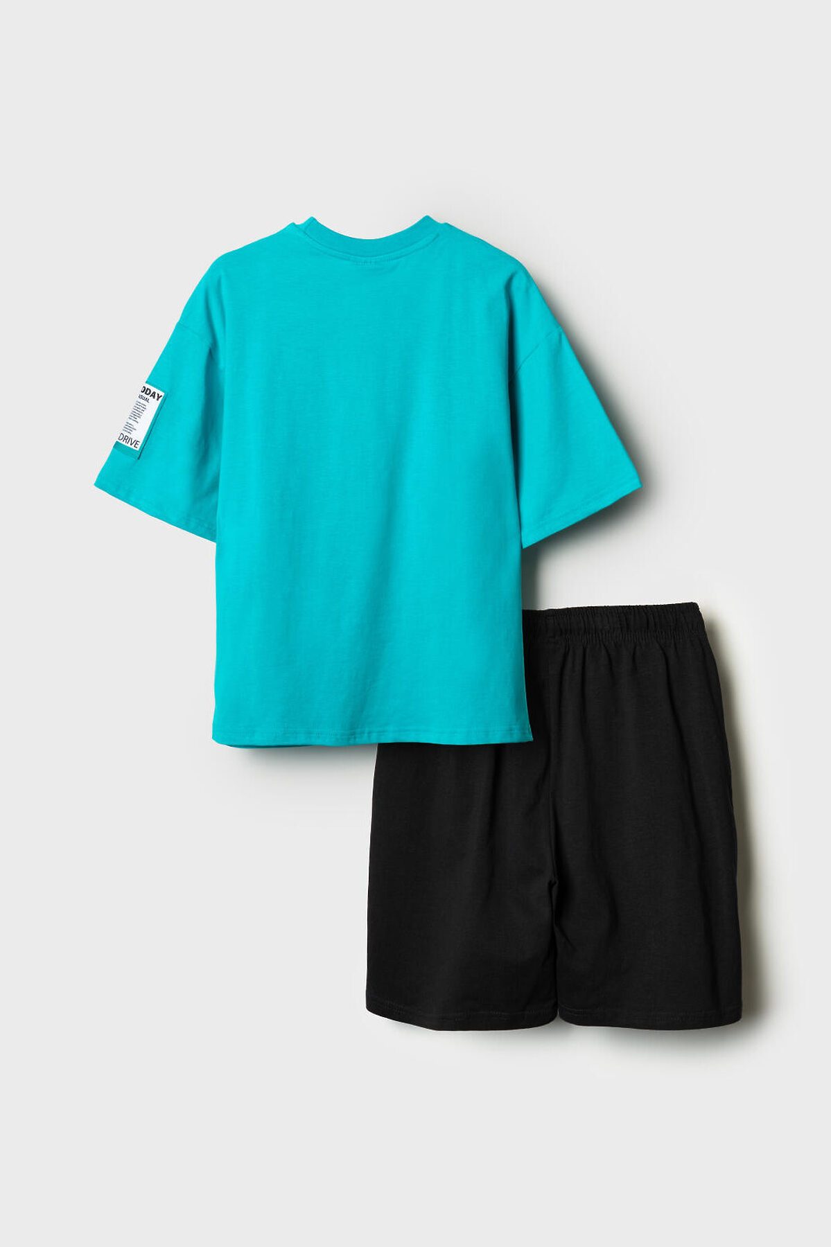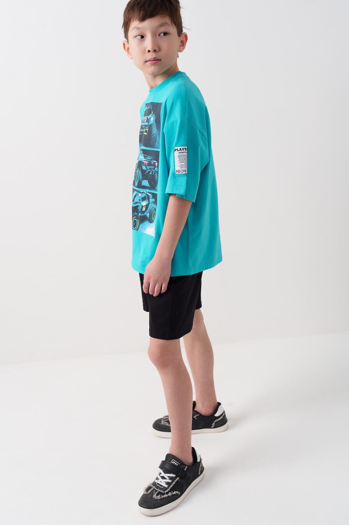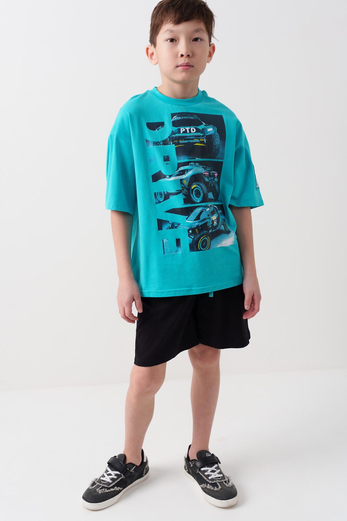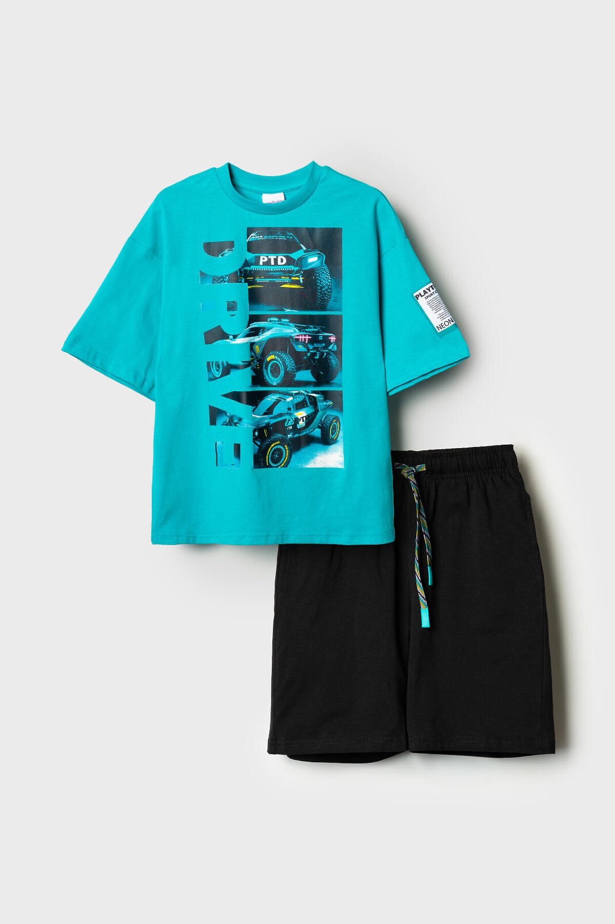 Костюм для мальчика подростка. Состоит из футболки и шорт. Выполнен из хлопкового трикотажа. Футболка оверсайз, с коротким рукавом. Принты и нашивка в гоночной тематике. Шорты свободные, с эластичным поясом и шнурком для регулировки посадки. По бокам расположены карманы.