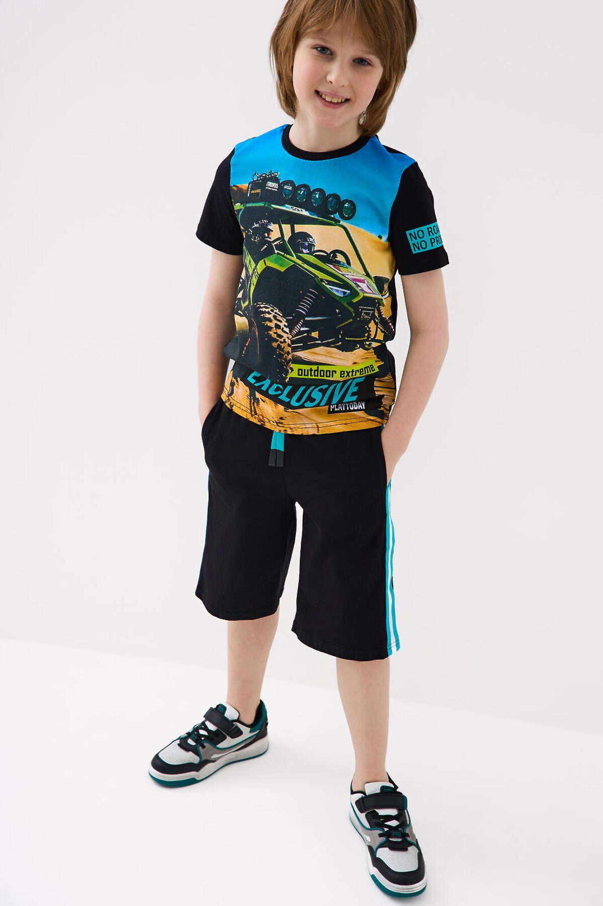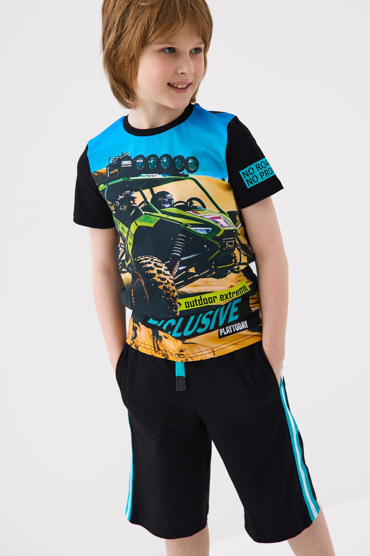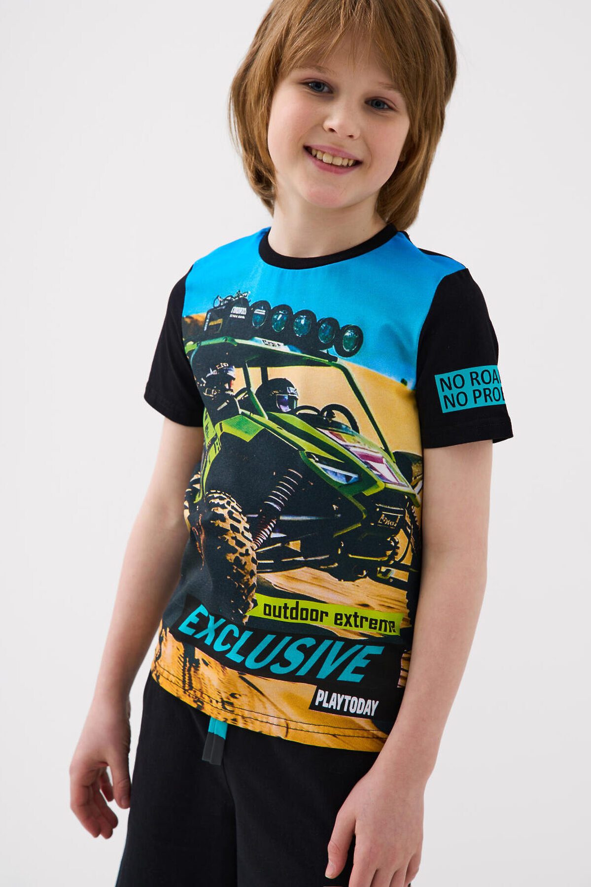 Футболка для мальчика подростка. Модель прямого кроя, выполнена из эластичного хлопкового трикотажа джерси. Крупные принты в гоночной тематике.
