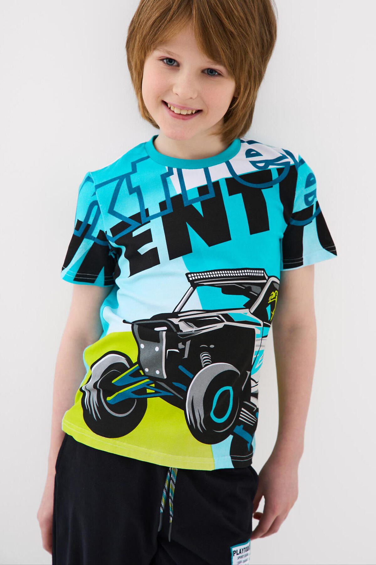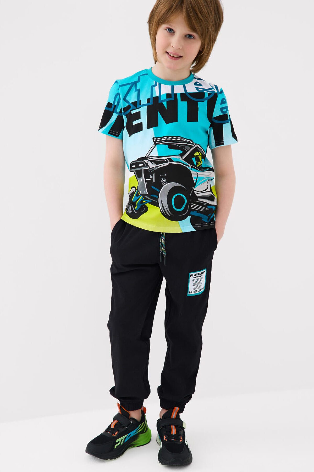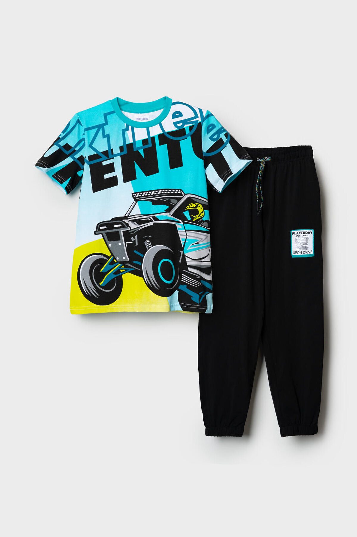 Костюм для мальчика подростка. Состоит из футболки с коротким рукавом и брюк джоггеров. Футболка прямого кроя с яркими принтами — изображение багги и надписи в спортивной тематике. Брюки выполнены из плотного хлопкового трикотажа. Модель с комфортной посадкой, пояс на резинке дополнен шнурком. Удобные боковые карманы. Внизу — эластичные манжеты.
