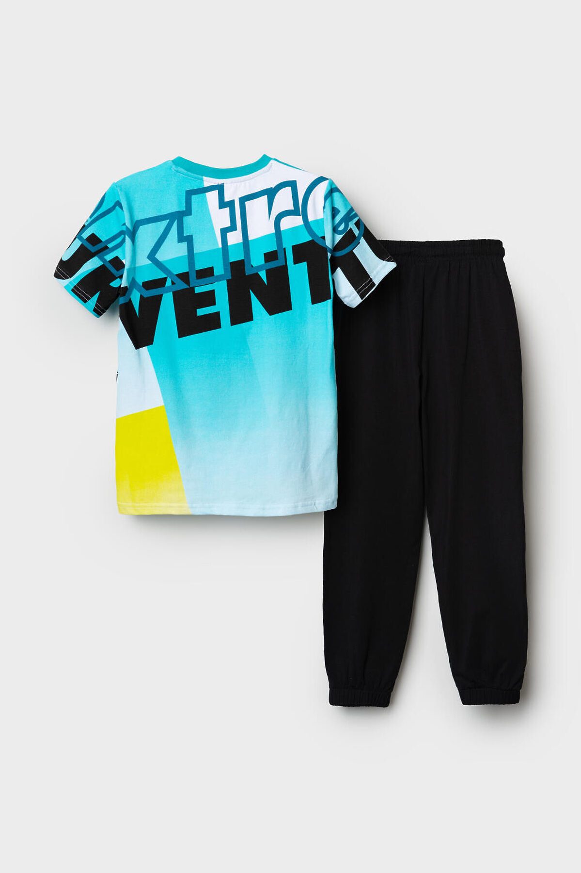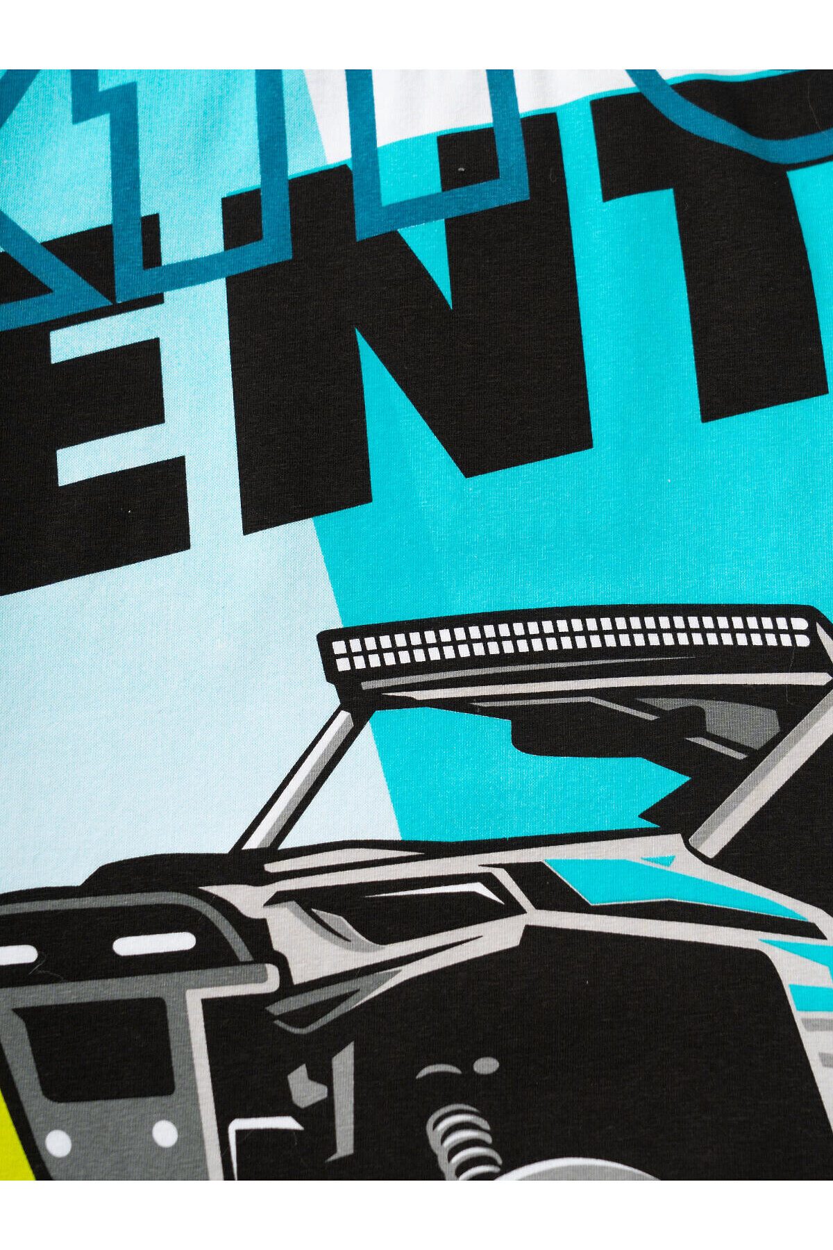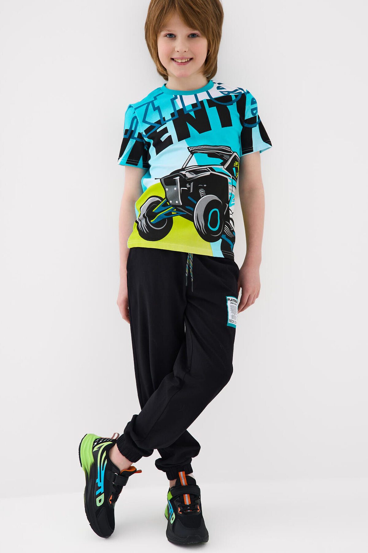 Костюм для мальчика подростка. Состоит из футболки с коротким рукавом и брюк джоггеров. Футболка прямого кроя с яркими принтами — изображение багги и надписи в спортивной тематике. Брюки выполнены из плотного хлопкового трикотажа. Модель с комфортной посадкой, пояс на резинке дополнен шнурком. Удобные боковые карманы. Внизу — эластичные манжеты.