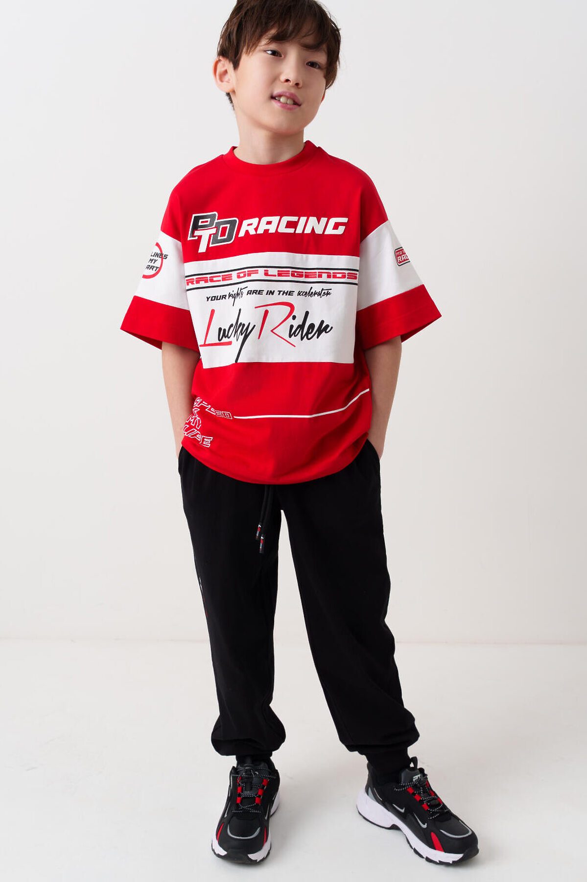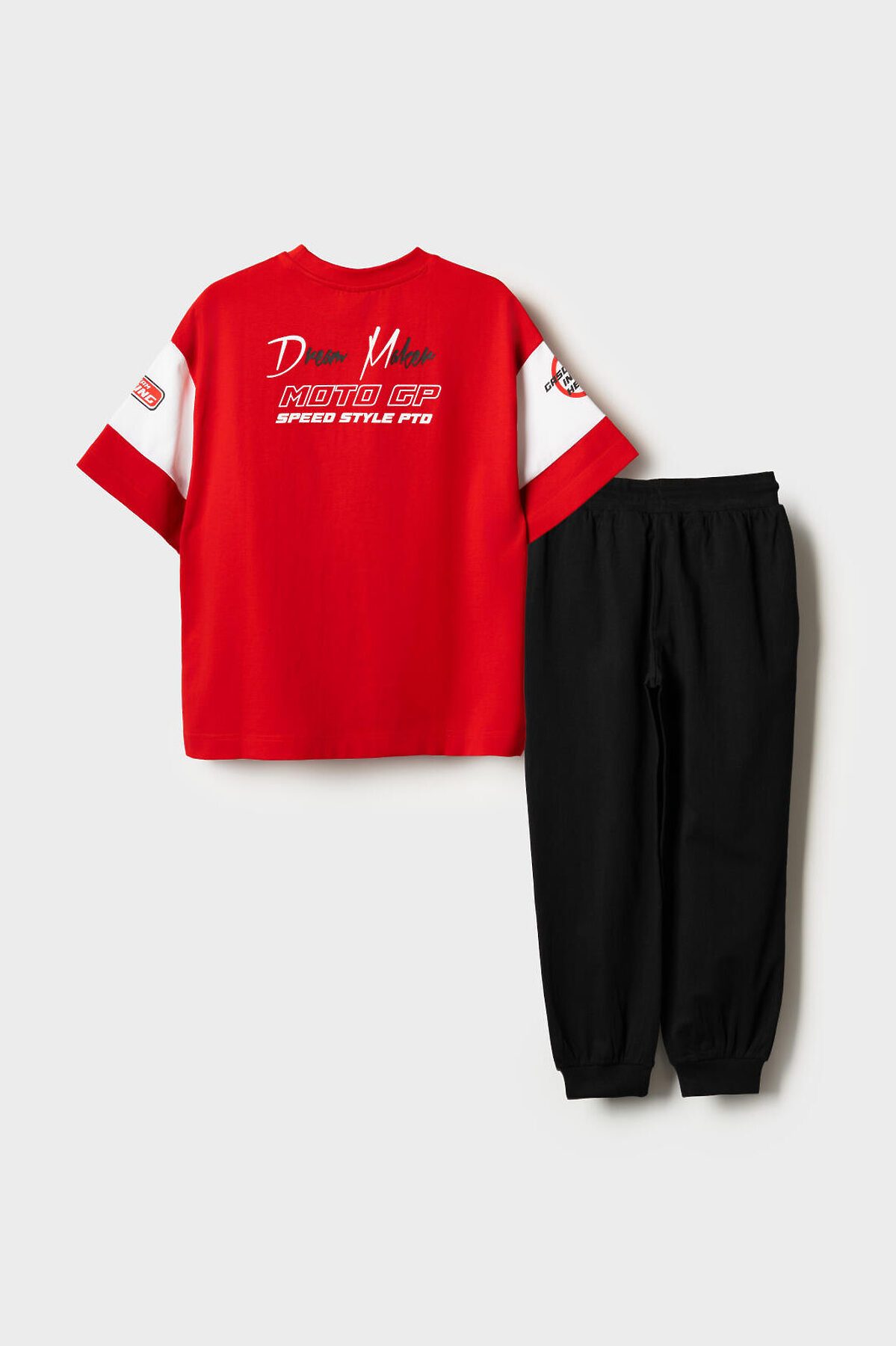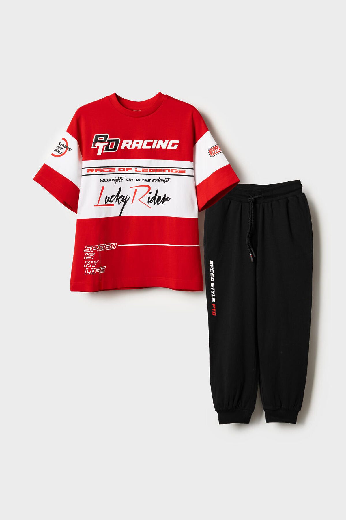 Костюм для мальчика подростка. Состоит из футболки с коротким рукавом и брюк джоггеров. Футболка оверсайз с яркими принтами в гоночной тематике. Брюки выполнены из плотного хлопкового трикотажа. Модель с комфортной посадкой, пояс на резинке дополнен шнурком. Удобные боковые карманы. Внизу — эластичные манжеты.