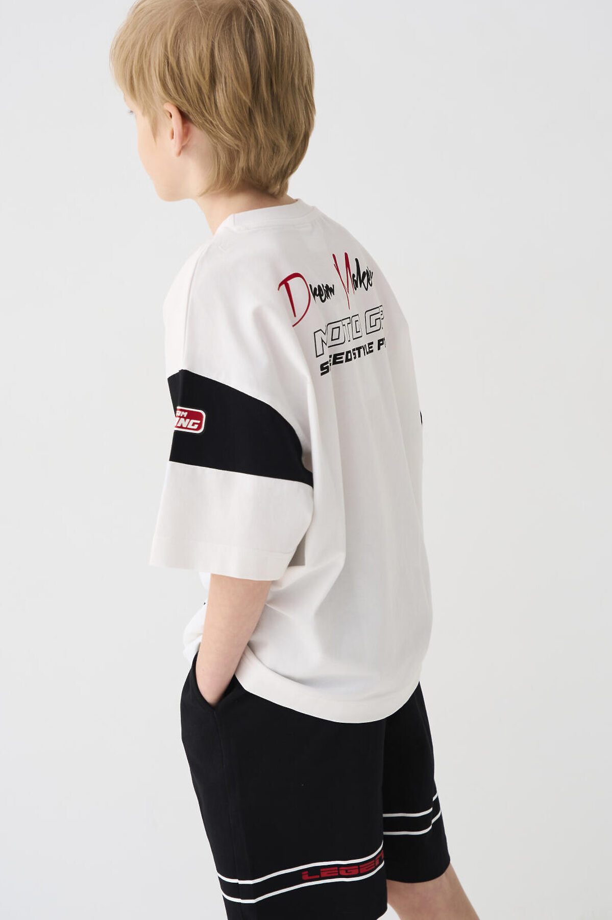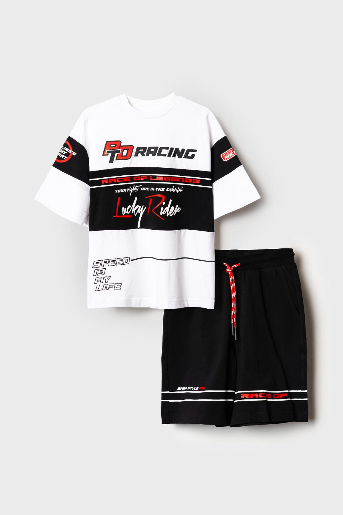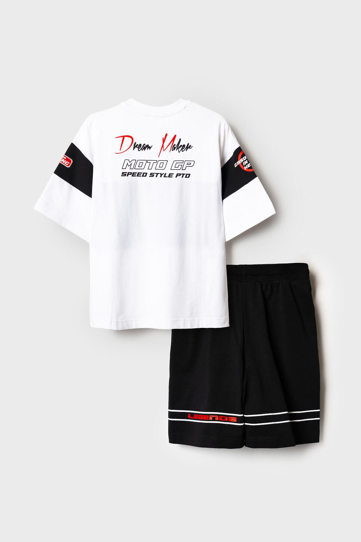 Комплект трикотажный из футболки и шорт для мальчика подростка. Костюм подходит для повседневной носки в летний сезон. Выполнен из мягкого и эластичного трикотажа с высоким содержанием хлопка. Посадка футболки — oversize, что придаёт образу актуальный расслабленный стиль. Шорты средней длины с комфортной посадкой на резинке со шнурком. Боковые карманы. Дополнительно украшены яркими принтами и декоративной отделкой.