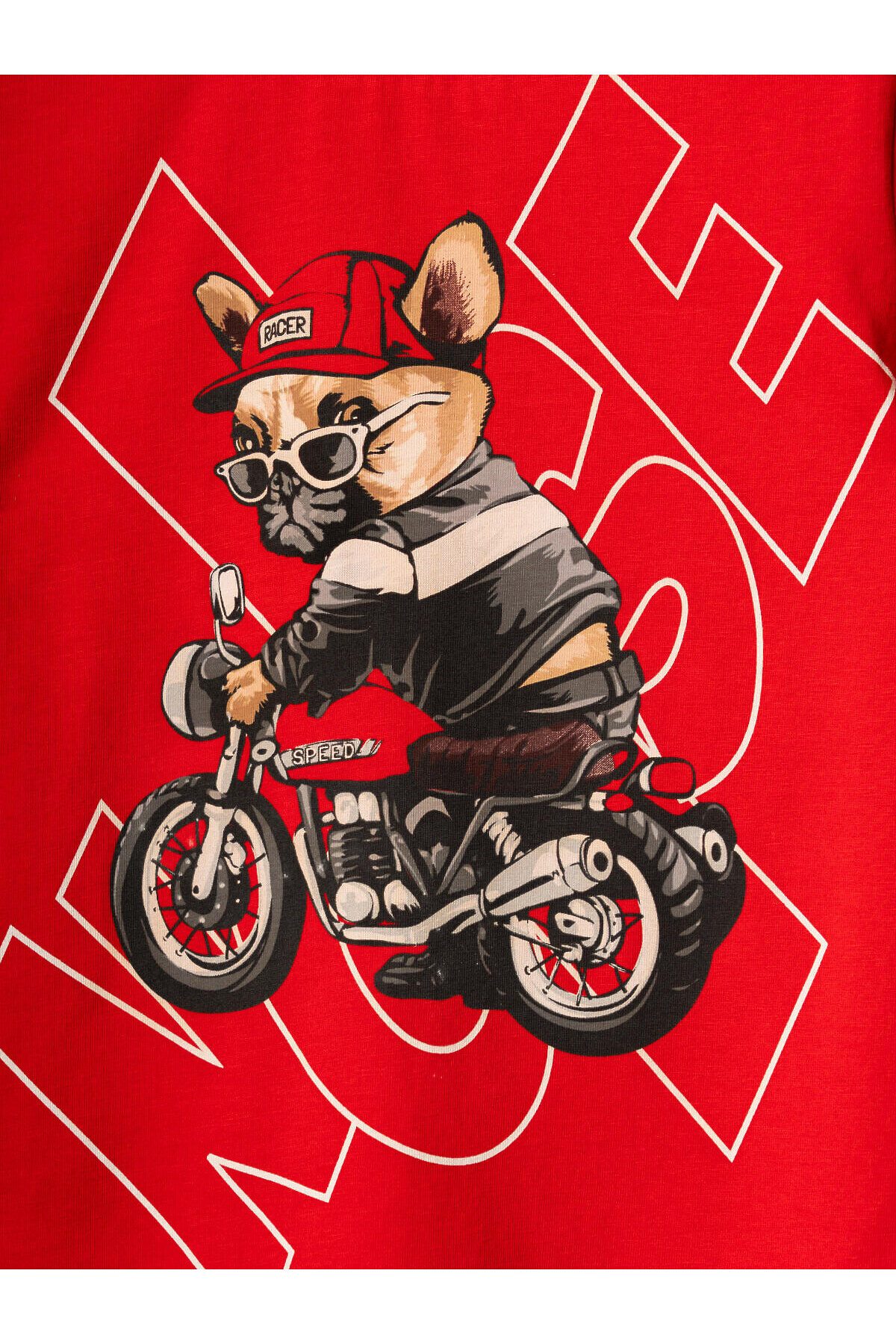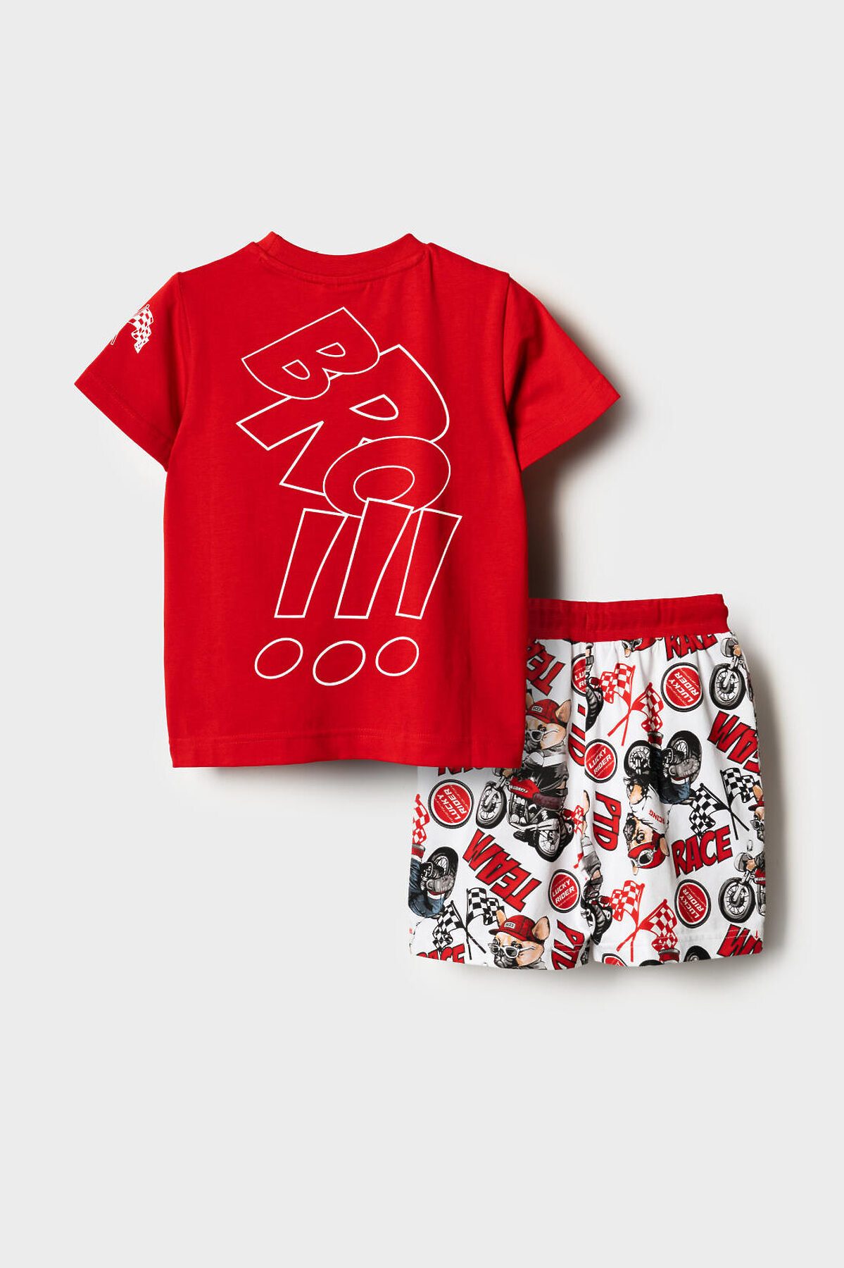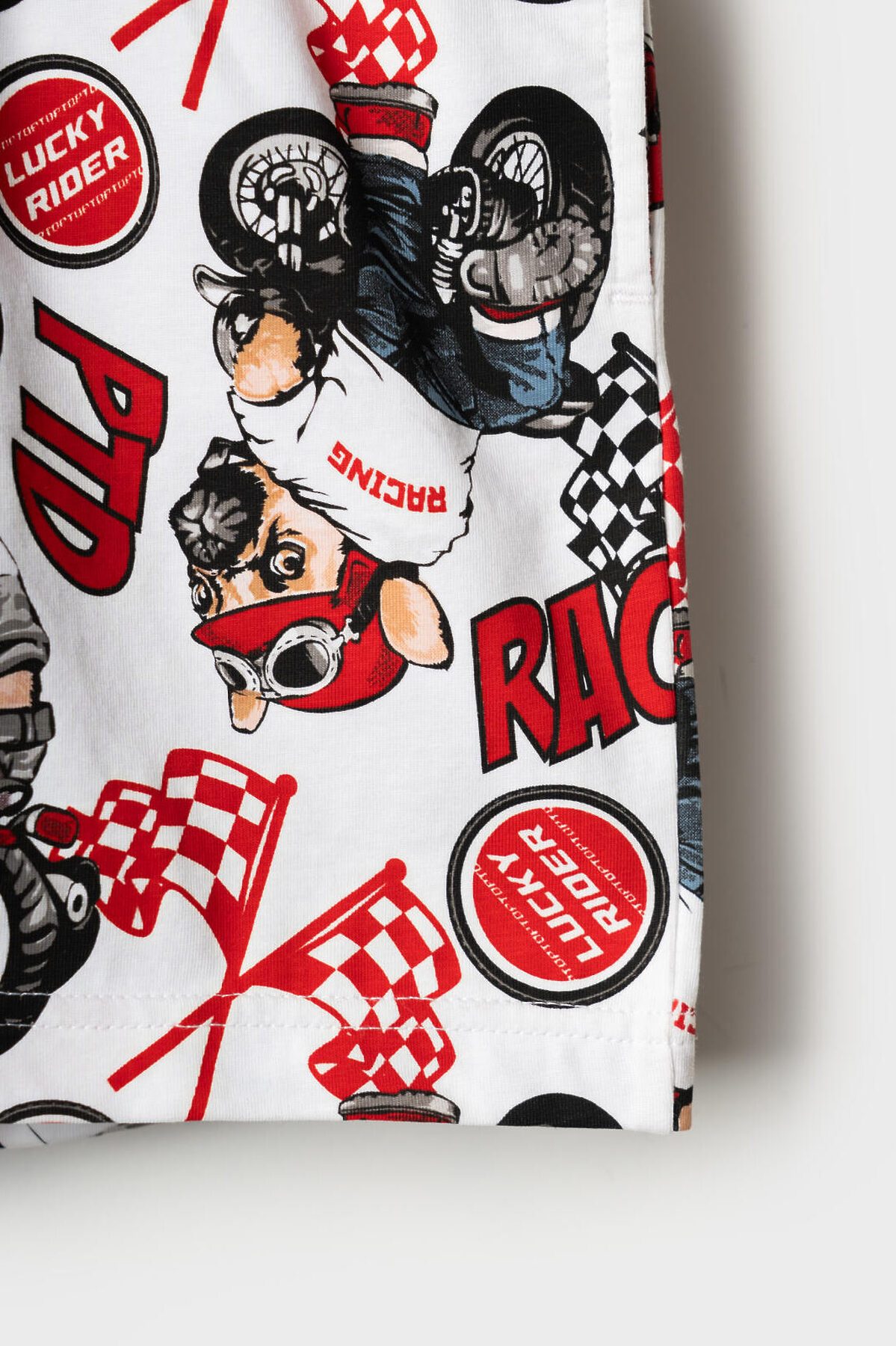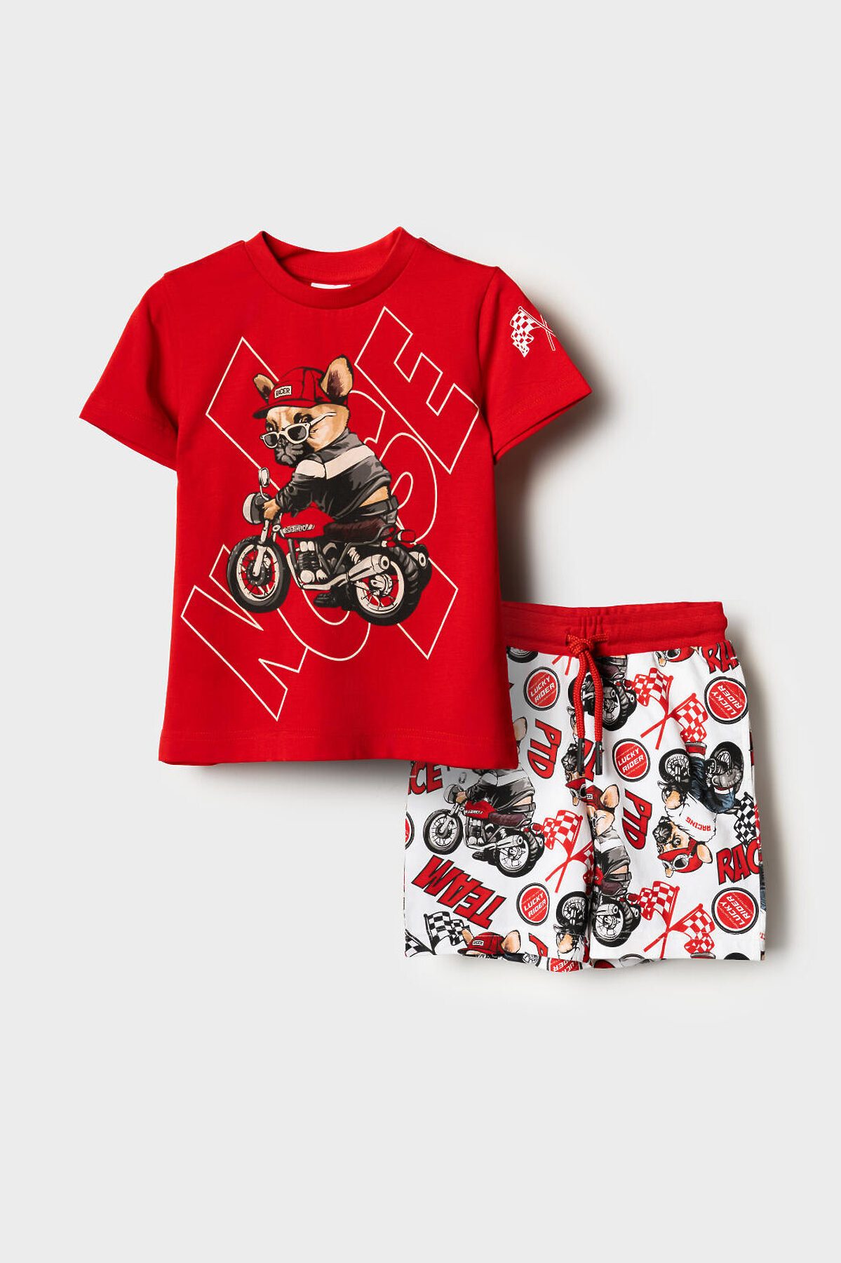 Детский костюм для мальчика. Состоит из футболки и шорт. Выполнен из хлопкового трикотажа. Футболка свободного кроя, с коротким рукавом. Яркий принт в гоночной тематике. Шорты свободные, с эластичным поясом и шнурком для регулировки посадки. По бокам расположены карманы.