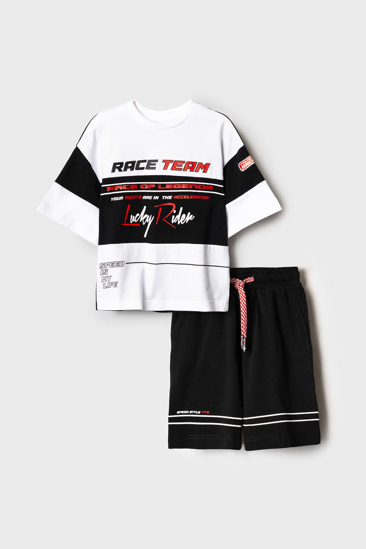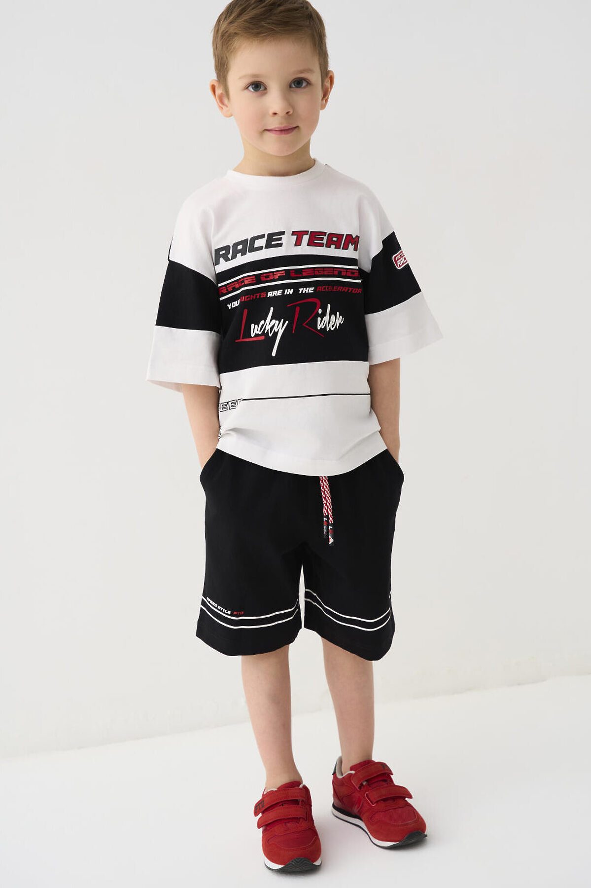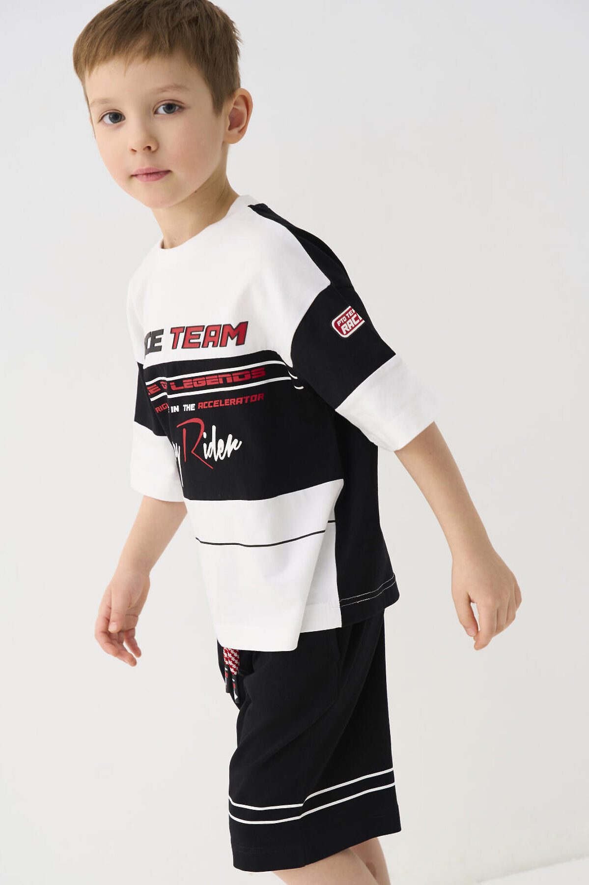 Детский костюм для мальчика. Состоит из футболки и шорт. Выполнен из хлопкового трикотажа. Футболка оверсайз, с коротким рукавом. Яркий принт и нашивки в гоночной тематике. Шорты свободные, с эластичным поясом и шнурком для регулировки посадки. По бокам расположены карманы.