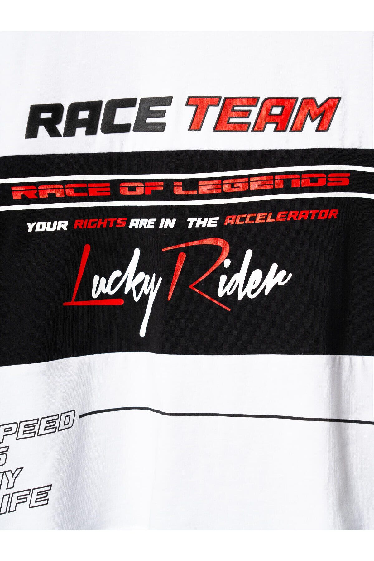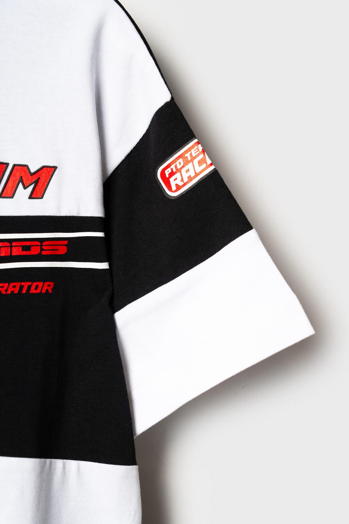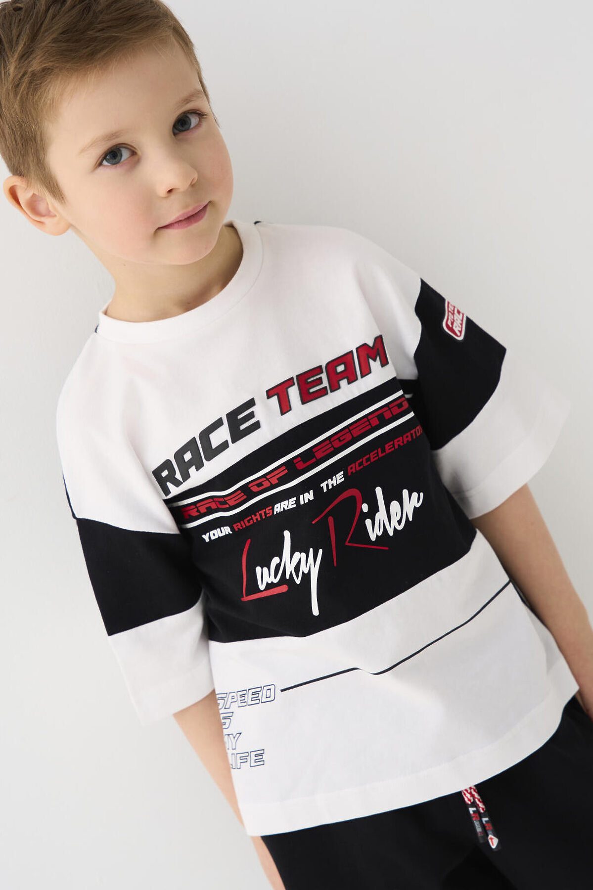Детский костюм для мальчика. Состоит из футболки и шорт. Выполнен из хлопкового трикотажа. Футболка оверсайз, с коротким рукавом. Яркий принт и нашивки в гоночной тематике. Шорты свободные, с эластичным поясом и шнурком для регулировки посадки. По бокам расположены карманы.