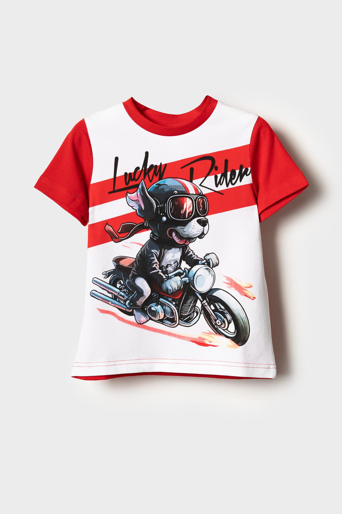 Детская футболка для мальчика. Модель прямого кроя, выполнена из эластичного хлопкового трикотажа джерси. Спереди расположен крупный принт в гоночной тематике. Горловина круглая, обработана эластичным рибом.