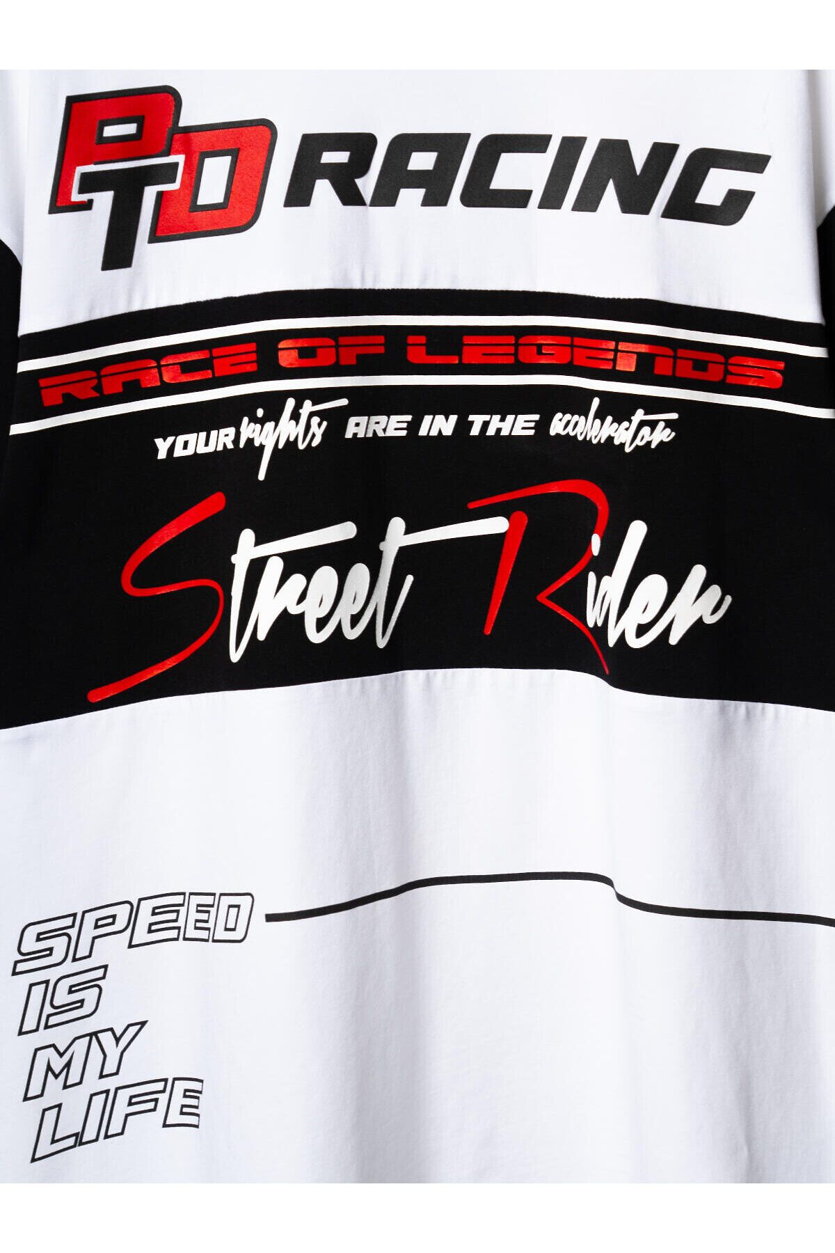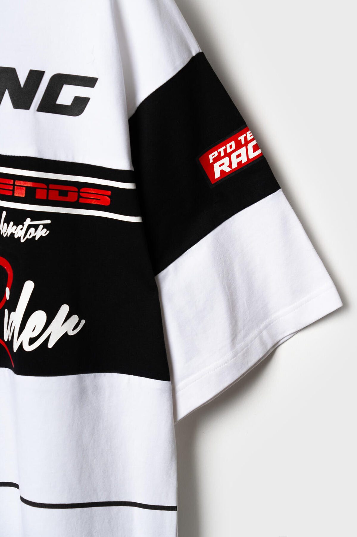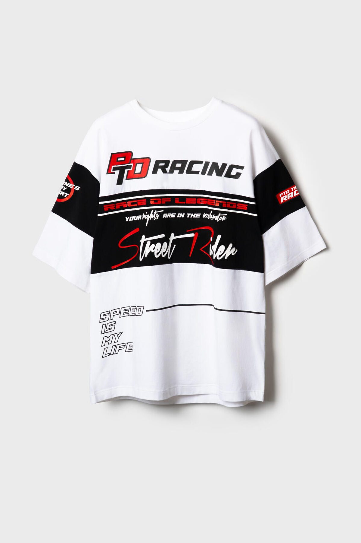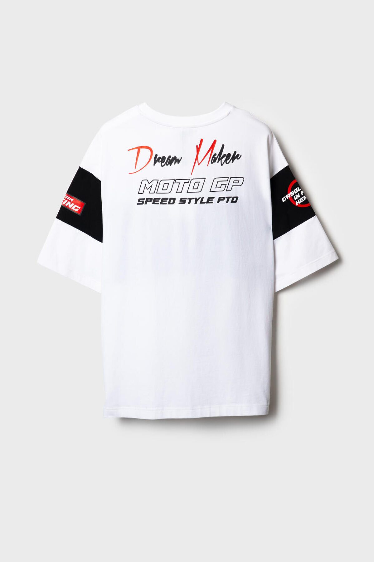 Мужская футболка оверсайз. Модель выполнена из эластичного хлопкового трикотажа джерси. Принты в гоночной тематике. Горловина обработана эластичным рибом. На рукаве декоративная нашивка.