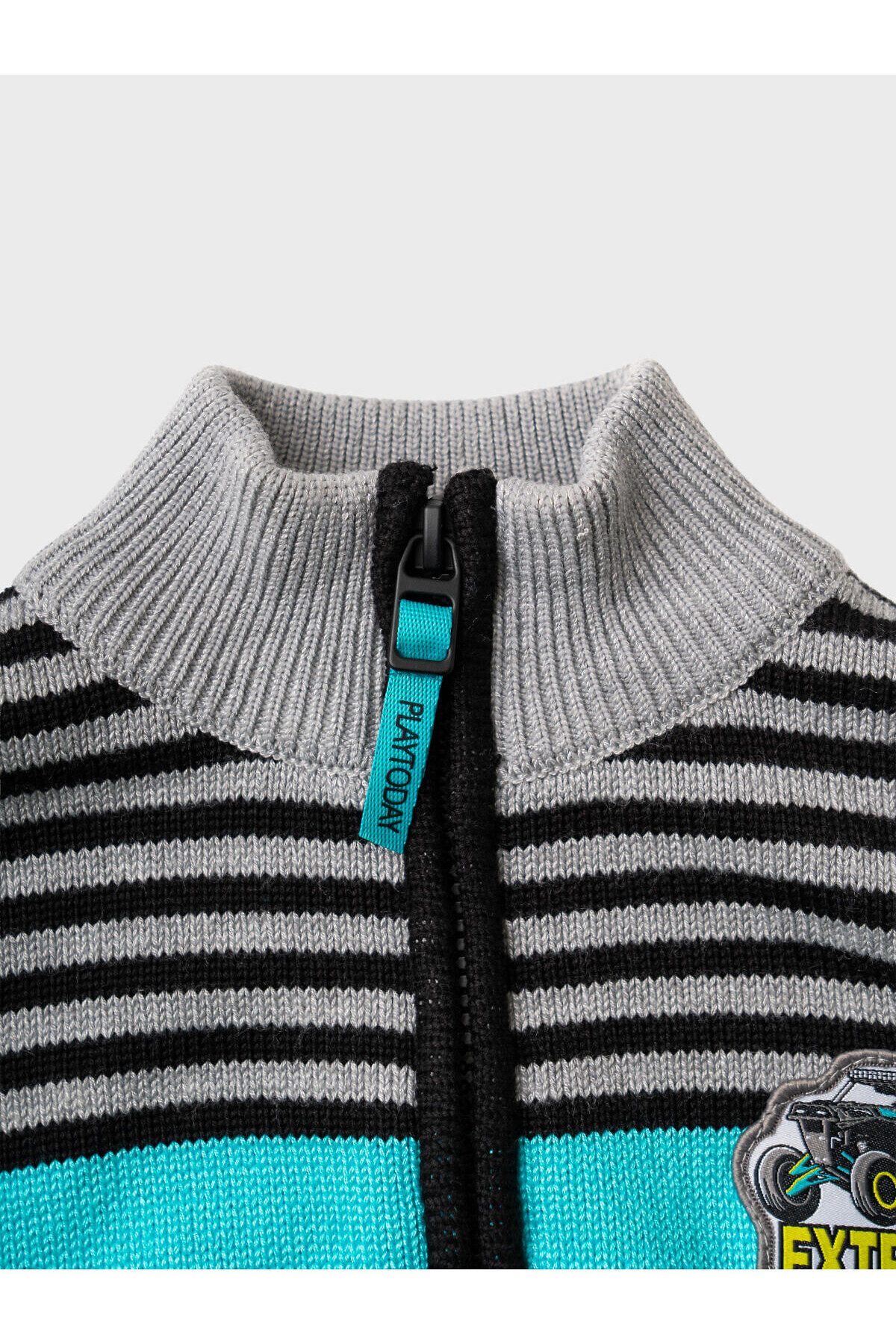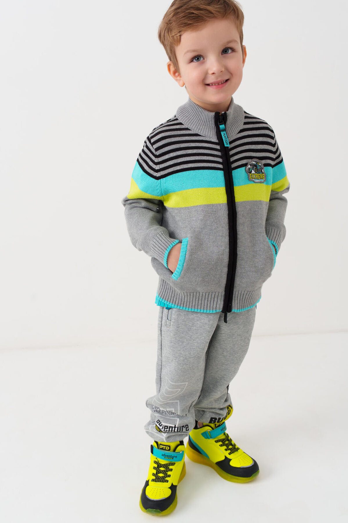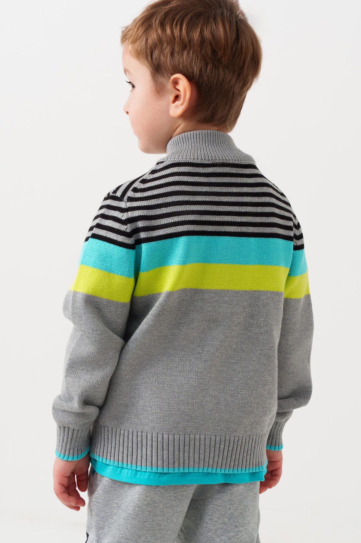 Детский кардиган на молнии для мальчика. Модель из вязаного трикотажа. Дизайн в стиле колорблок. На груди — декоративная нашивка. Два боковых кармана. Воротник-стойка, манжеты и низ изделия выполнены из плотного риба.