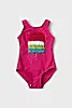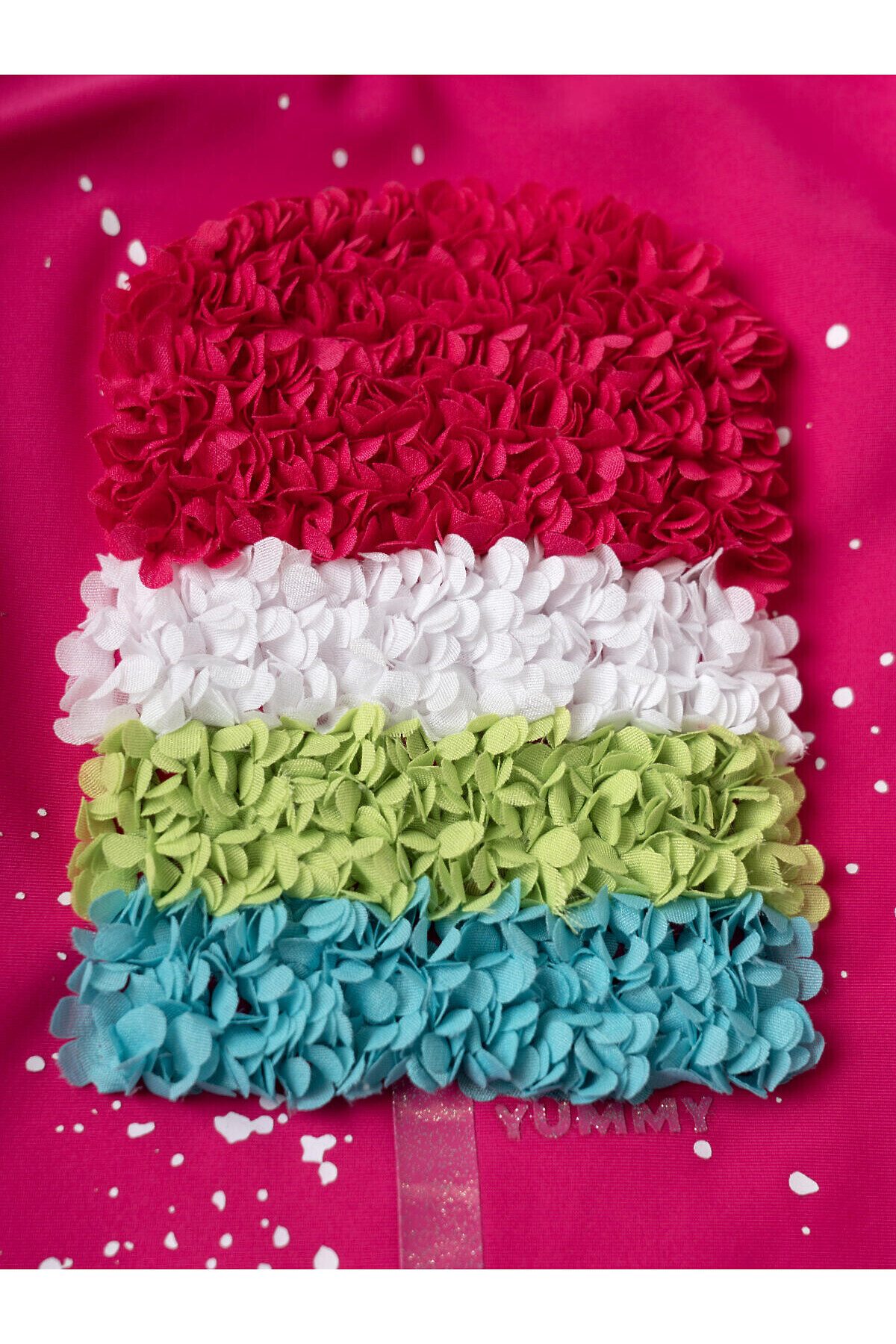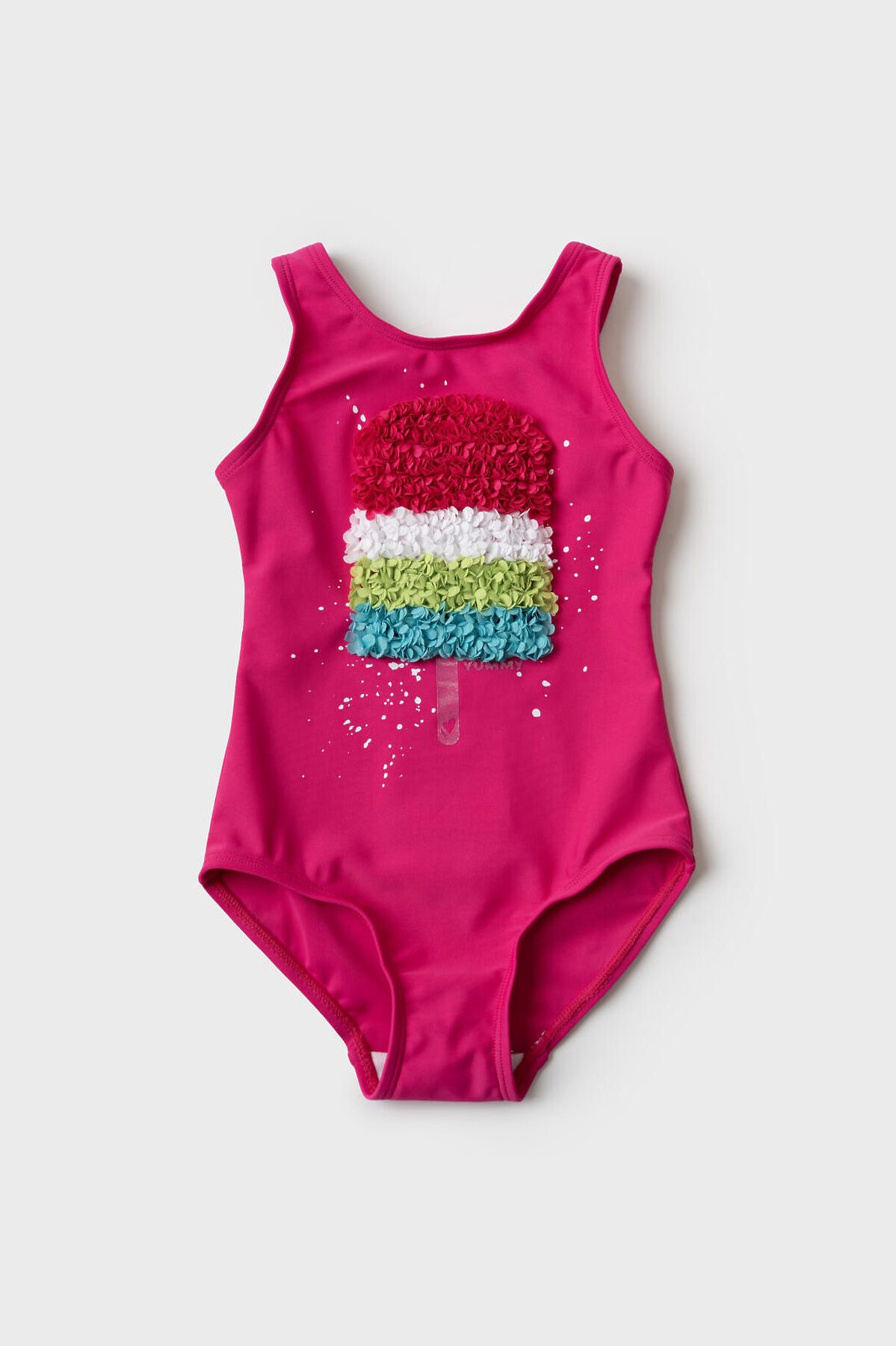 Слитный детский купальник для девочки, выполнен в насыщенном розовом цвете. Модель с широкой проймой и закрытой спинкой, на которой есть поперечная резинка для удобной посадки. Главный акцент – цветное мороженое из оборок на груди, выполненное в технике аппликации и печати. Купальник имеет подкладку. Все края обработаны эластичной тесьмой, чтобы изделие хорошо сидело на теле и не натирало. Благодаря UF-защите, ткань сохраняет первоначальный вид даже при длительном пребывании на солнце. Подходит для пляжа и бассейна.