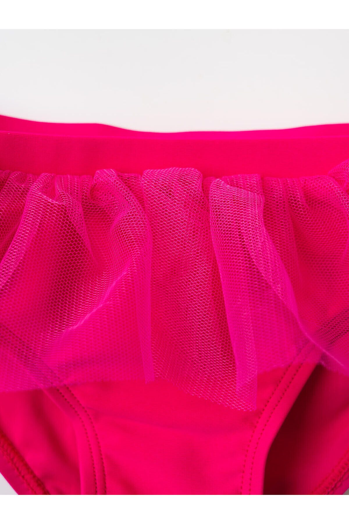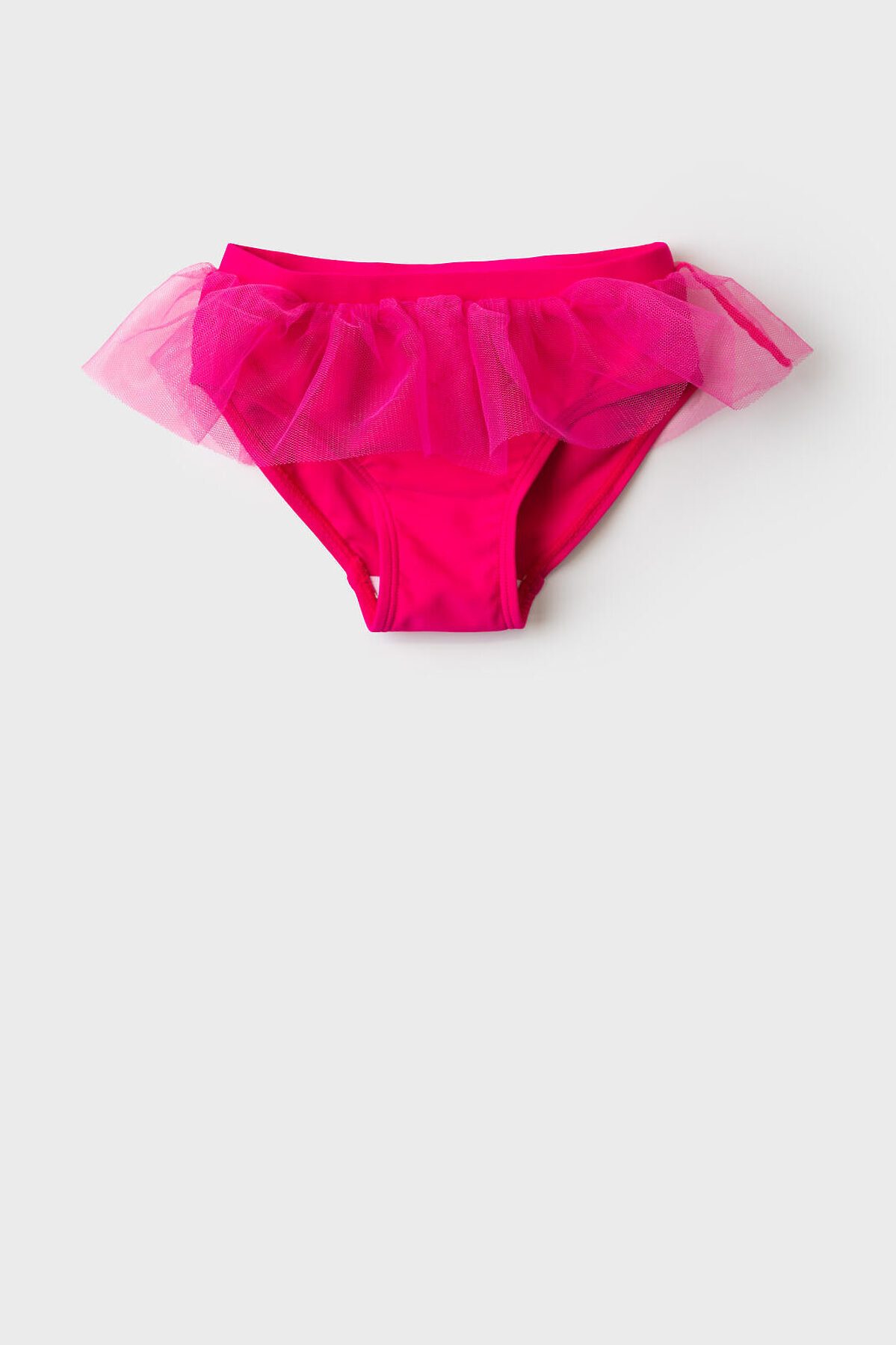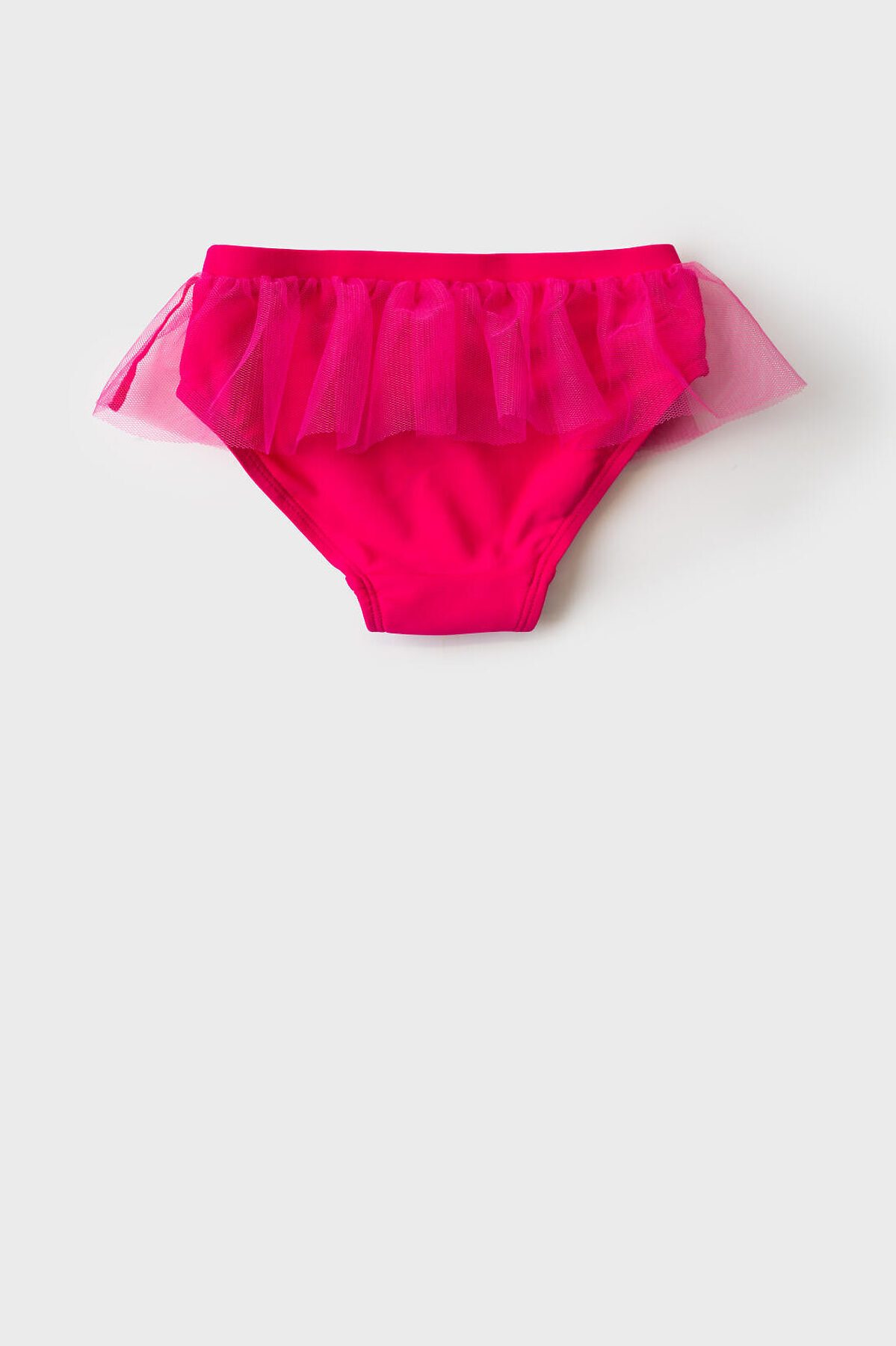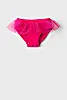 Детские купальные плавки для девочки. Модель ярко-розового цвета с широкой декоративной оборкой по поясу. Оборка сделана из легкого полупрозрачного материала, что придает модели нарядный вид. Внутри предусмотрена подкладка. Все края обработаны эластичной тесьмой, чтобы изделие хорошо сидело на теле и не натирало. Благодаря UF-защите, ткань сохраняет первоначальный вид даже при длительном пребывании на солнце. Подходит для плавания и активного отдыха.