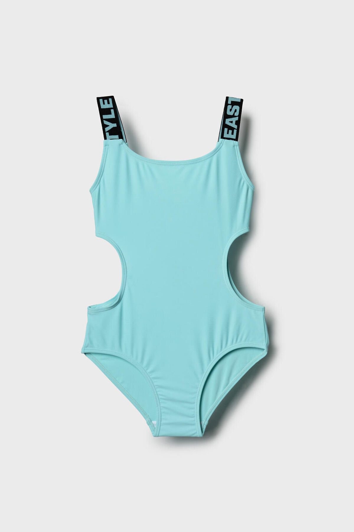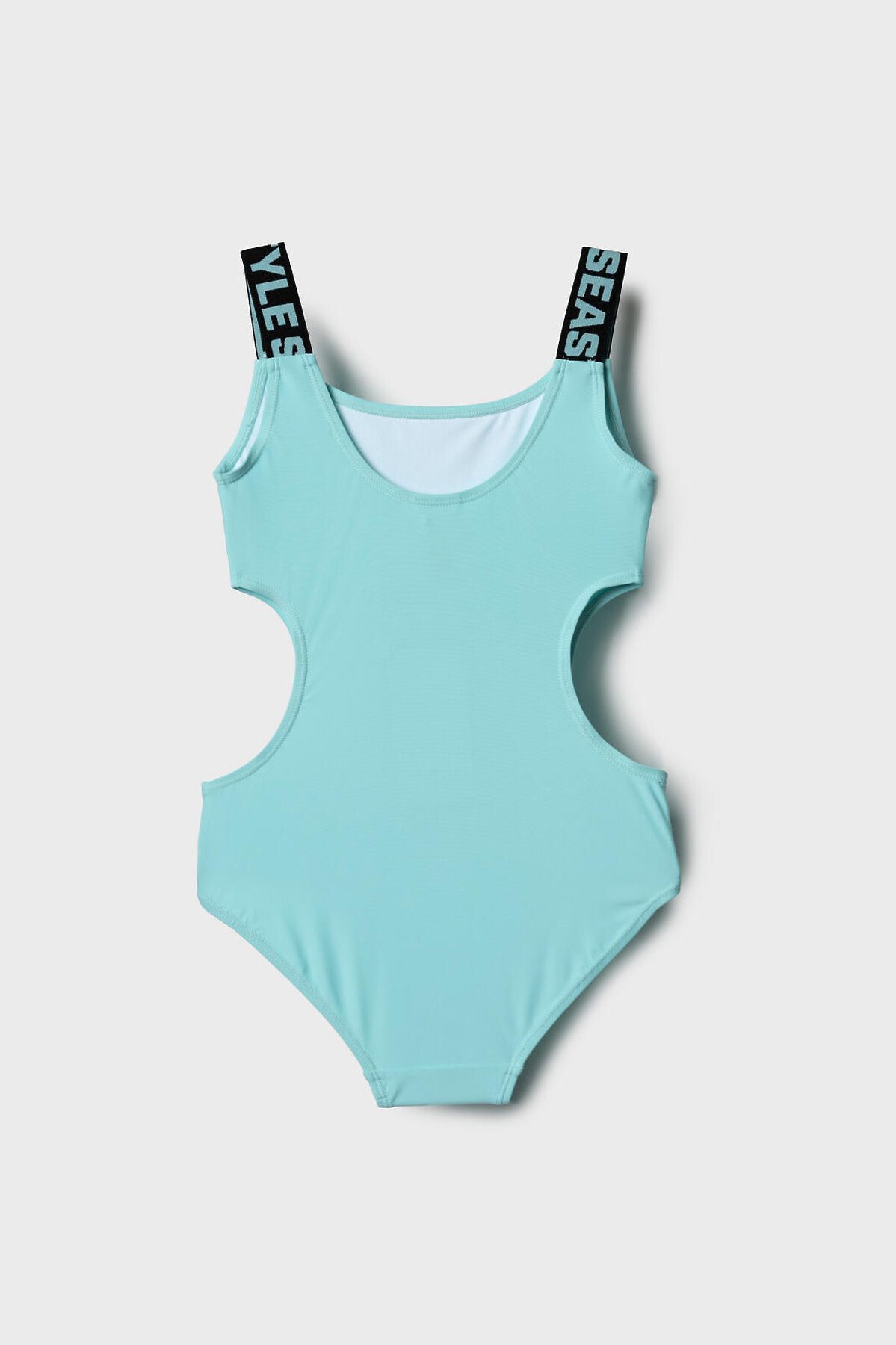 Слитный купальник для девочки подростка. Модель выполнена в модном дизайне с фигурными вырезами по бокам и глубоким овальным вырезом на спинке. Бретели украшены жаккардовой тесьмой с надписями. Купальник пошит из эластичного мятного трикотажа с белой подкладкой. Внутри — съёмные чашки и гигиеническая вставка. Все срезы обработаны мягкой эластичной лентой для комфортной посадки. Благодаря UF-защите, ткань сохраняет первоначальный вид даже при длительном пребывании на солнце. Подходит для плавания и активного отдыха.