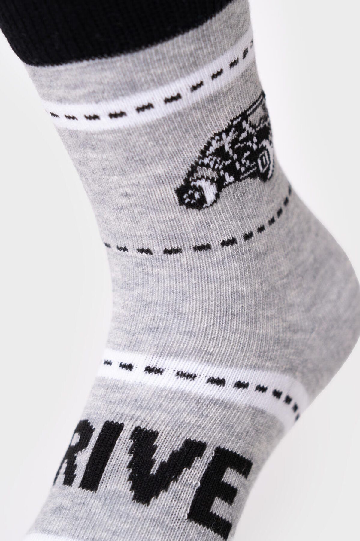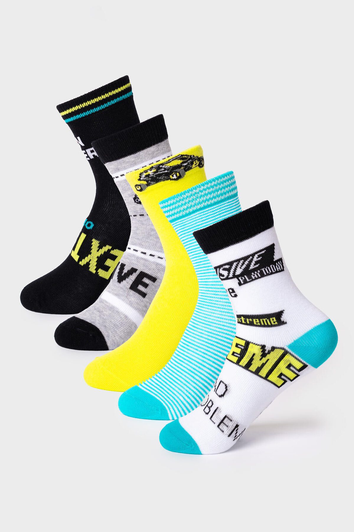 Набор из пяти пар детских носков для мальчика. В комплект входят модели с полосками, однотонные и с изображением машин. Удобная резинка не сдавливает ногу, а на стопе — аккуратная жаккардовая надпись с размером. Материал — мягкий хлопковый трикотаж.