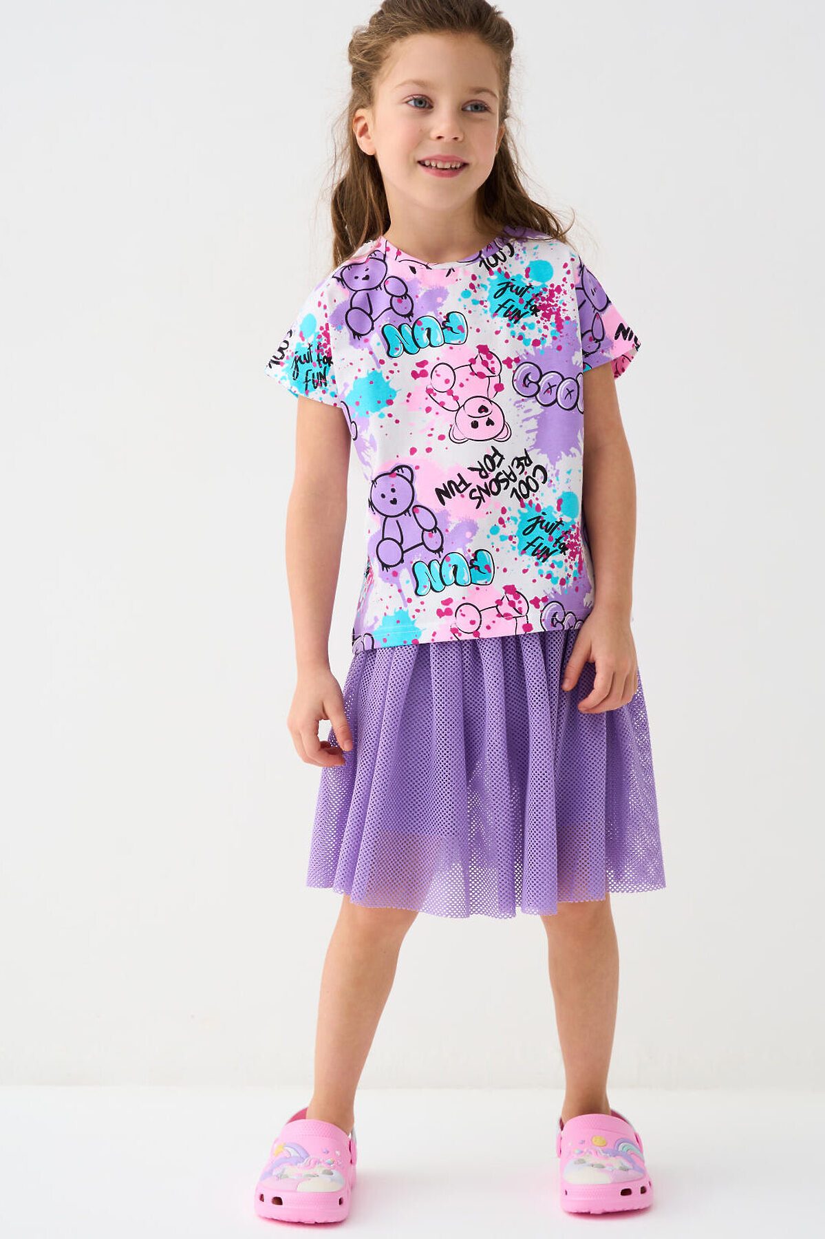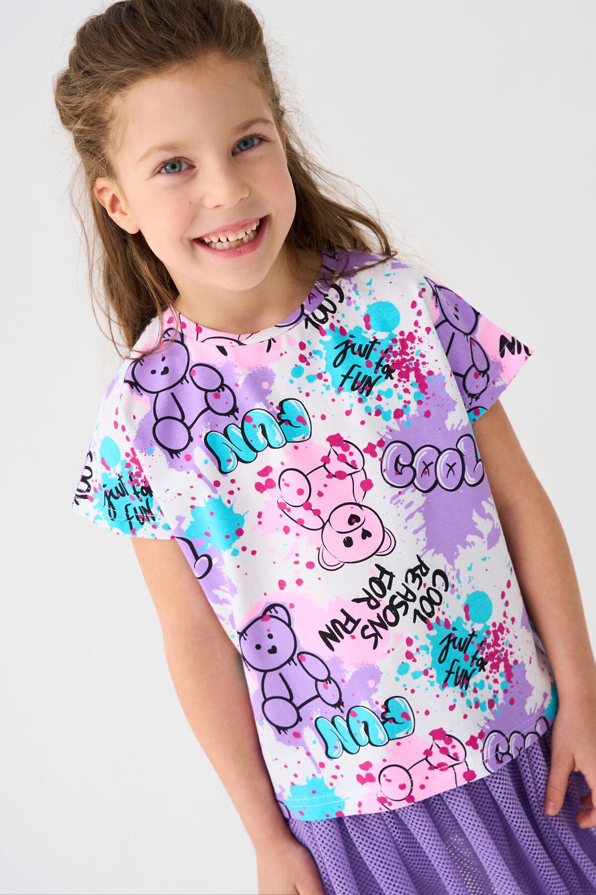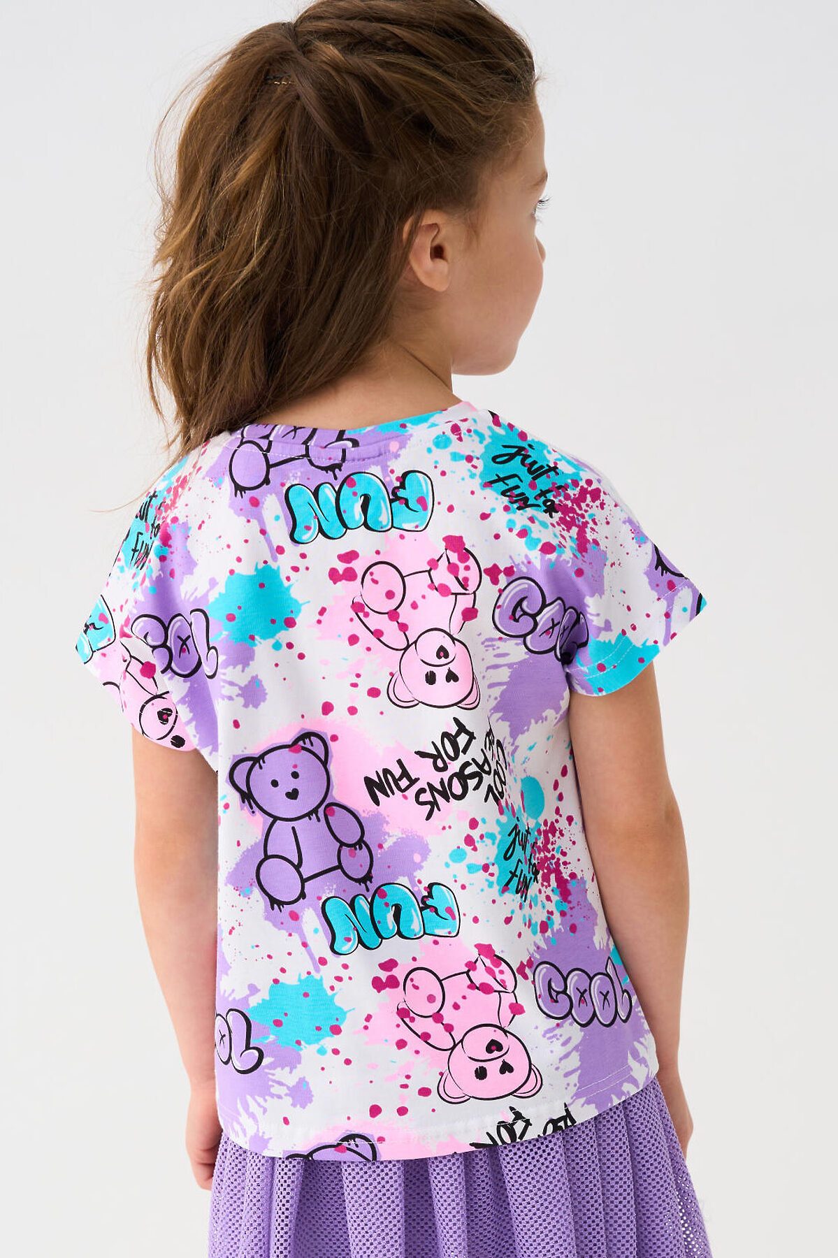 Детская футболка для девочки. Модель прямого кроя, выполнена из эластичного хлопкового трикотажа джерси. Красочный принт с милыми мишками. Горловина круглая.
