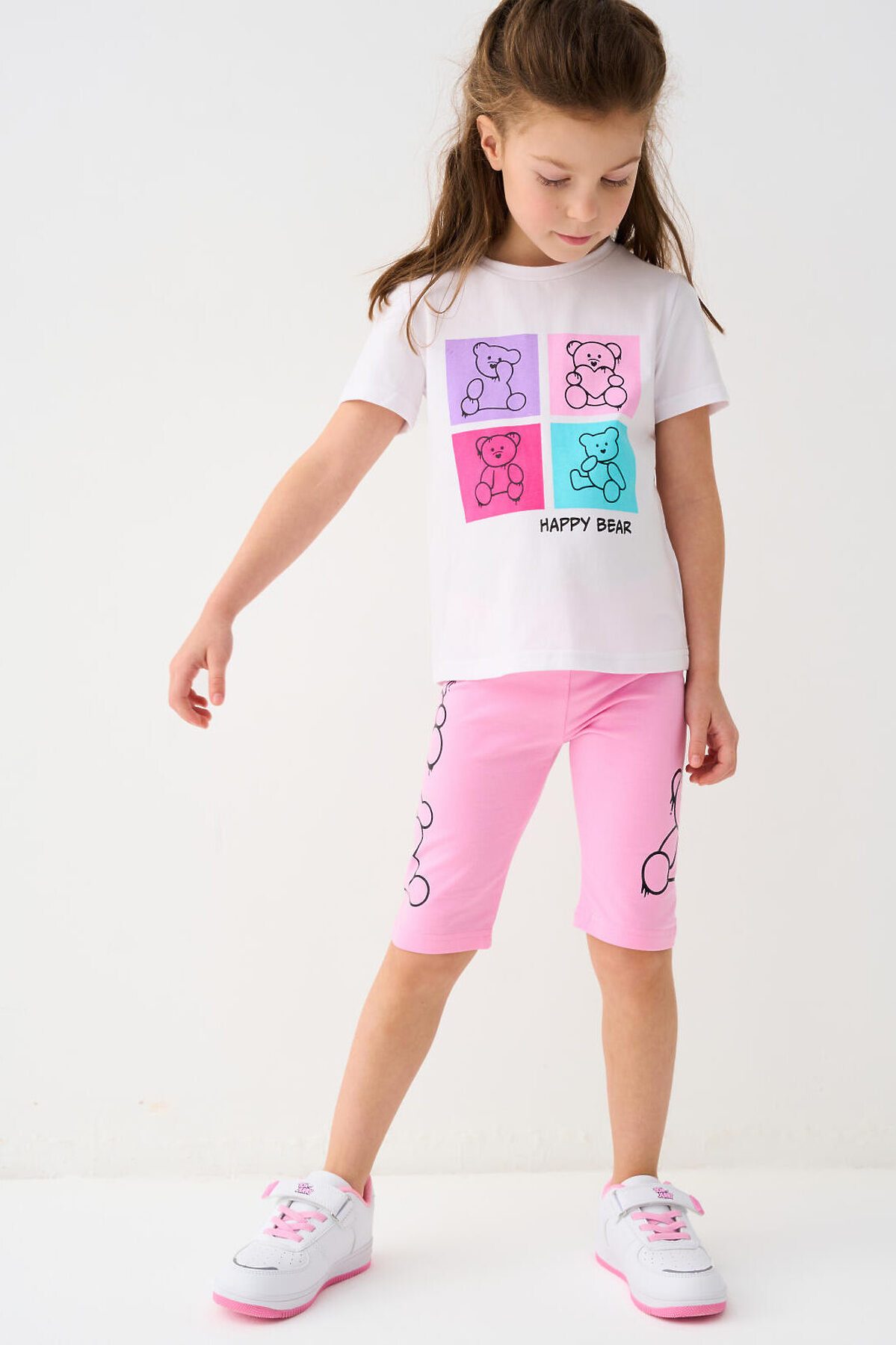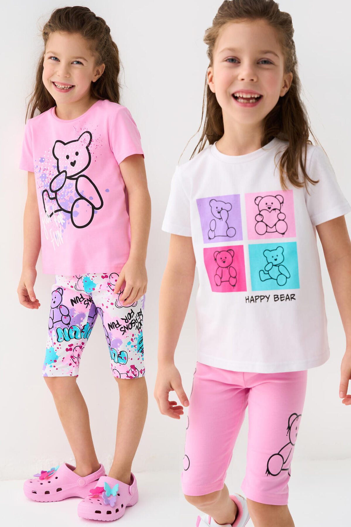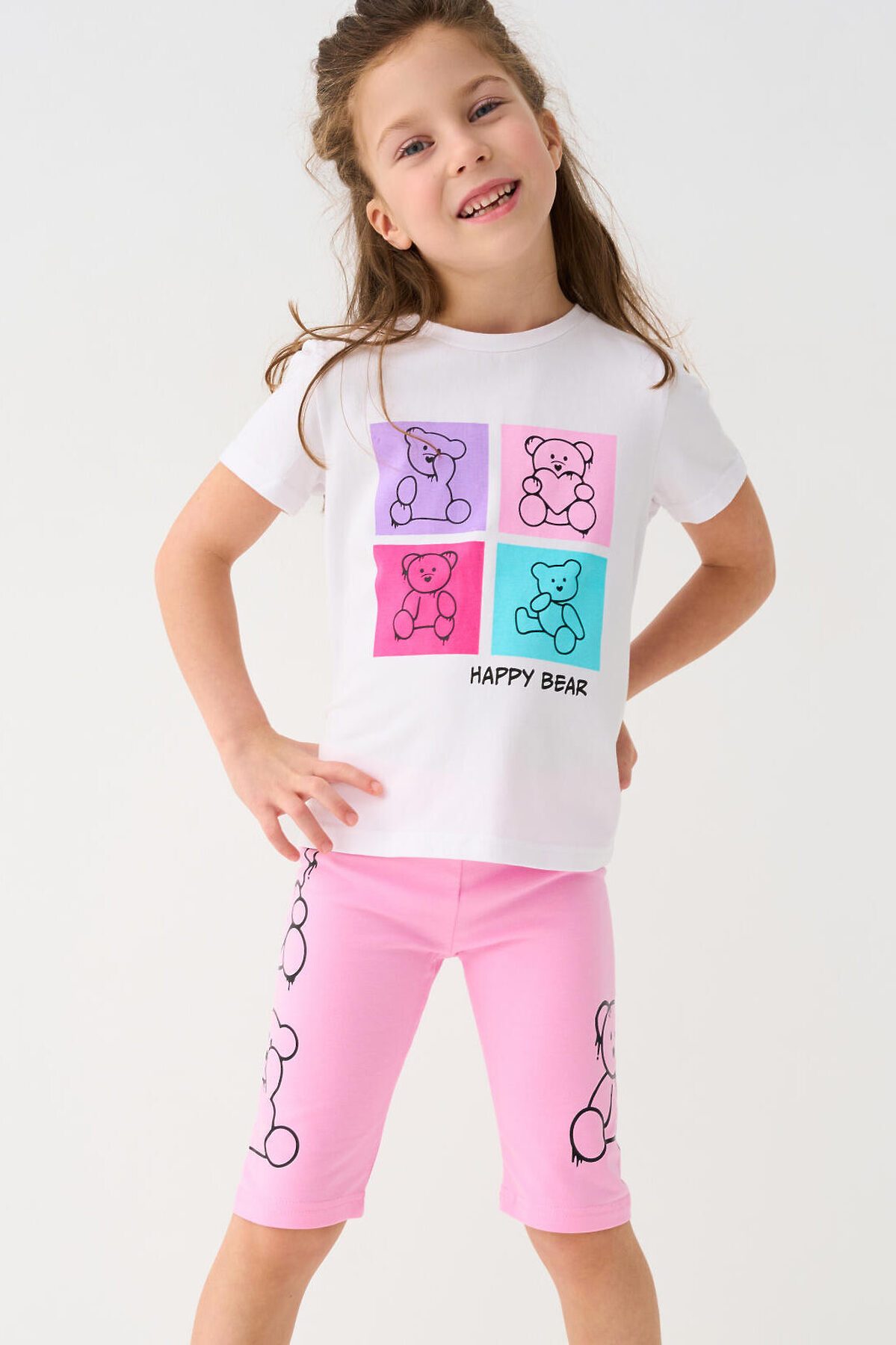 Набор детских легинсов для девочки. Комплект состоит из двух пар укороченных легинсов. Первая пара выполнена в розовом цвете, вторая — с ярким принтом с медведями. Обе модели имеют высокую посадку и эластичный пояс, который хорошо фиксирует изделие на талии. Материал - мягкий, хлопковый трикотаж.