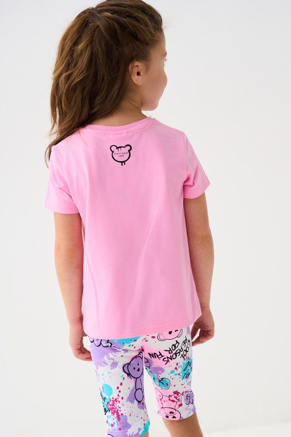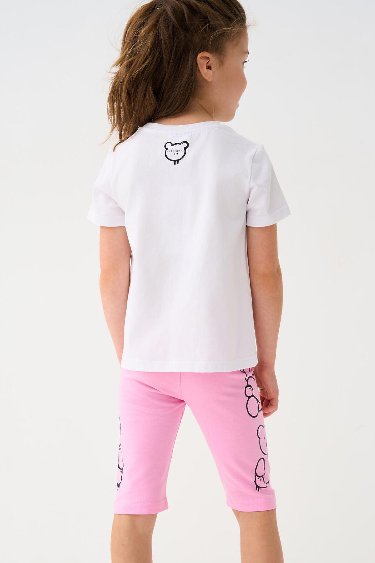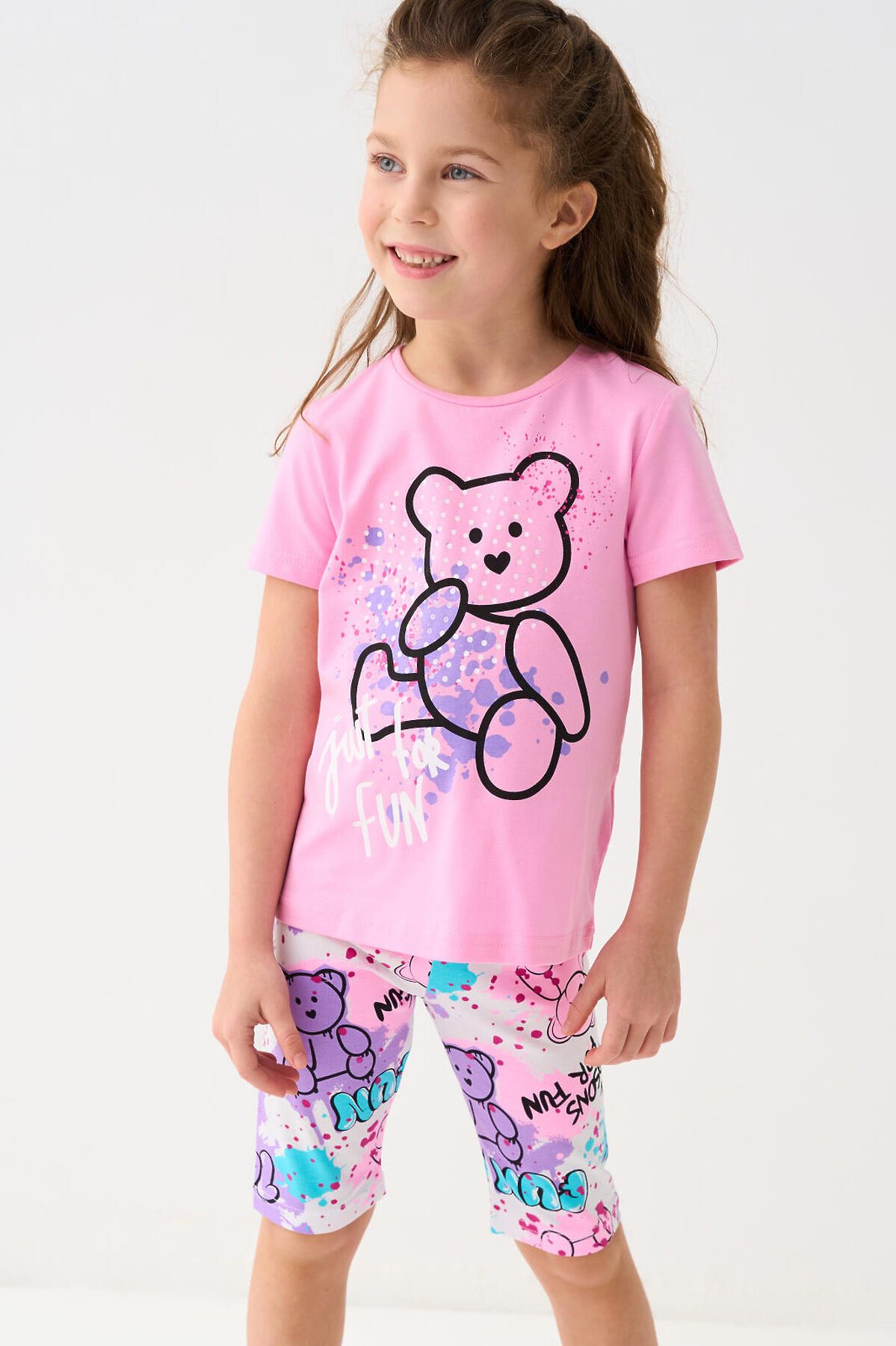 Набор детских легинсов для девочки. Комплект состоит из двух пар укороченных легинсов. Первая пара выполнена в розовом цвете, вторая — с ярким принтом с медведями. Обе модели имеют высокую посадку и эластичный пояс, который хорошо фиксирует изделие на талии. Материал - мягкий, хлопковый трикотаж.