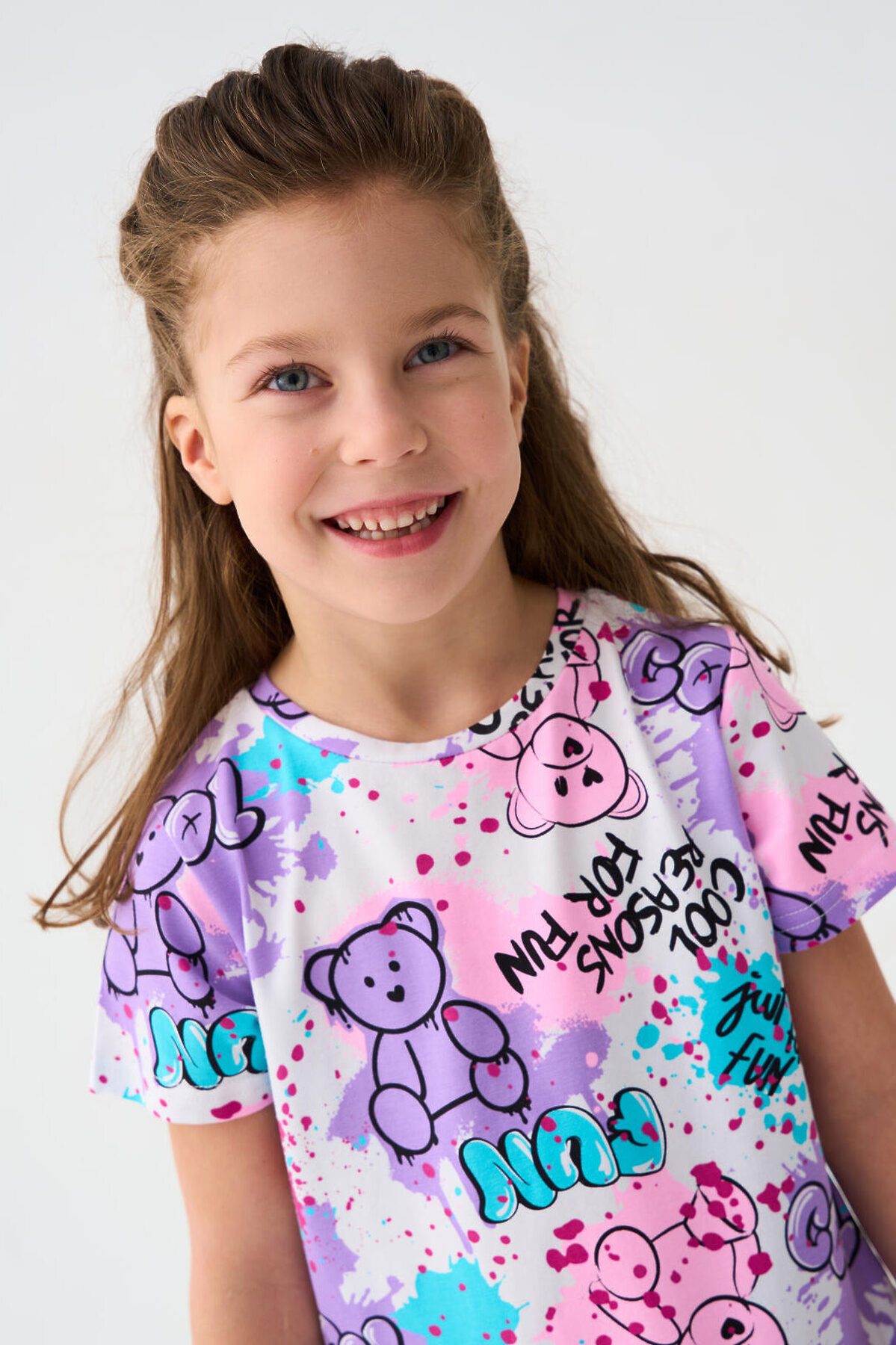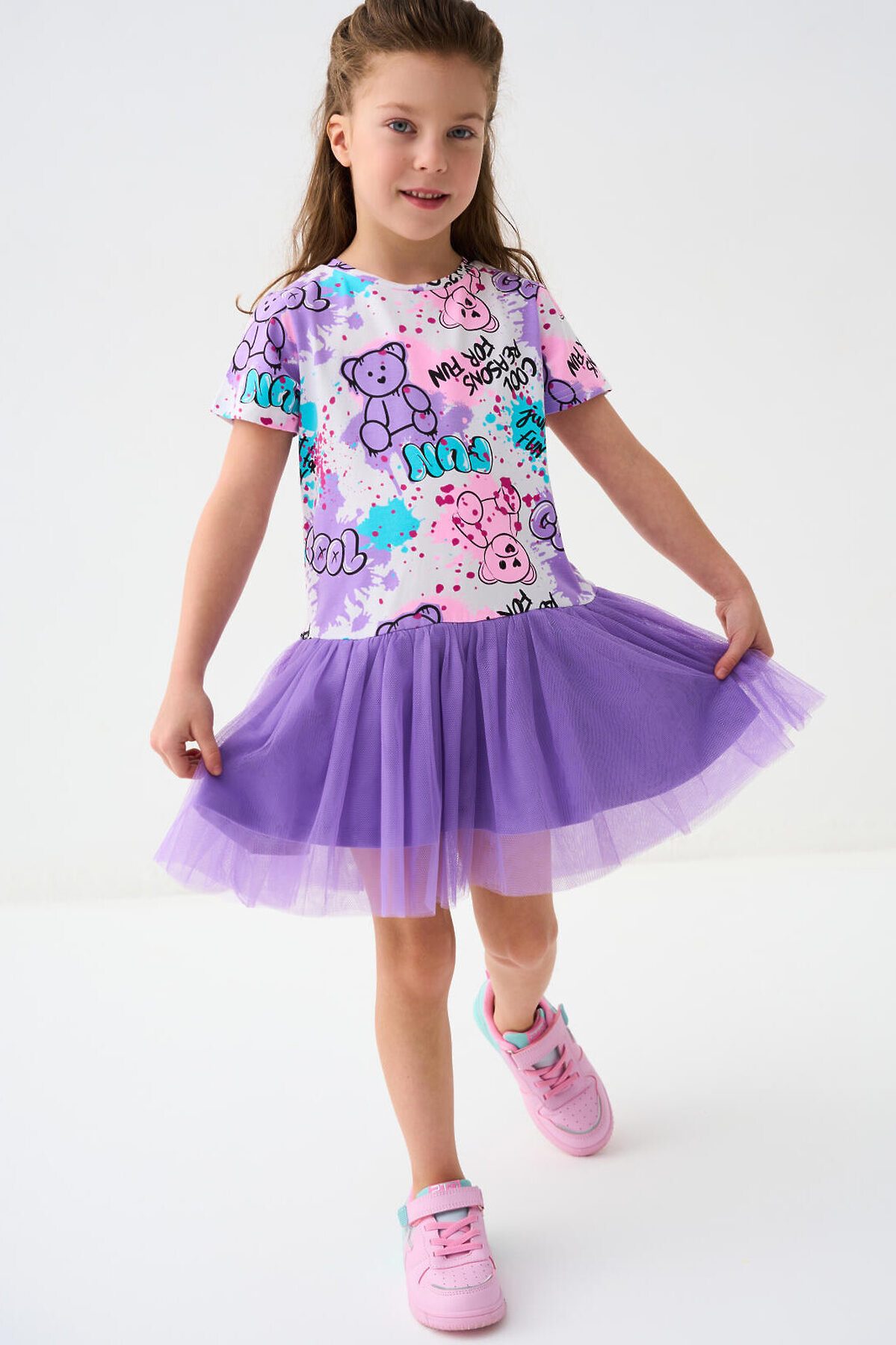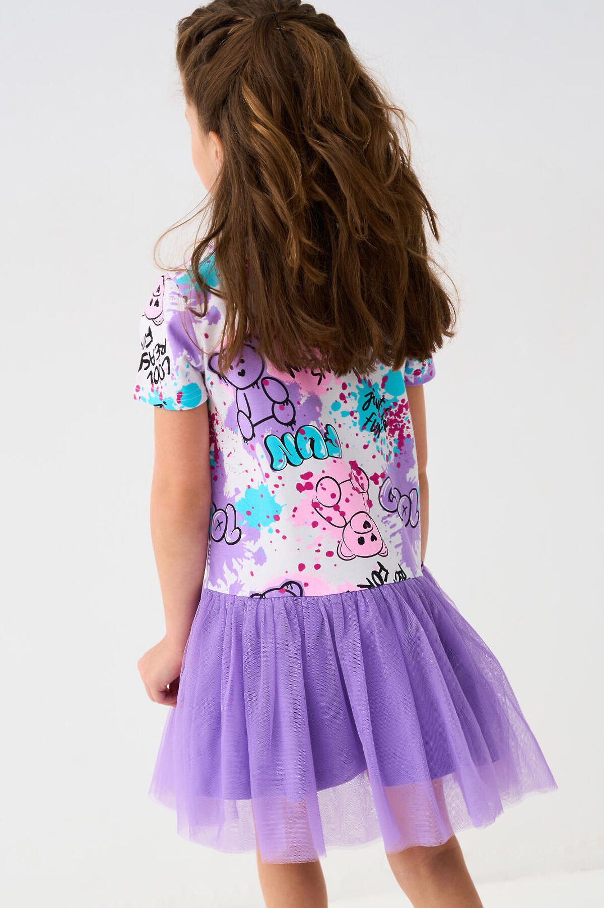 Легкое детское платье для девочки. Модель из комбинации хлопкового трикотажа джерси и сетки. Верх выполнен в виде футболки и украшен ярким принтом в стиле граффити. Пышная юбка из сетки придаёт изделию нарядный вид.