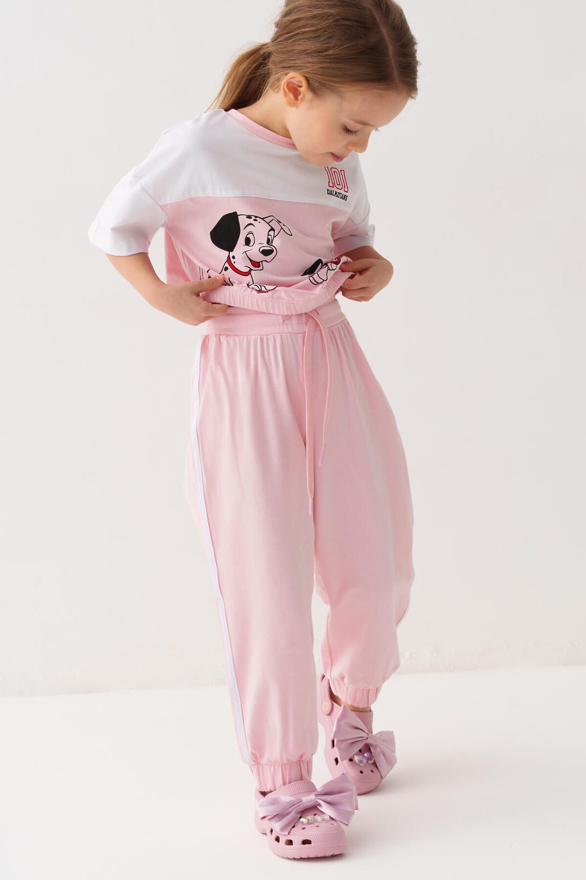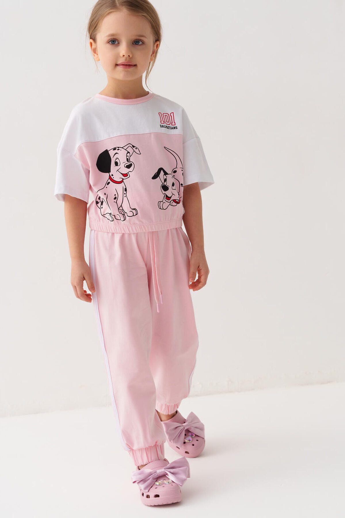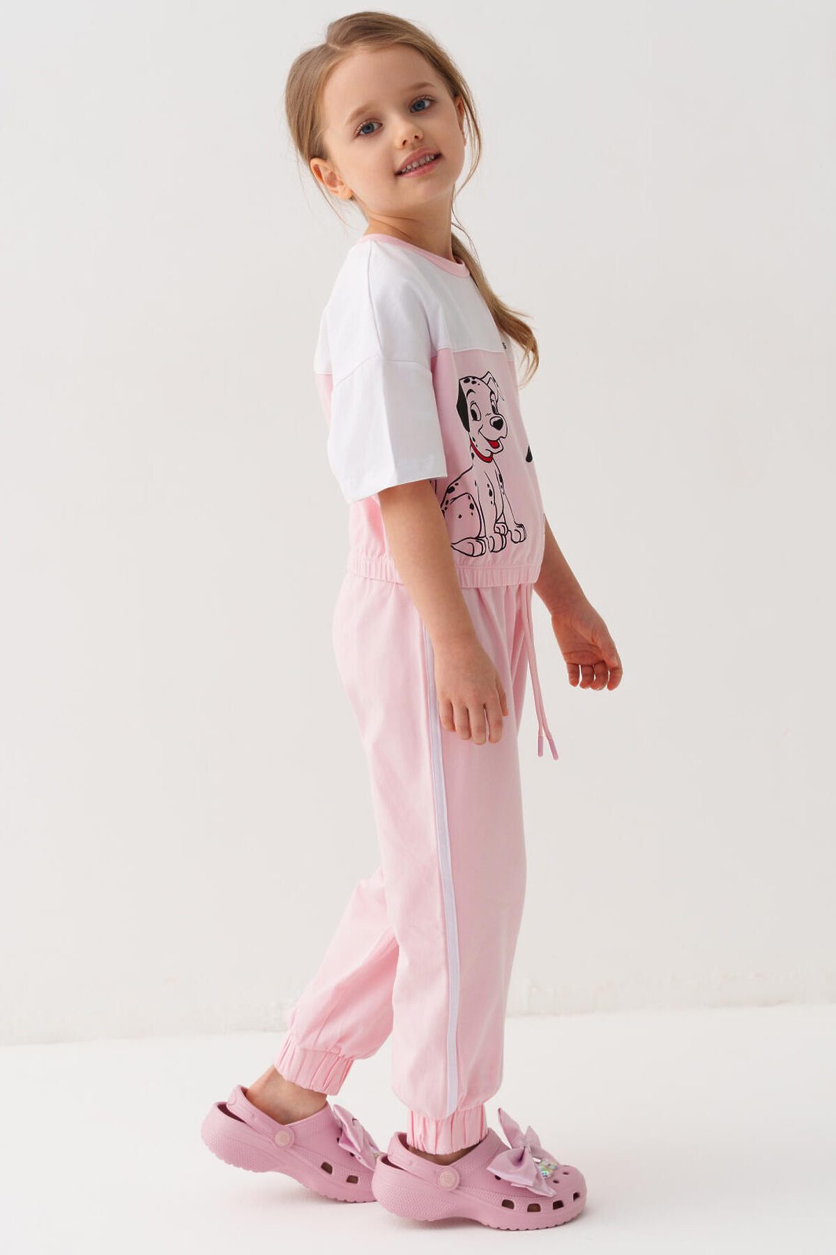 Детский комплект для девочки. Состоит из футболки оверсайз и брюк джоггеров. Выполнен из хлопкового трикотажа. Футболка свободного силуэта, с короткими рукавами и резинкой по низу. Украшена крупным красочным принтом с любимым мультяшным персонажем "101 далматинец". Брюки — джоггеры, со средней посадкой и эластичным поясом и шнурком для регулировки.