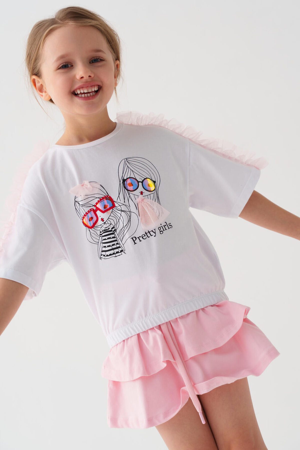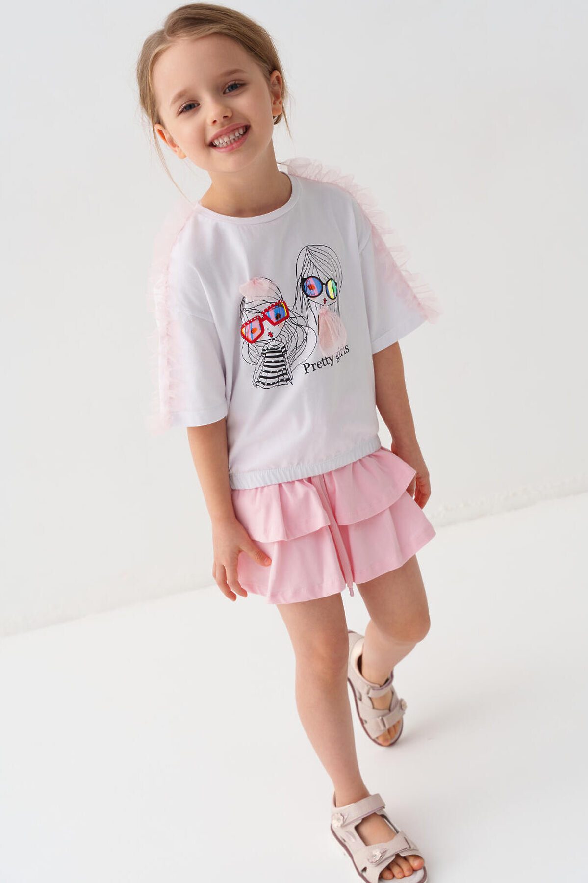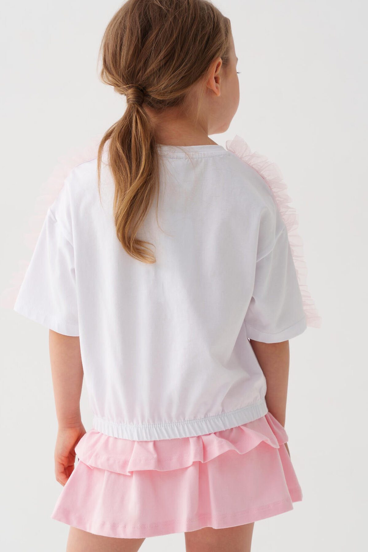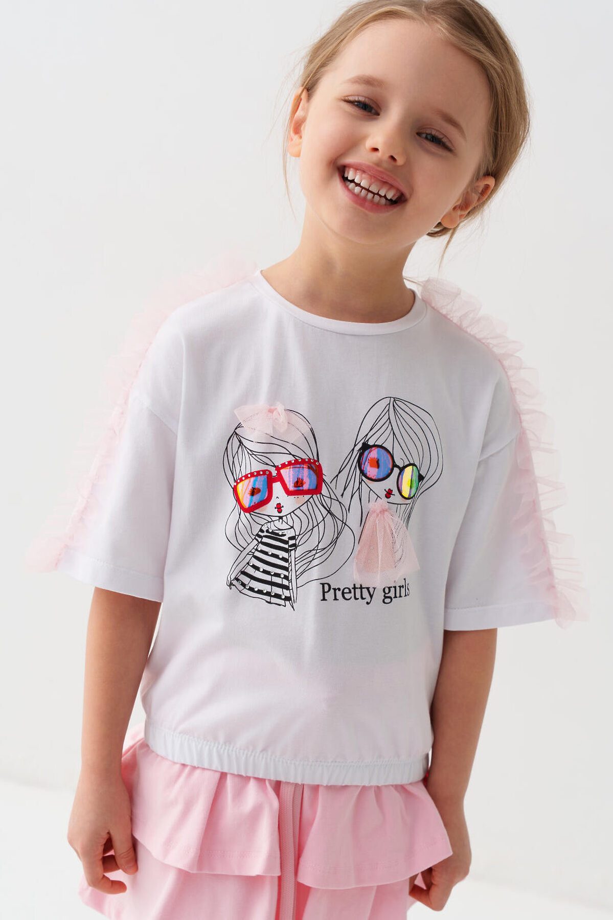 Детская футболка для девочки. Модель свободного кроя, выполнена из эластичного хлопкового трикотажа джерси. Спереди расположен крупный принт. Горловина круглая. Рукава с рюшами из сетки. Низ изделия на эластичной резинке.