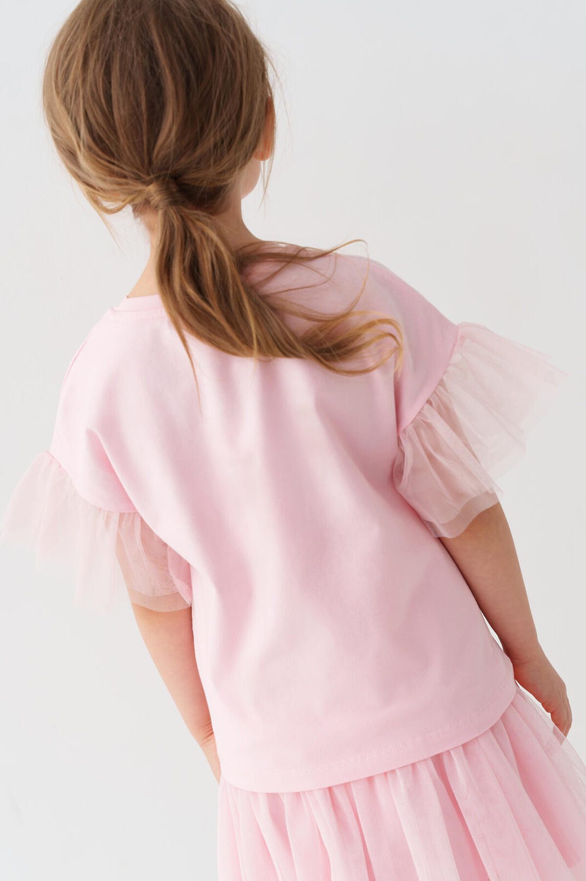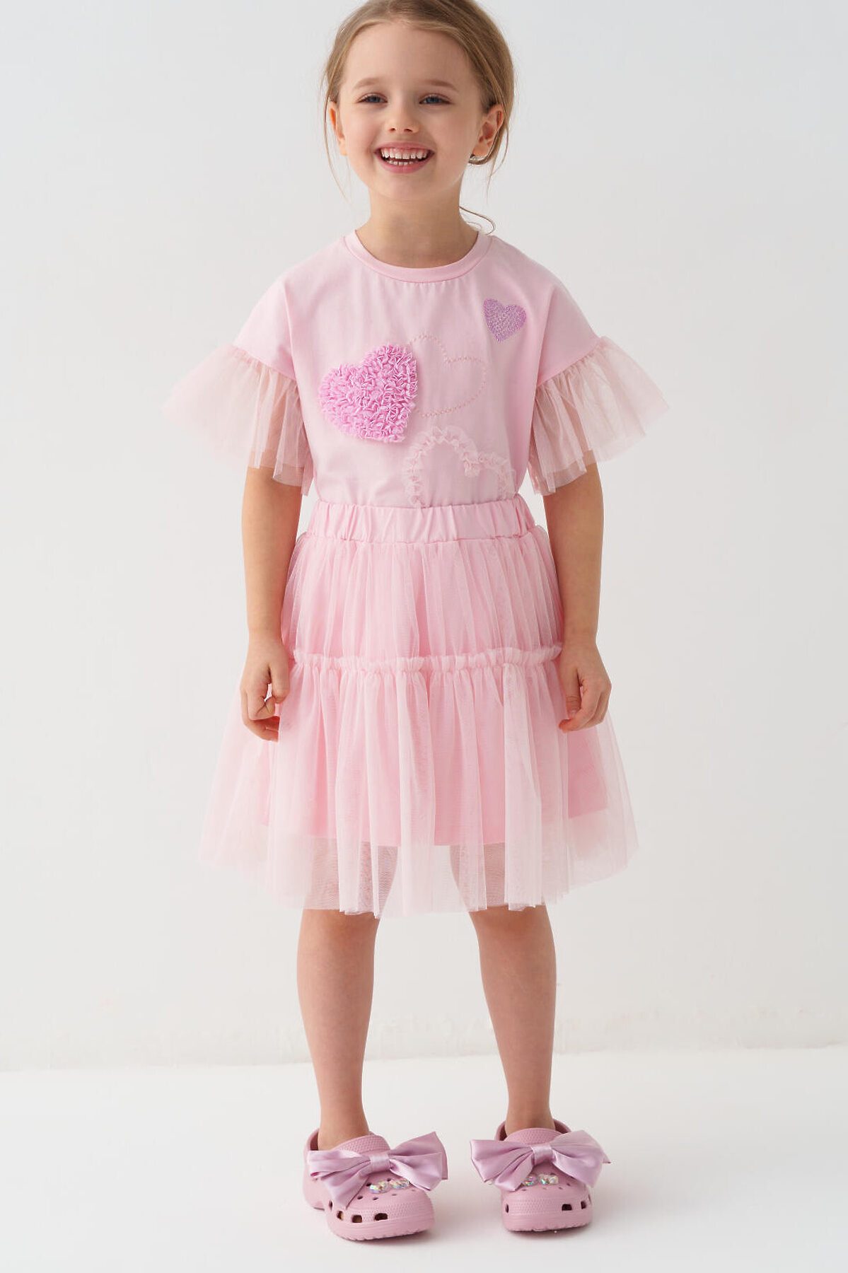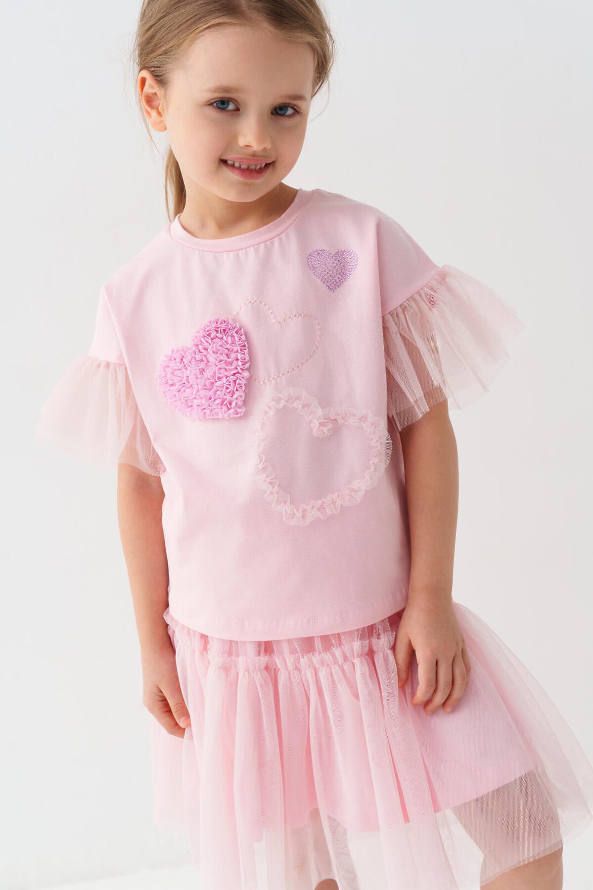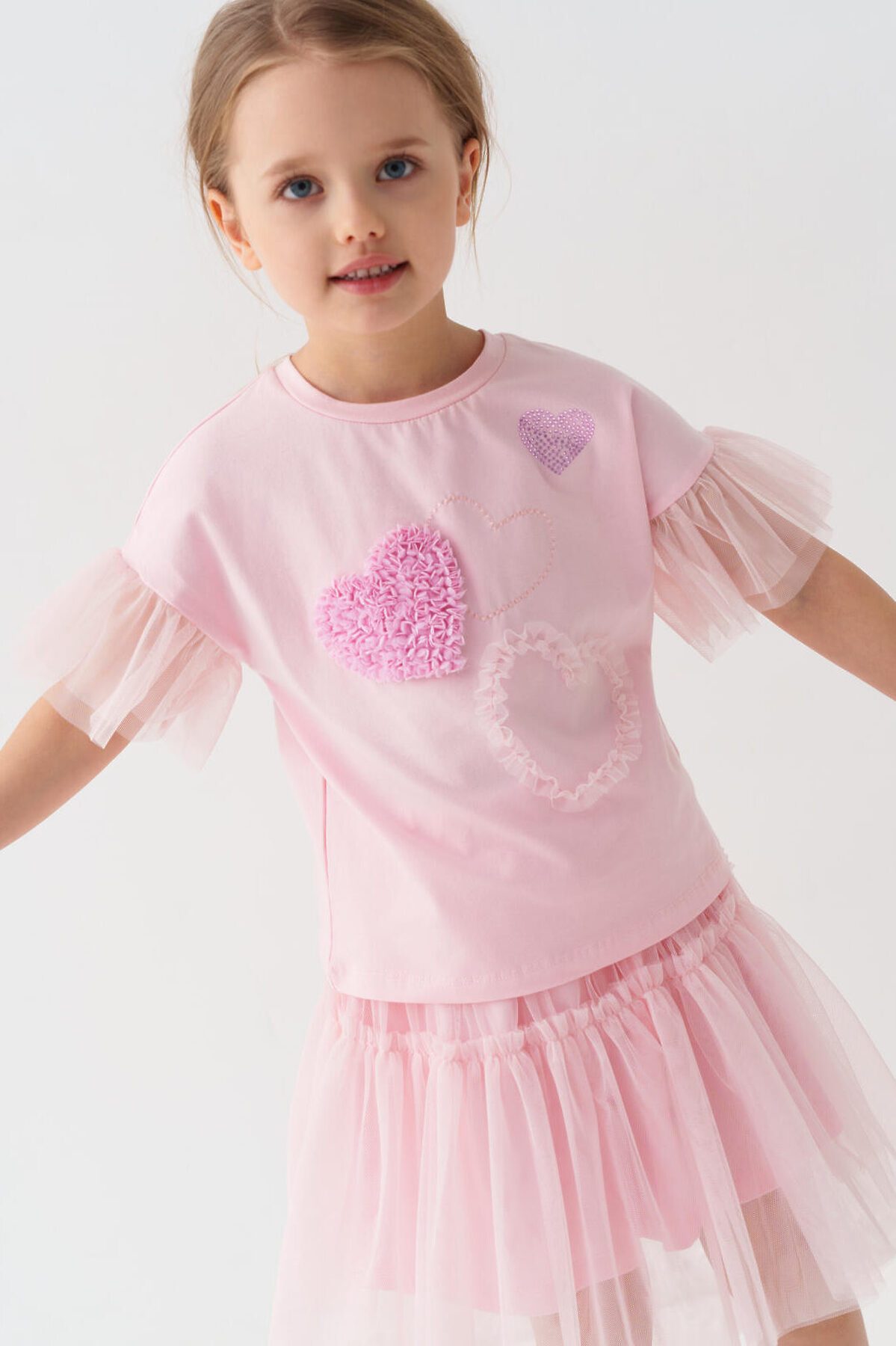 Детская футболка для девочки. Модель прямого кроя, выполнена из эластичного хлопкового трикотажа джерси. Спереди расположен крупный принт с сердечками. Горловина круглая. Рукава-крылышки из сетки.