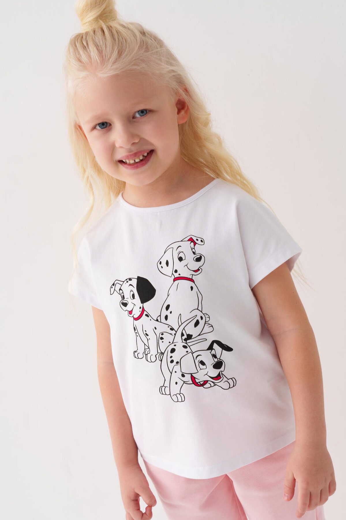 Детская футболка для девочки. Модель свободного кроя, выполнена из эластичного хлопкового трикотажа джерси. Спереди расположен крупный принт с героями из любимого мультфильма "101 далматинец". Горловина круглая. Сзади декорирована бантом.