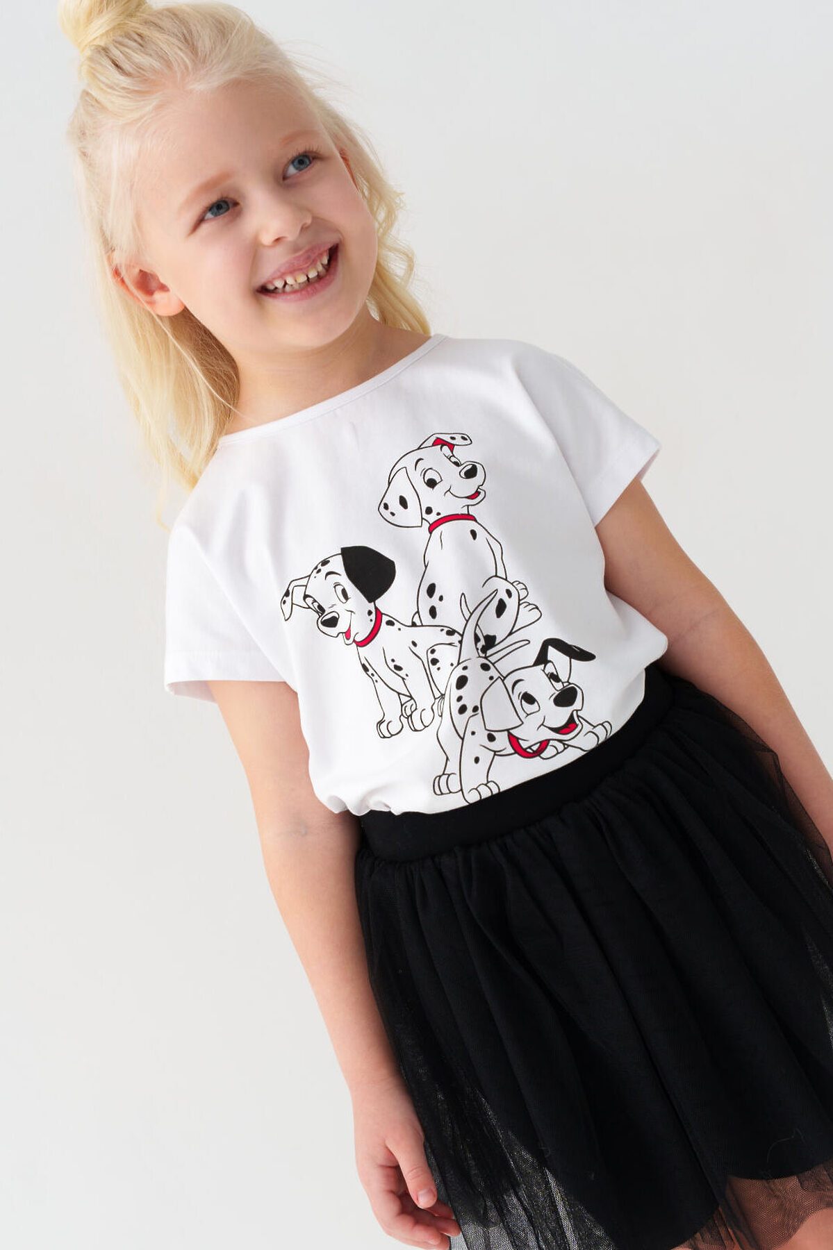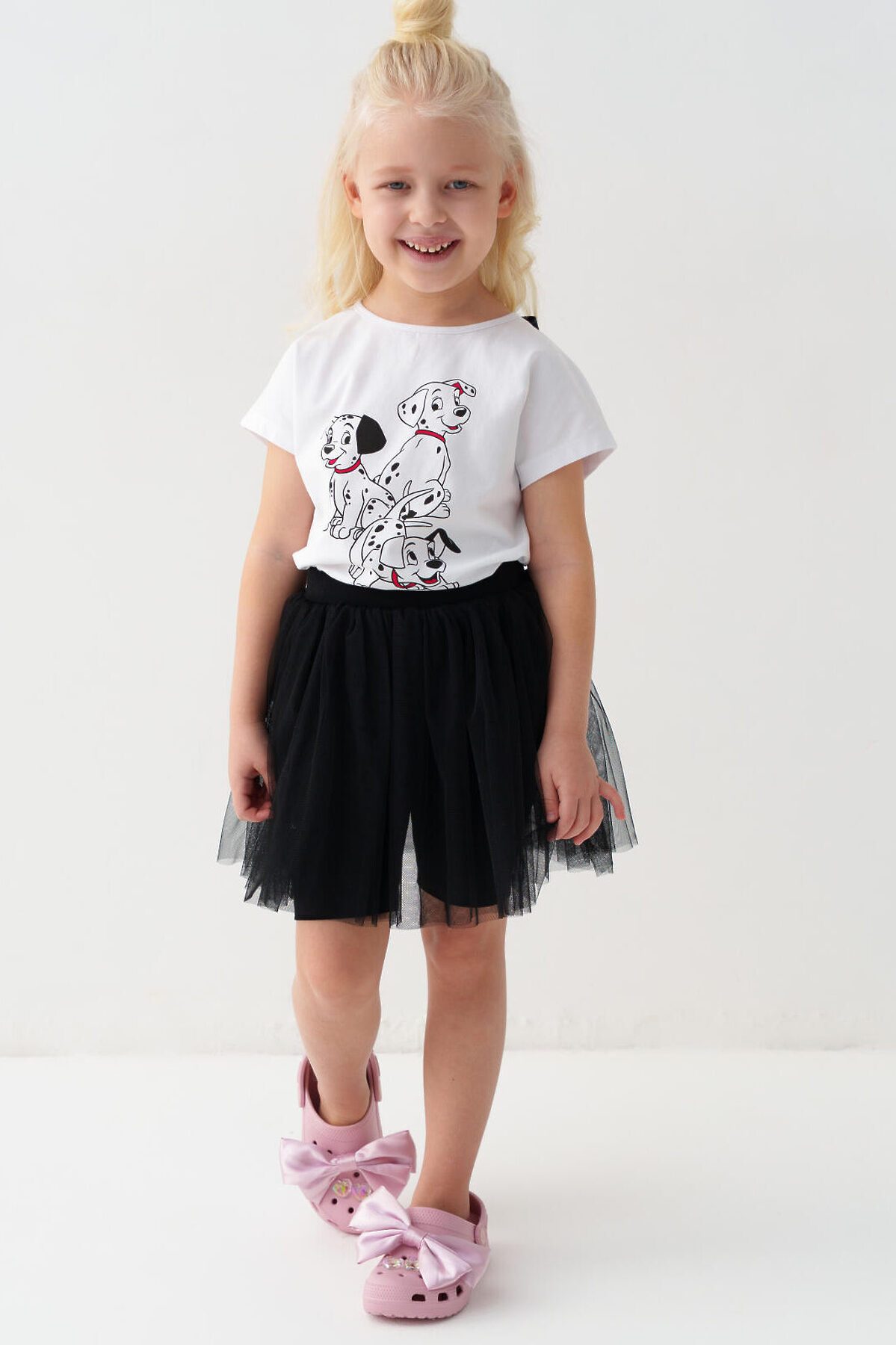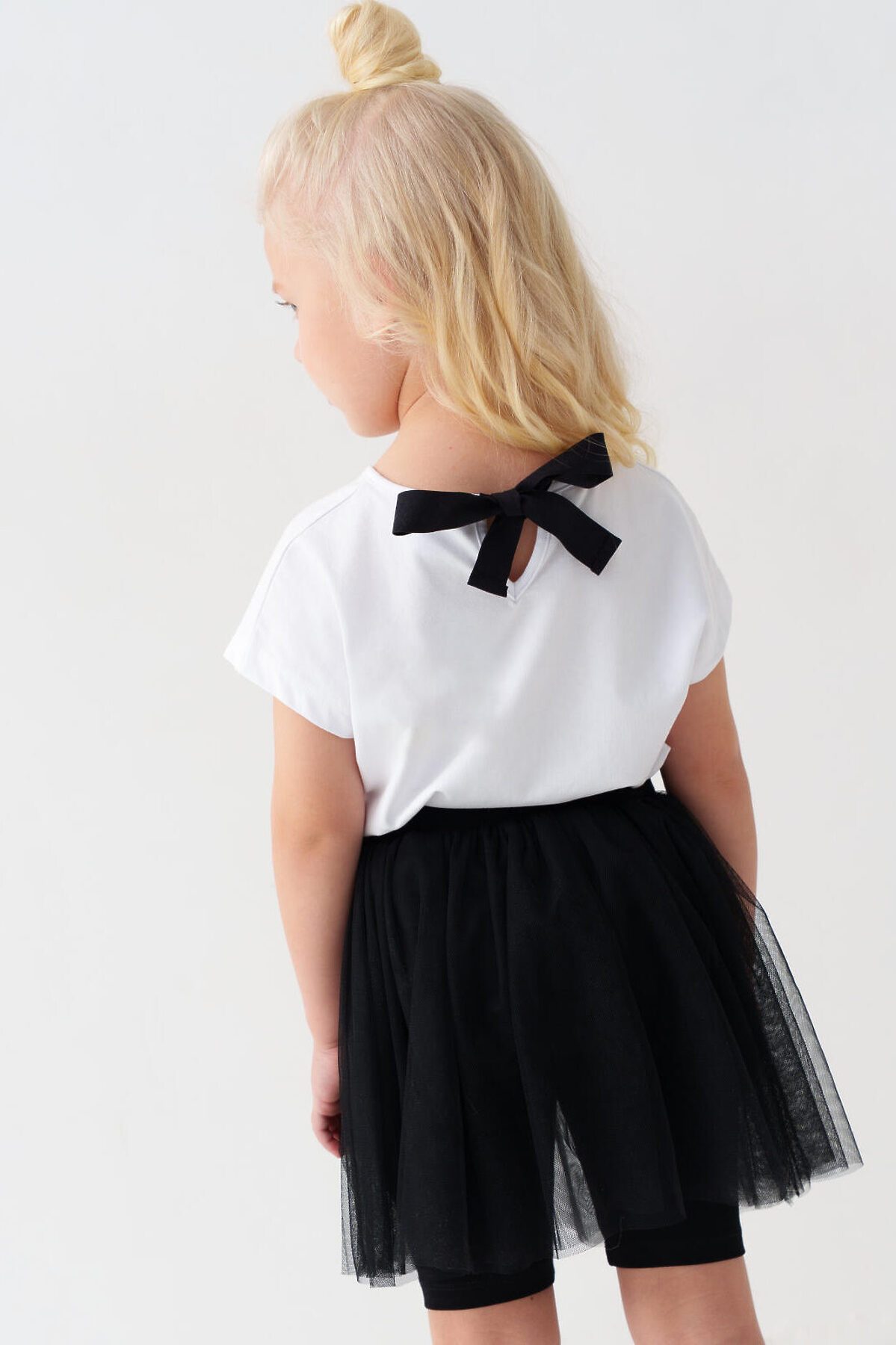 Детская юбка-леггинсы для девочки. Верхняя часть выполнена из легкой сетчатой ткани, под ней — плотные трикотажные укороченные леггинсы. Широкий пояс держится за счёт внутренней резинки. Длина юбки — до середины бедра.