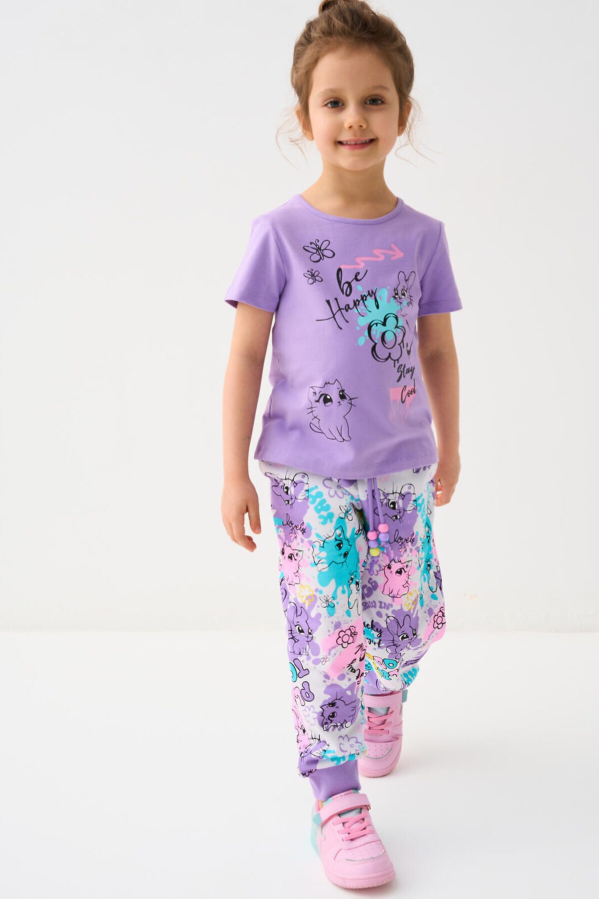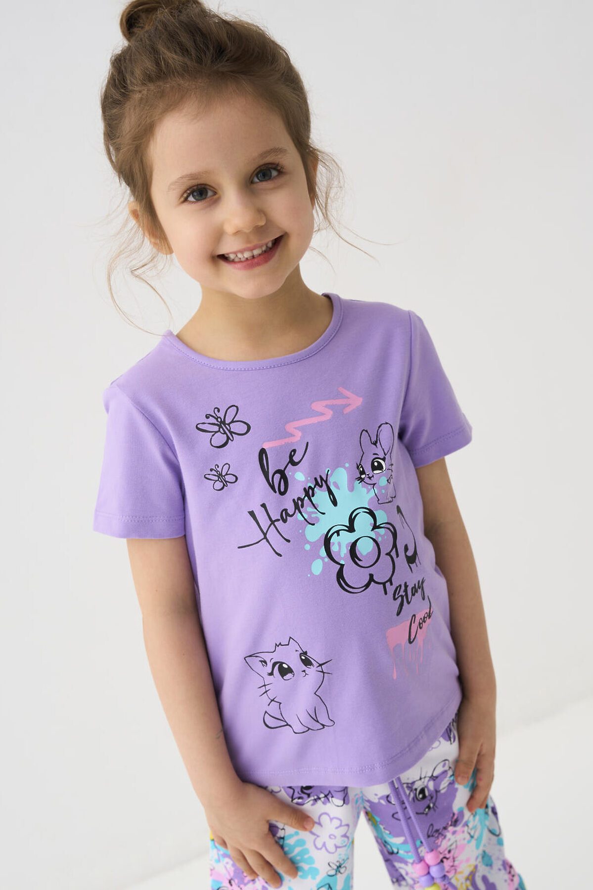 Детская футболка для девочки. Модель прямого кроя, выполнена из эластичного хлопкового трикотажа джерси. Спереди расположен крупный красочный принт. Горловина круглая.