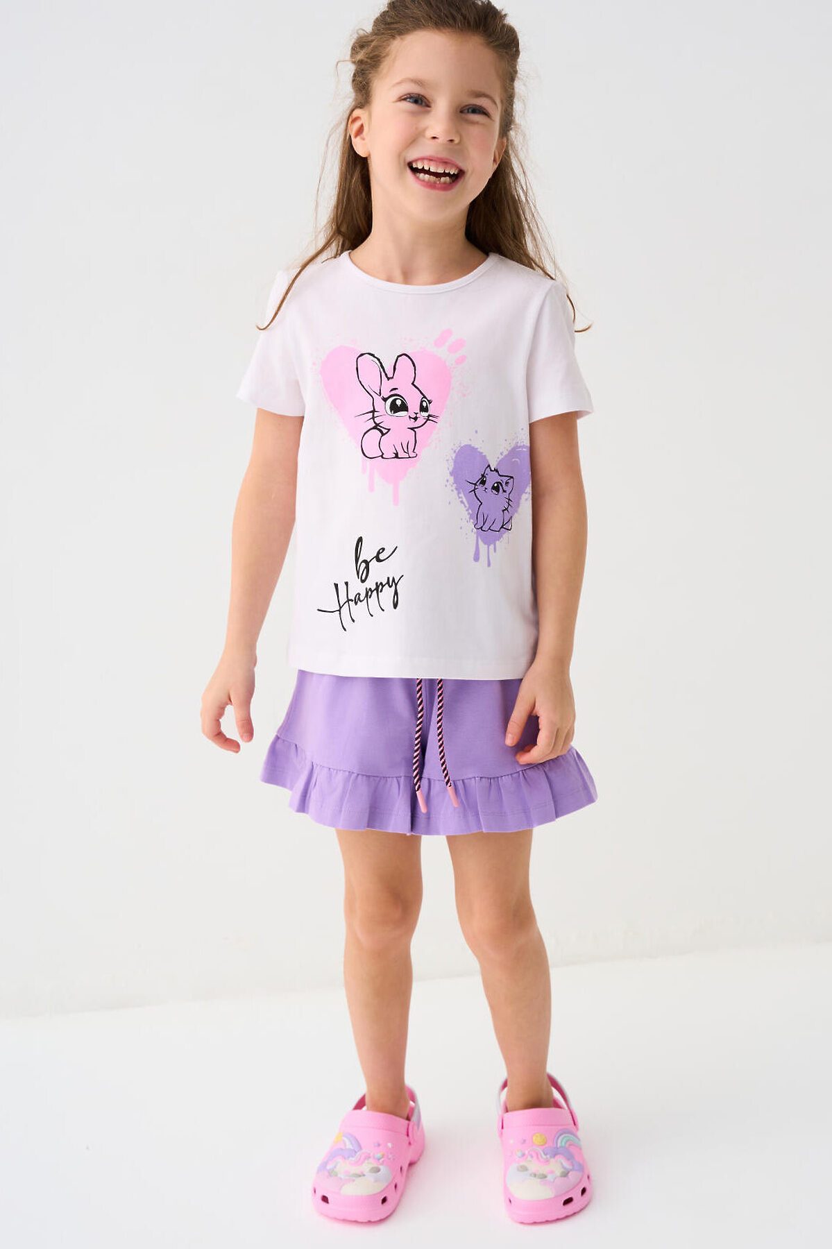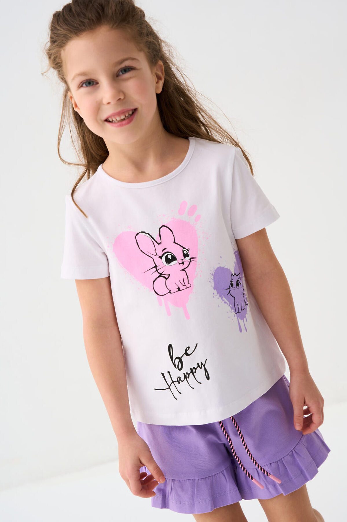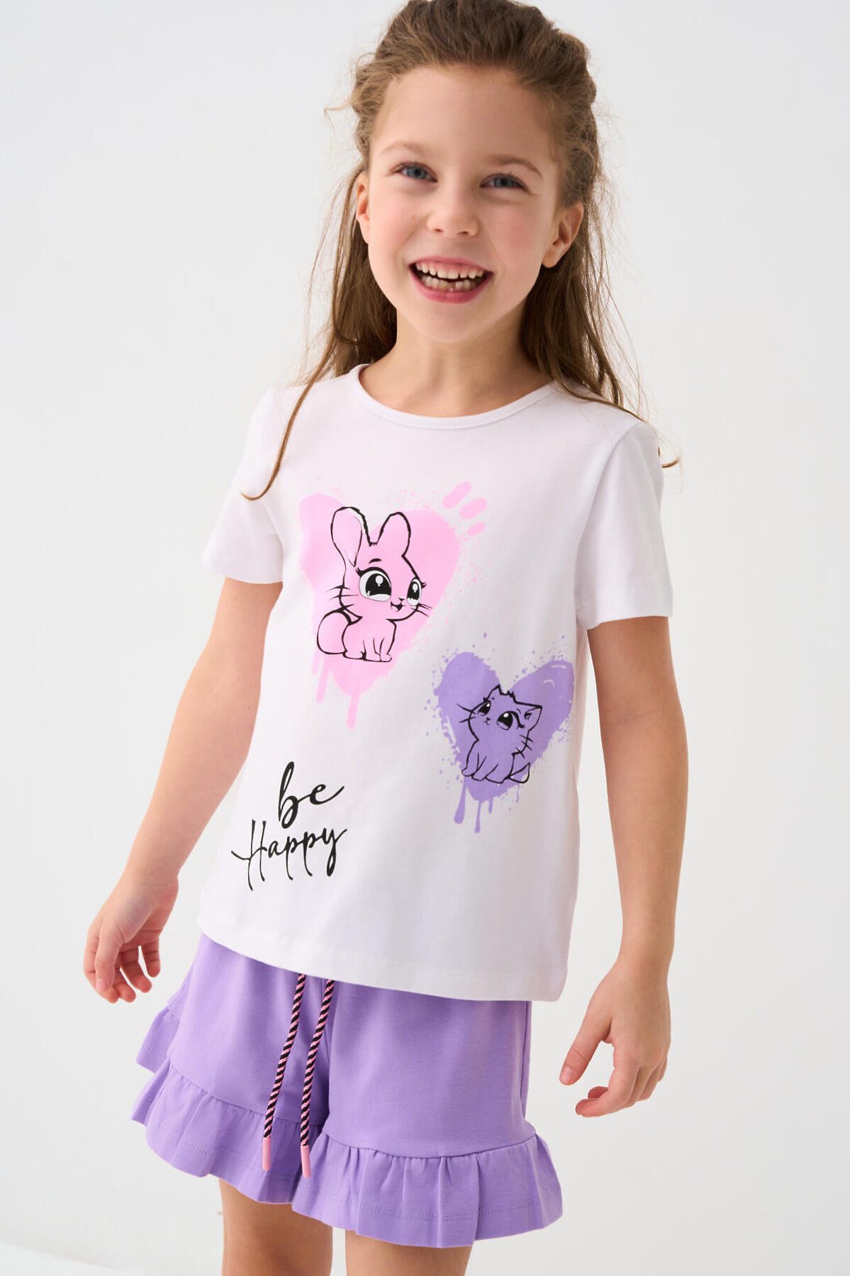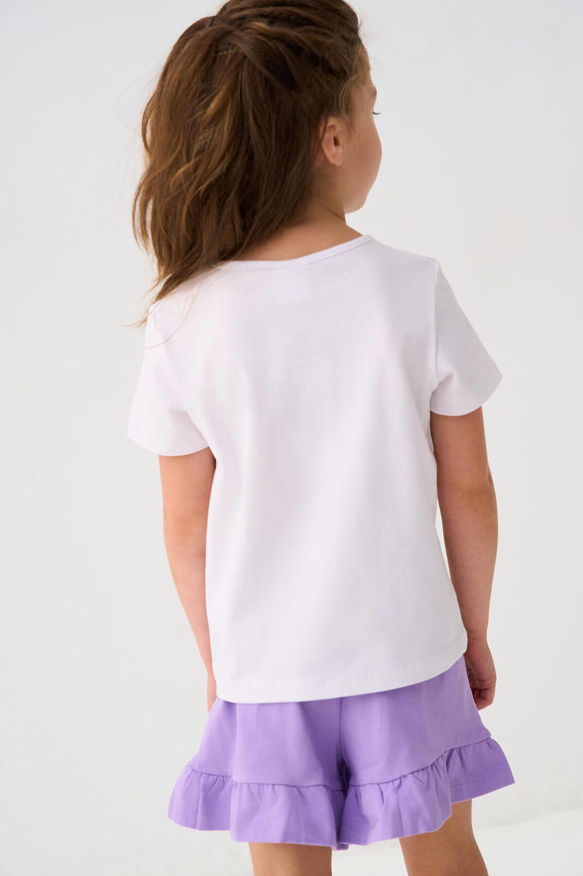 Детский костюм для девочки. Состоит из футболки с коротким рукавом и шорт. Выполнен из хлопкового трикотажа. Футболка прямого кроя, с красочным принтом. Шорты свободные, хорошо сидят на талии благодаря эластичному поясу и регулирующему шнурку. По низу декоративные рюши.