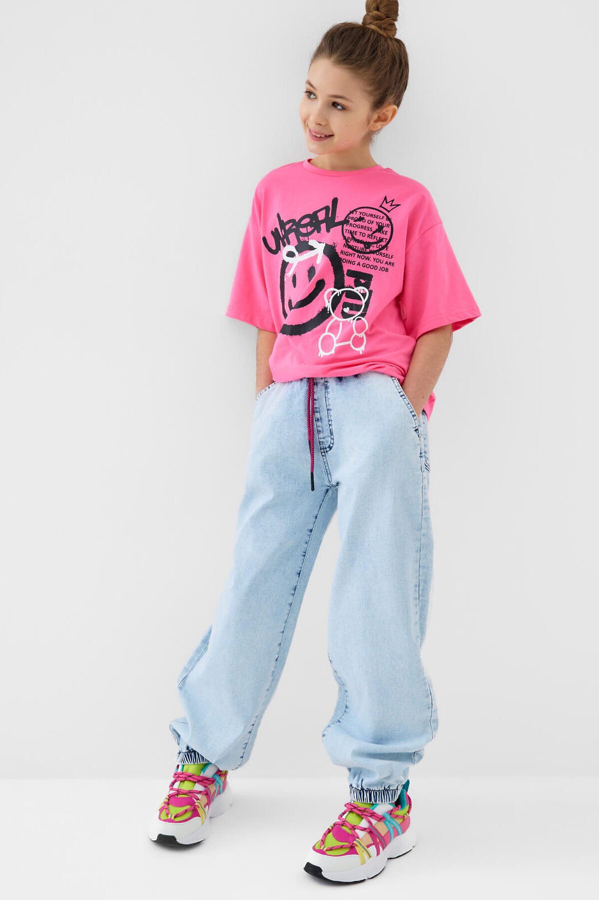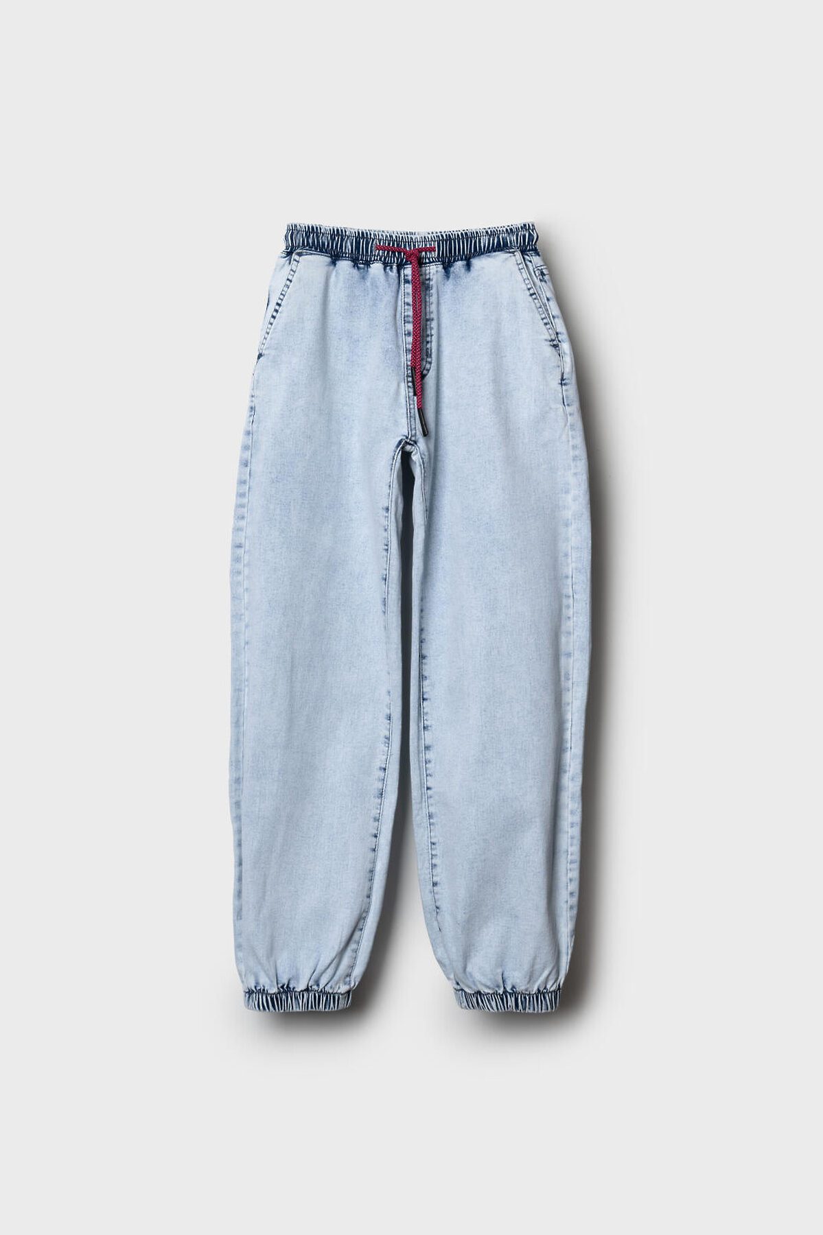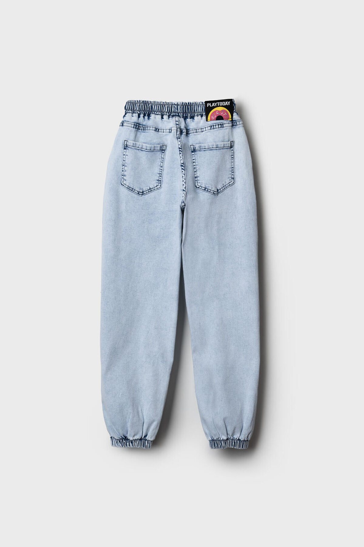 Джинсы для девочки подростка. Эластичный пояс со шнурком для регулировки и двумя боковыми карманами. Сзади — два накладных кармана. Модель свободного кроя с манжетами на резинке по низу. Изделие выполнено из светло-голубого денима с эффектом варки.