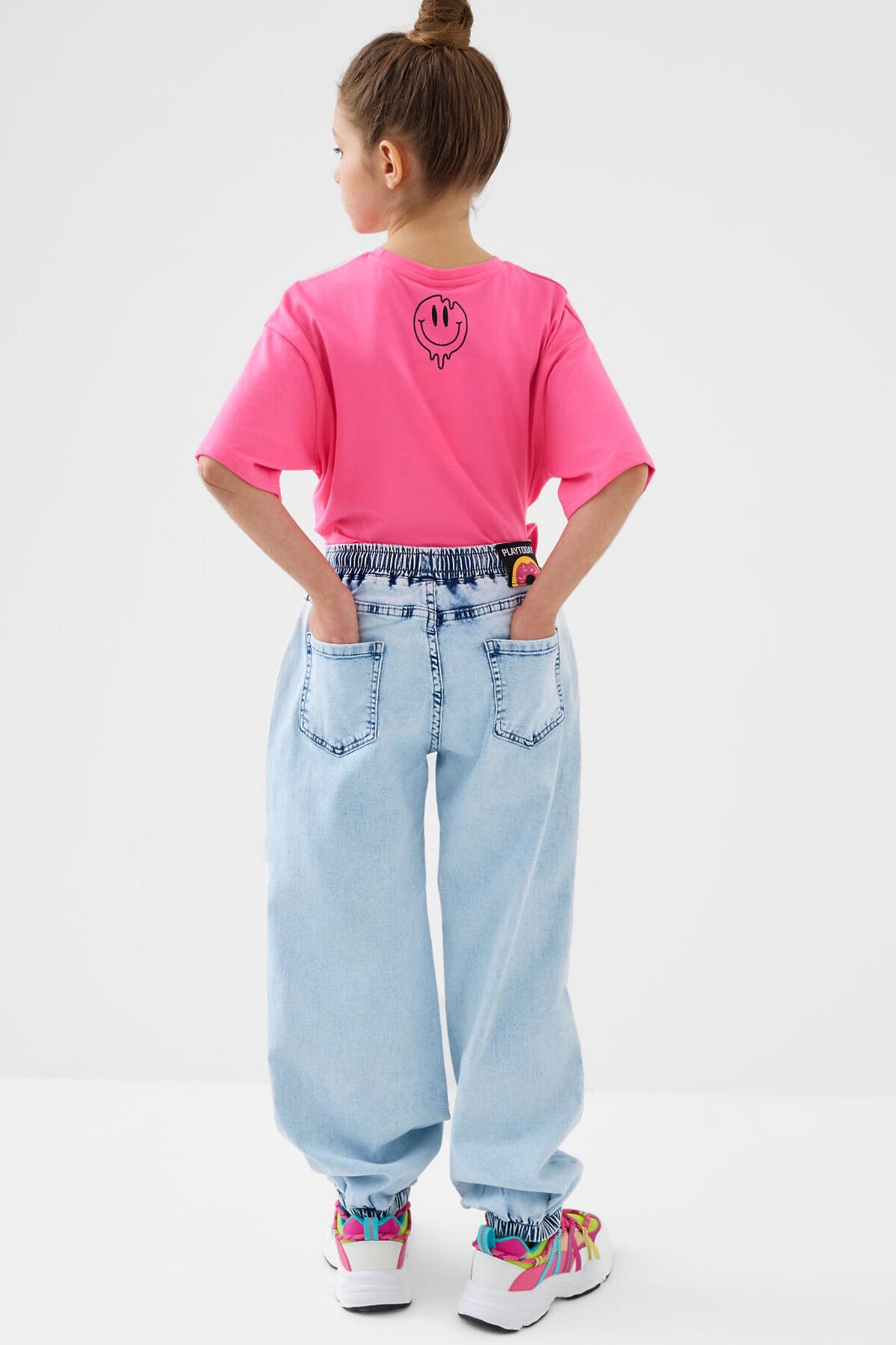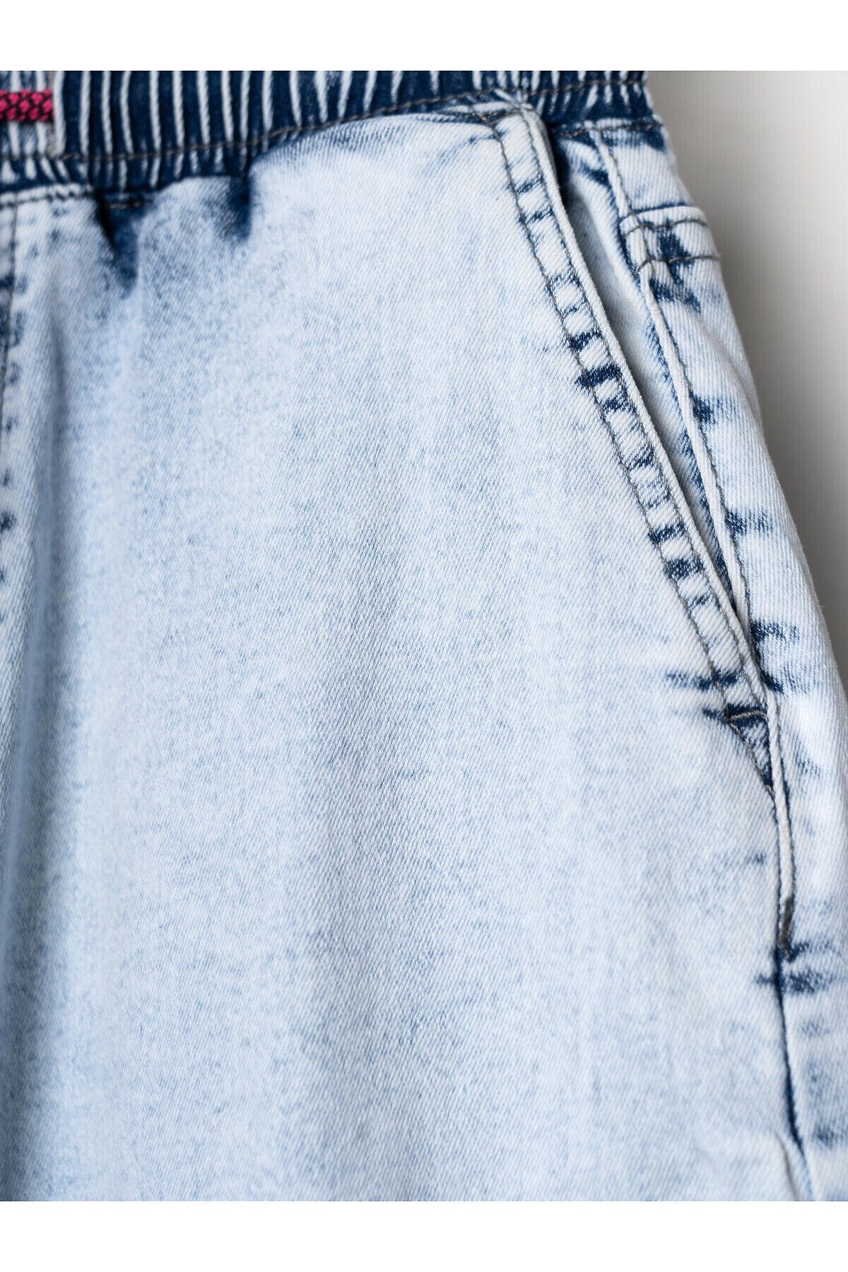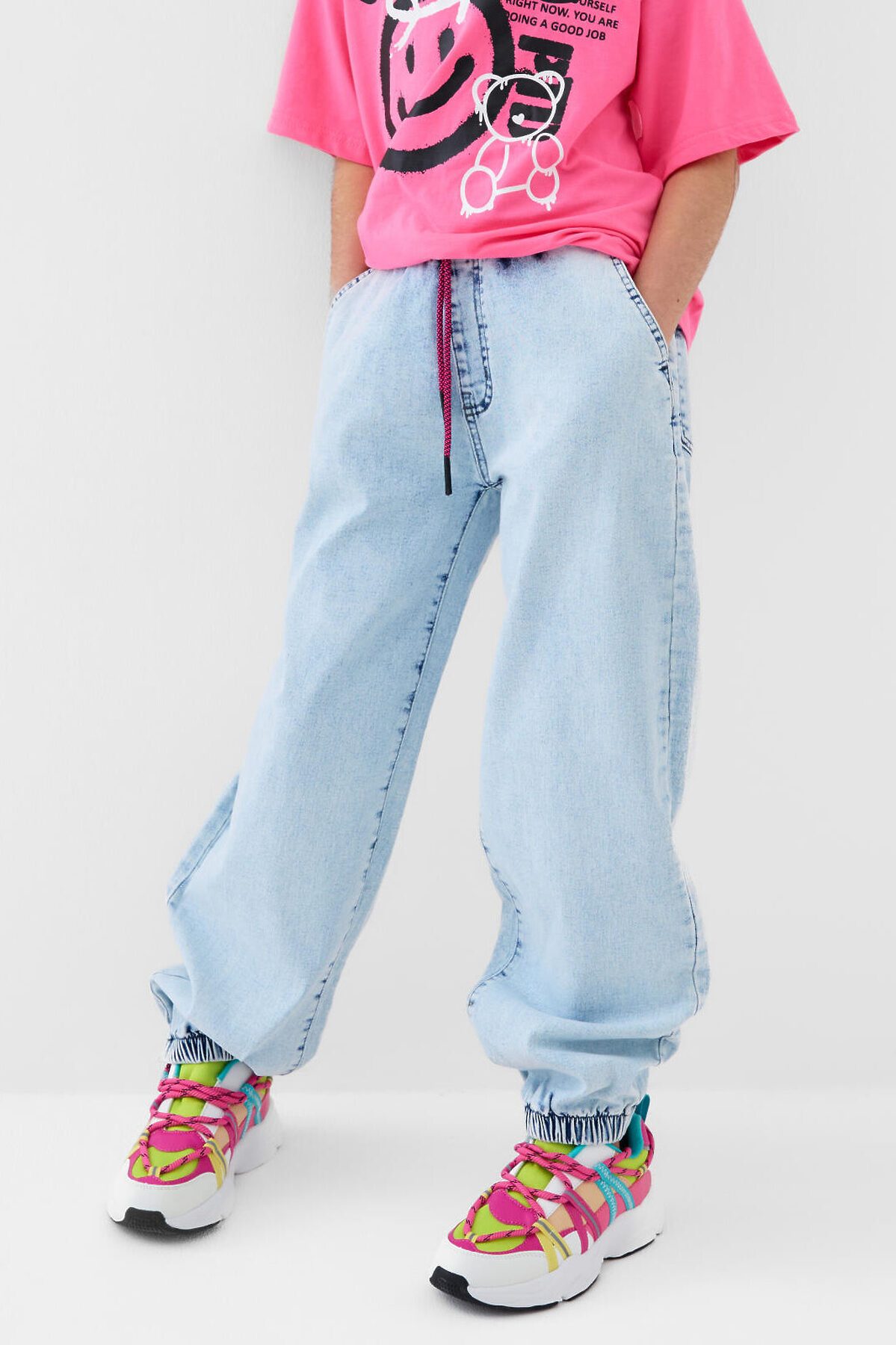 Джинсы для девочки подростка. Эластичный пояс со шнурком для регулировки и двумя боковыми карманами. Сзади — два накладных кармана. Модель свободного кроя с манжетами на резинке по низу. Изделие выполнено из светло-голубого денима с эффектом варки.