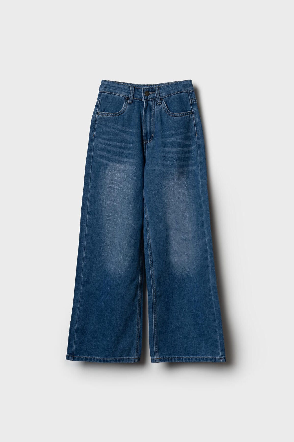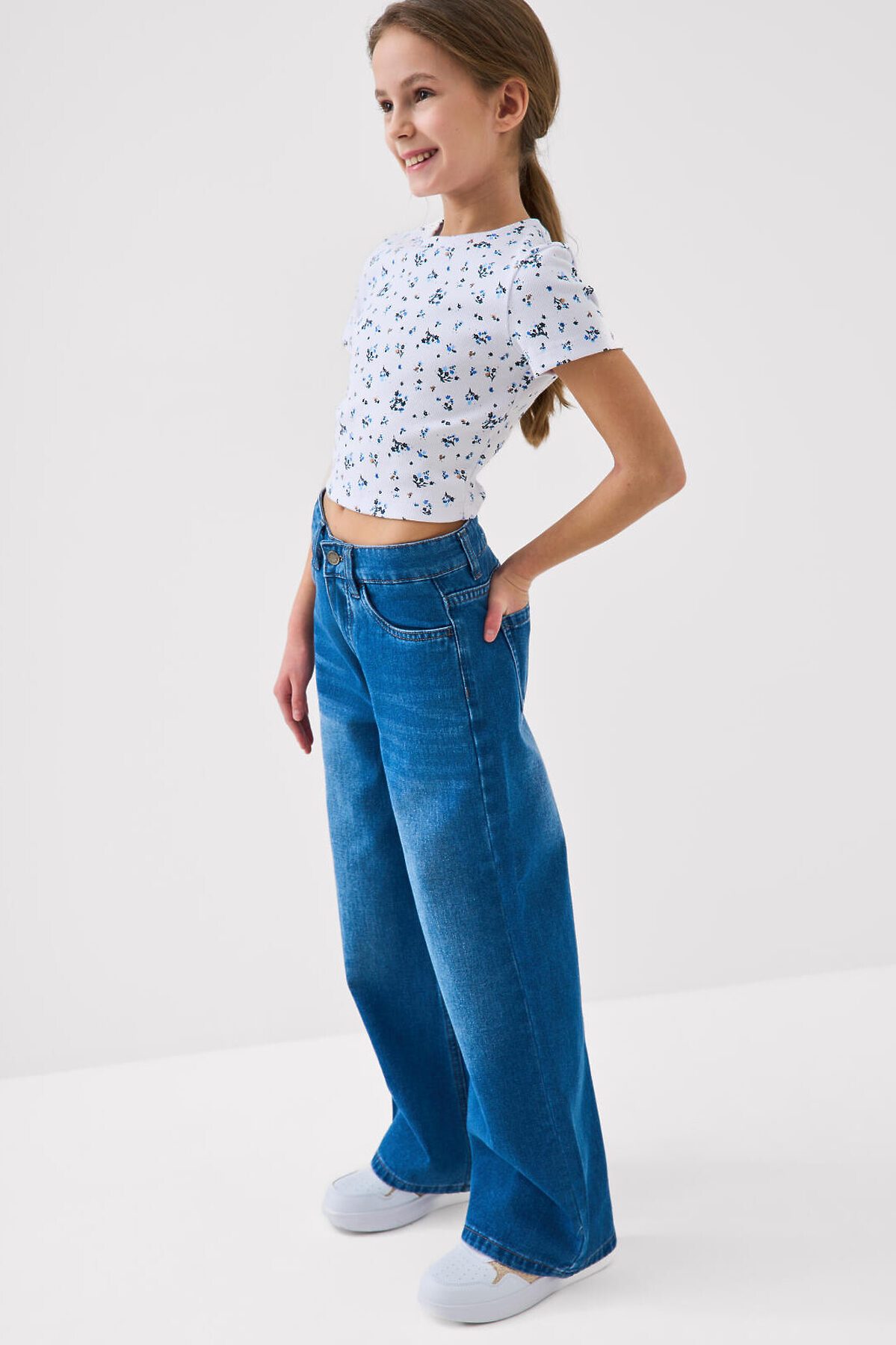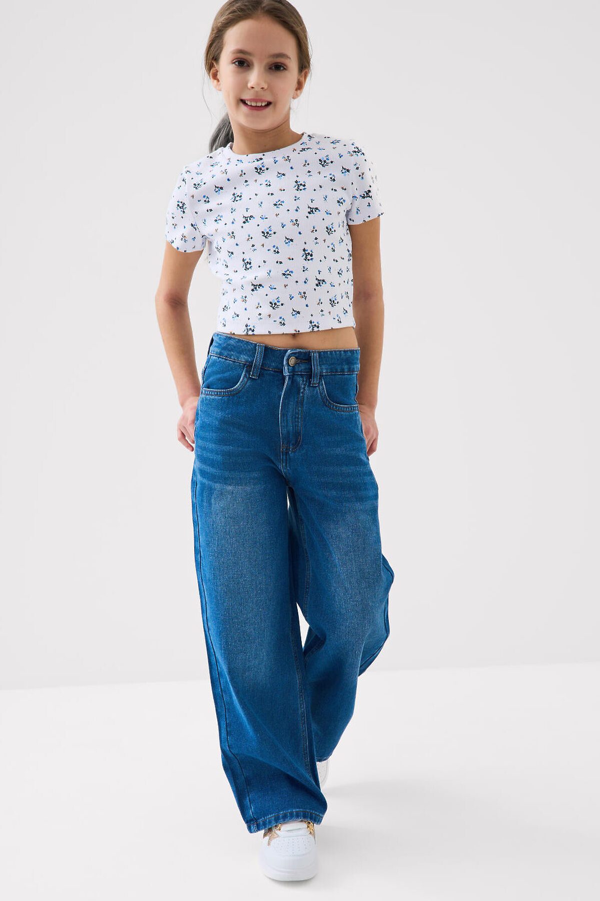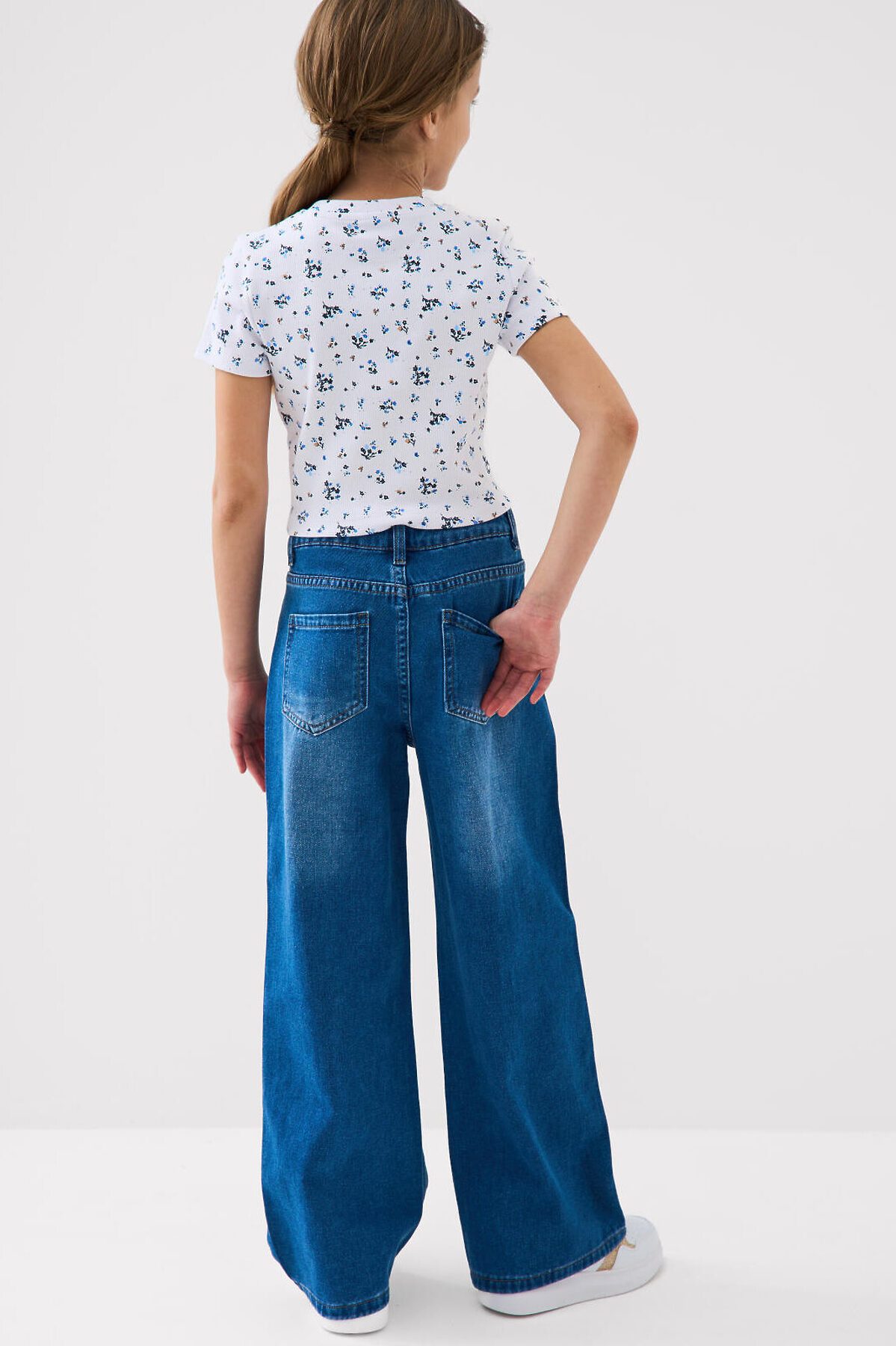 Джинсы свободные для девочки подростка. Модель с высокой посадкой и широкими прямыми штанинами. Застежка — молния и болт. Пояс частично на резинке сзади и регулируется изнутри с помощью пуговиц. Модель выполнена из синего денима. Есть передние и задние карманы.