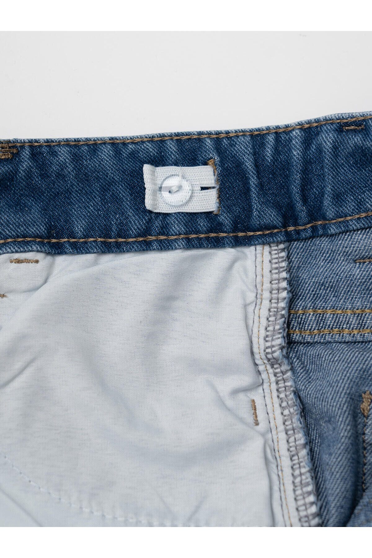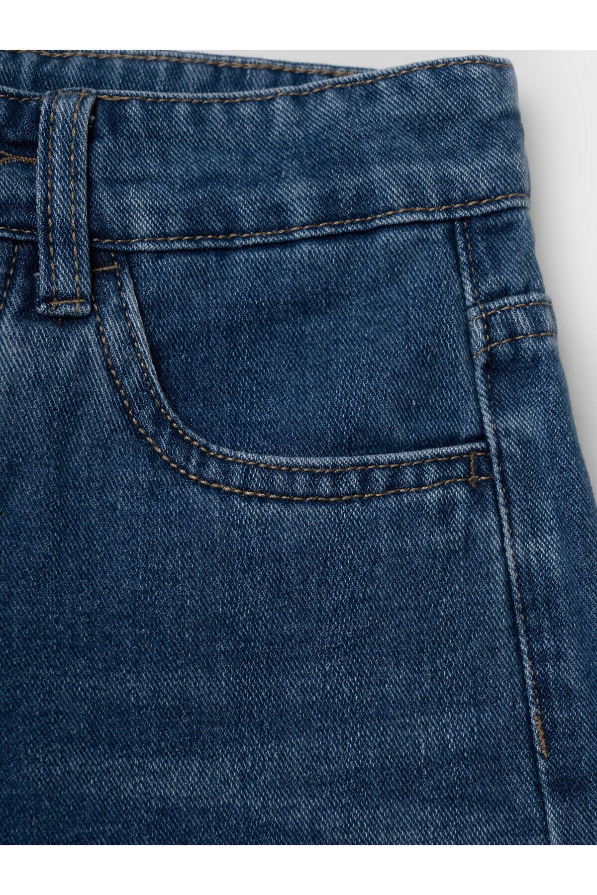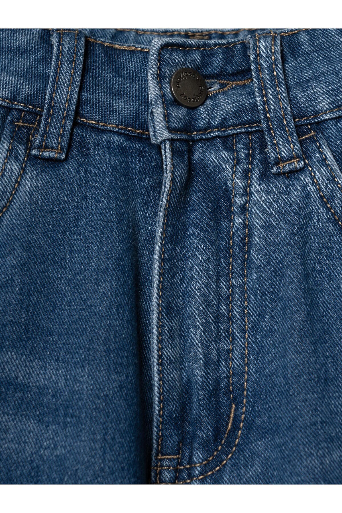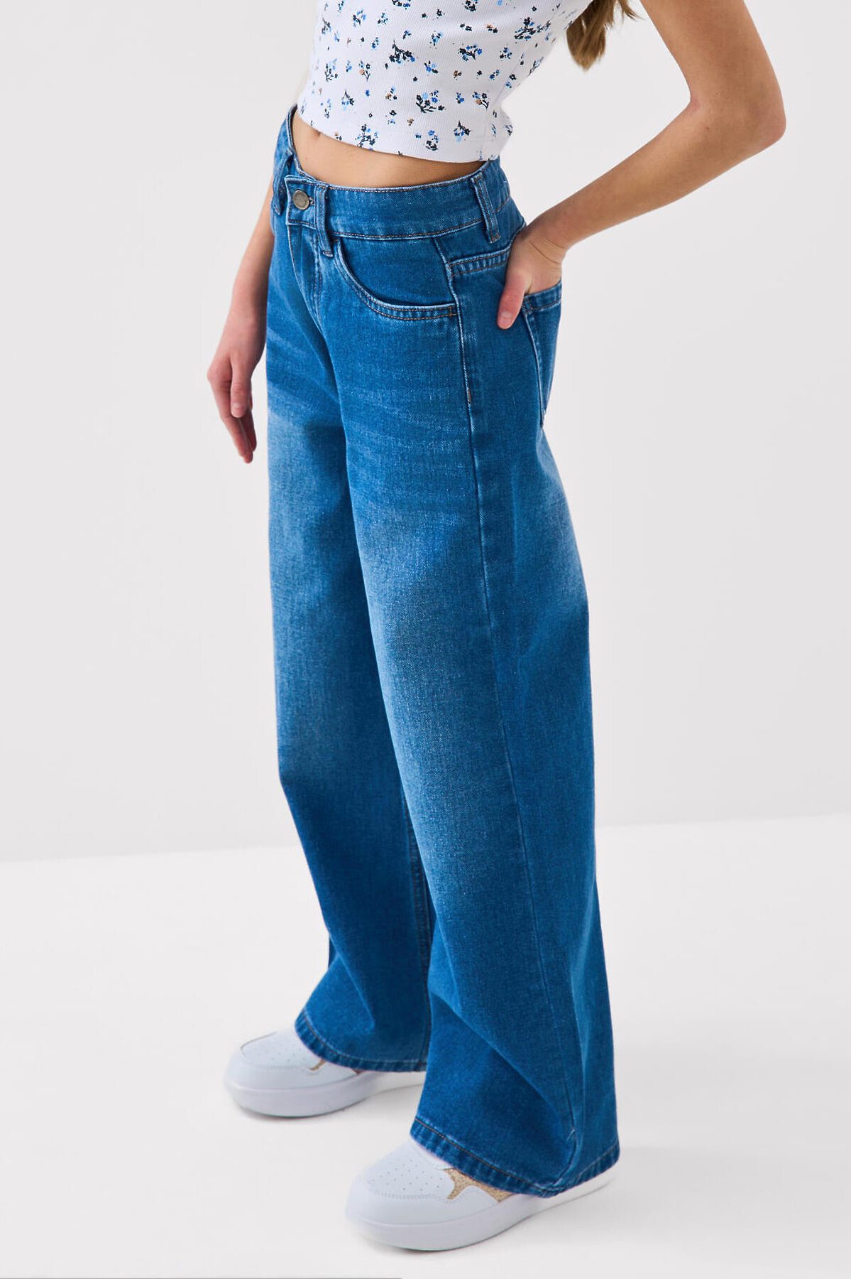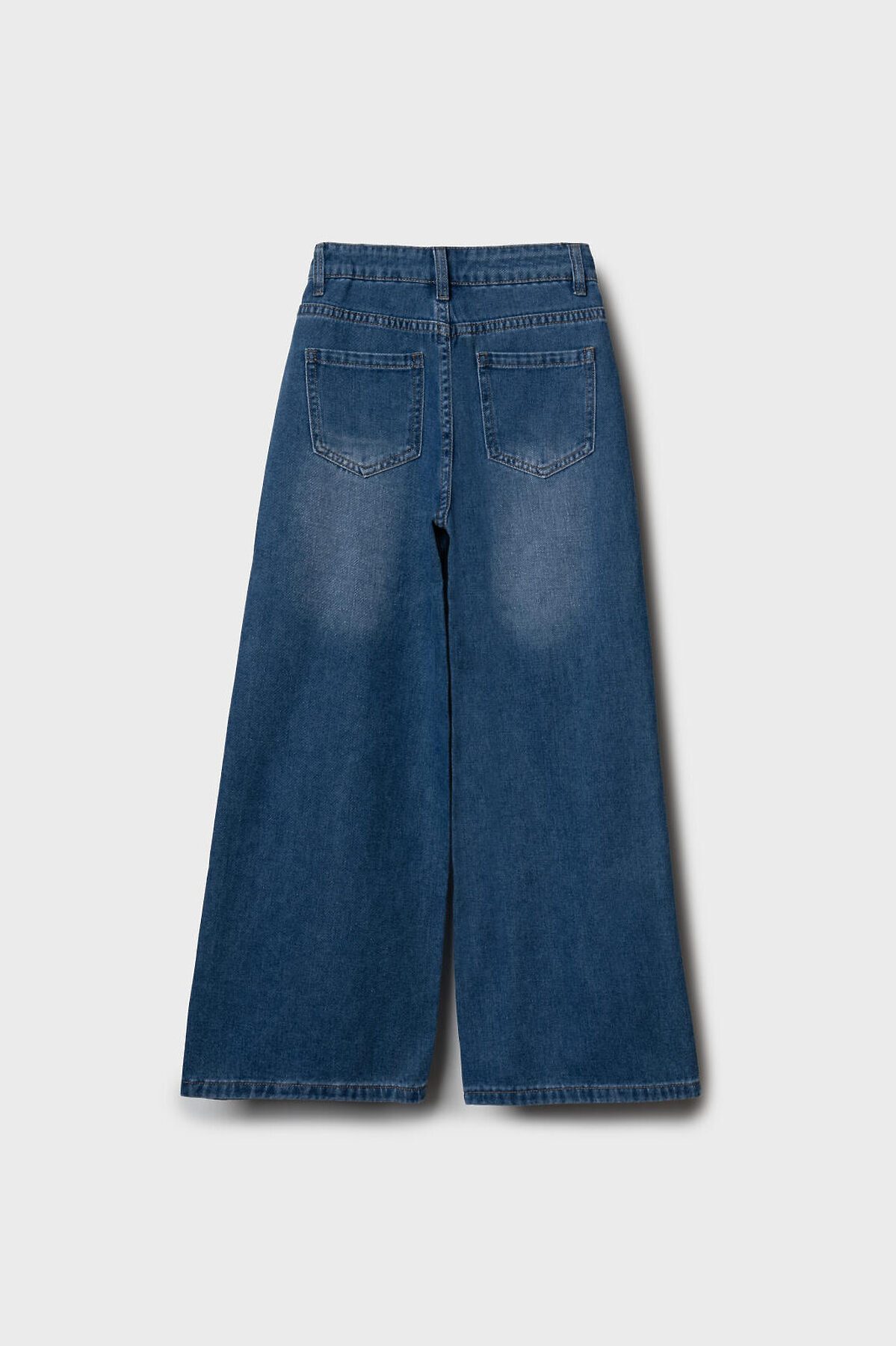 Джинсы свободные для девочки подростка. Модель с высокой посадкой и широкими прямыми штанинами. Застежка — молния и болт. Пояс частично на резинке сзади и регулируется изнутри с помощью пуговиц. Модель выполнена из синего денима. Есть передние и задние карманы.