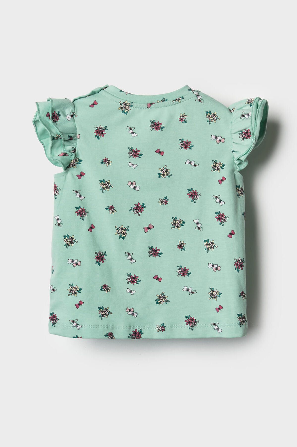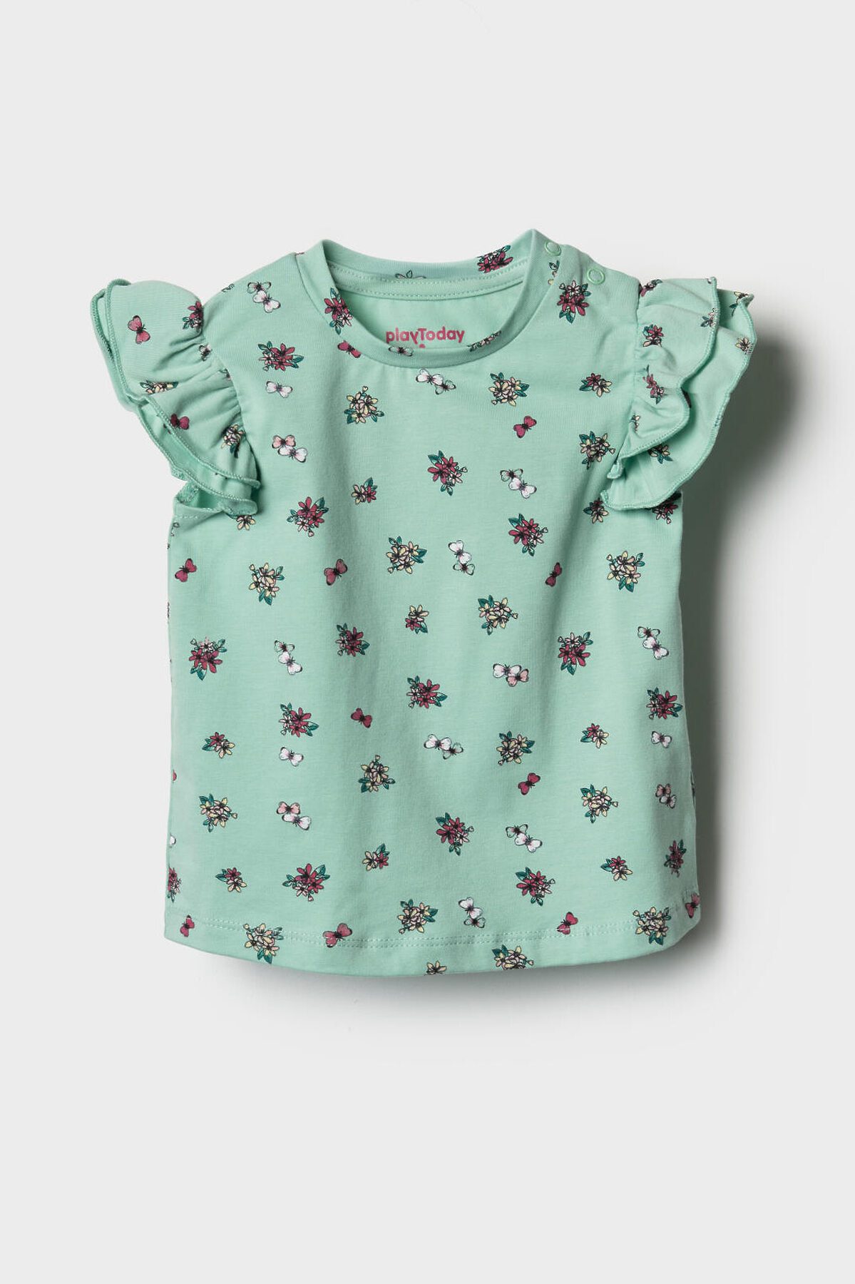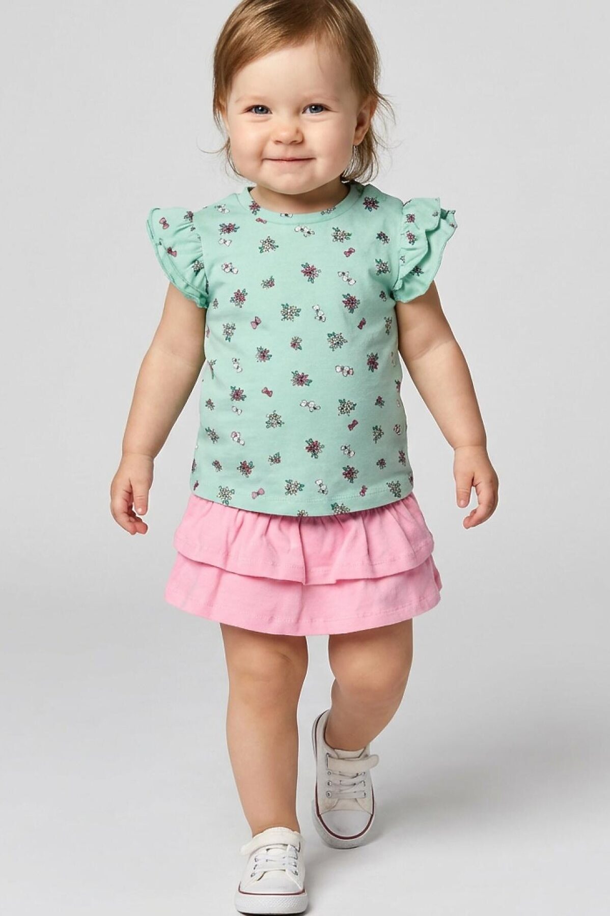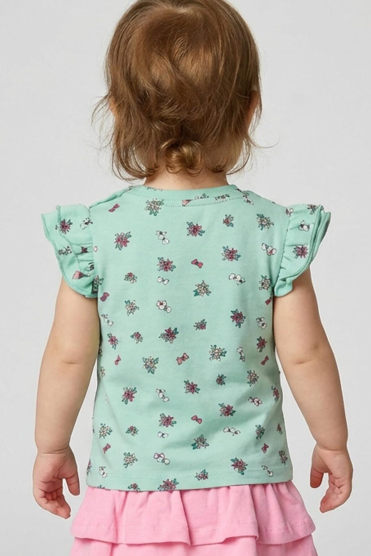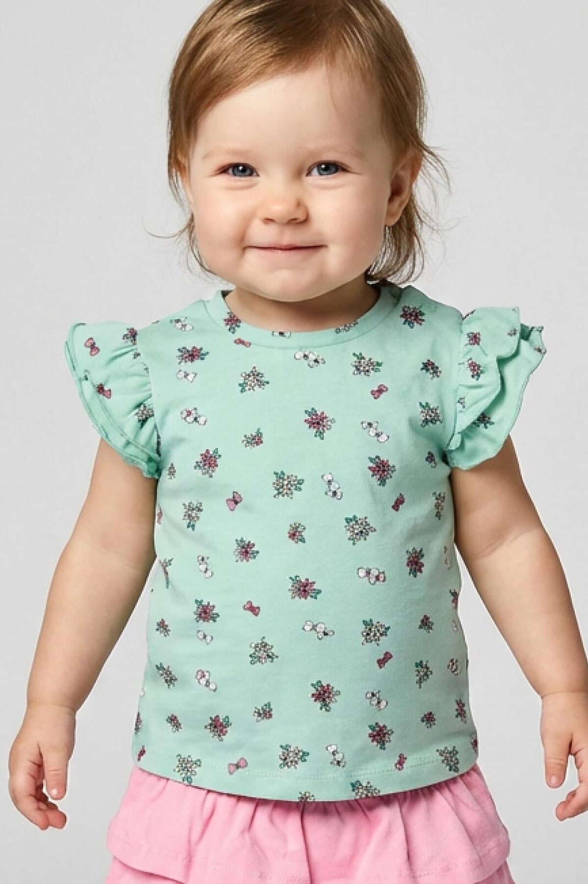Детская футболка для девочки. Модель прямого кроя, выполнена из эластичного хлопкового трикотажа джерси. Принт с цветами. Горловина круглая. На плече застежка на кнопки для удобного переодевания. Рукава-крылышки.