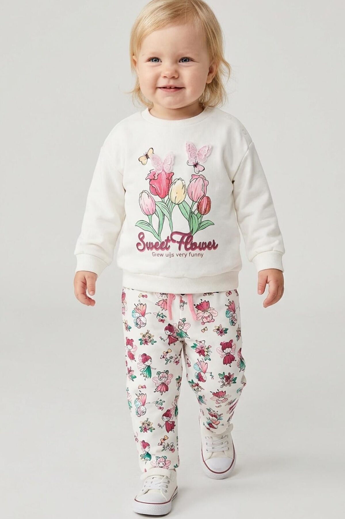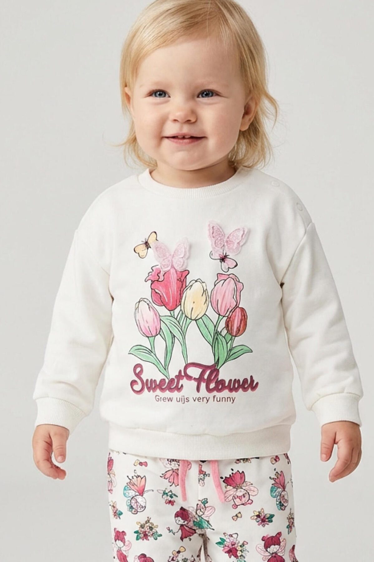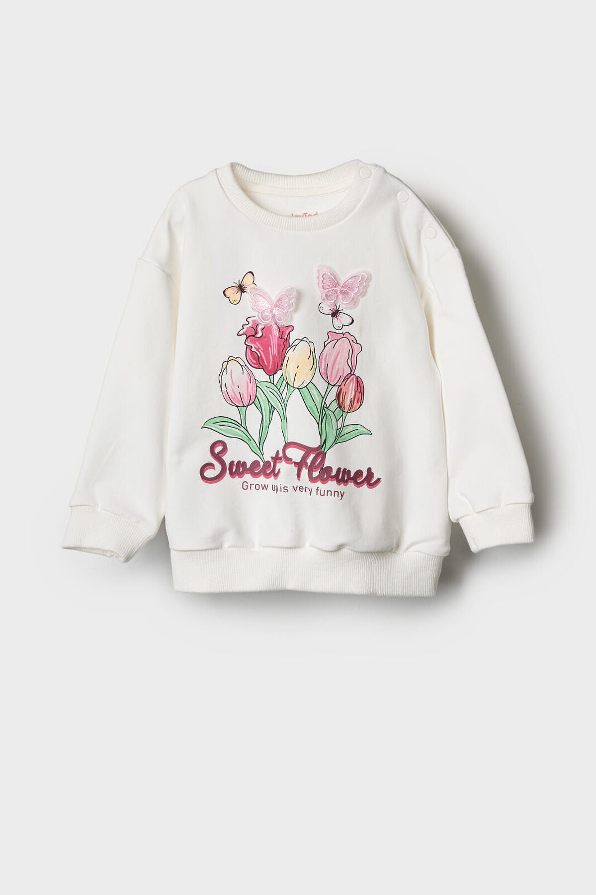 Детский свитшот для девочки. Выполнен из хлопкового футера без начеса. На передней части — нежный принт с тюльпанами и бабочками. На плече застежка на кнопки для удобного переодевания. Низ изделия и рукава оформлены эластичными резинками.