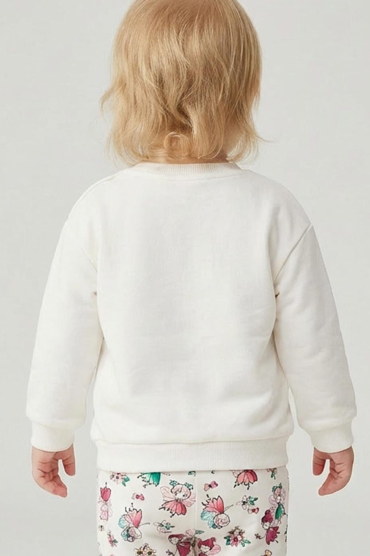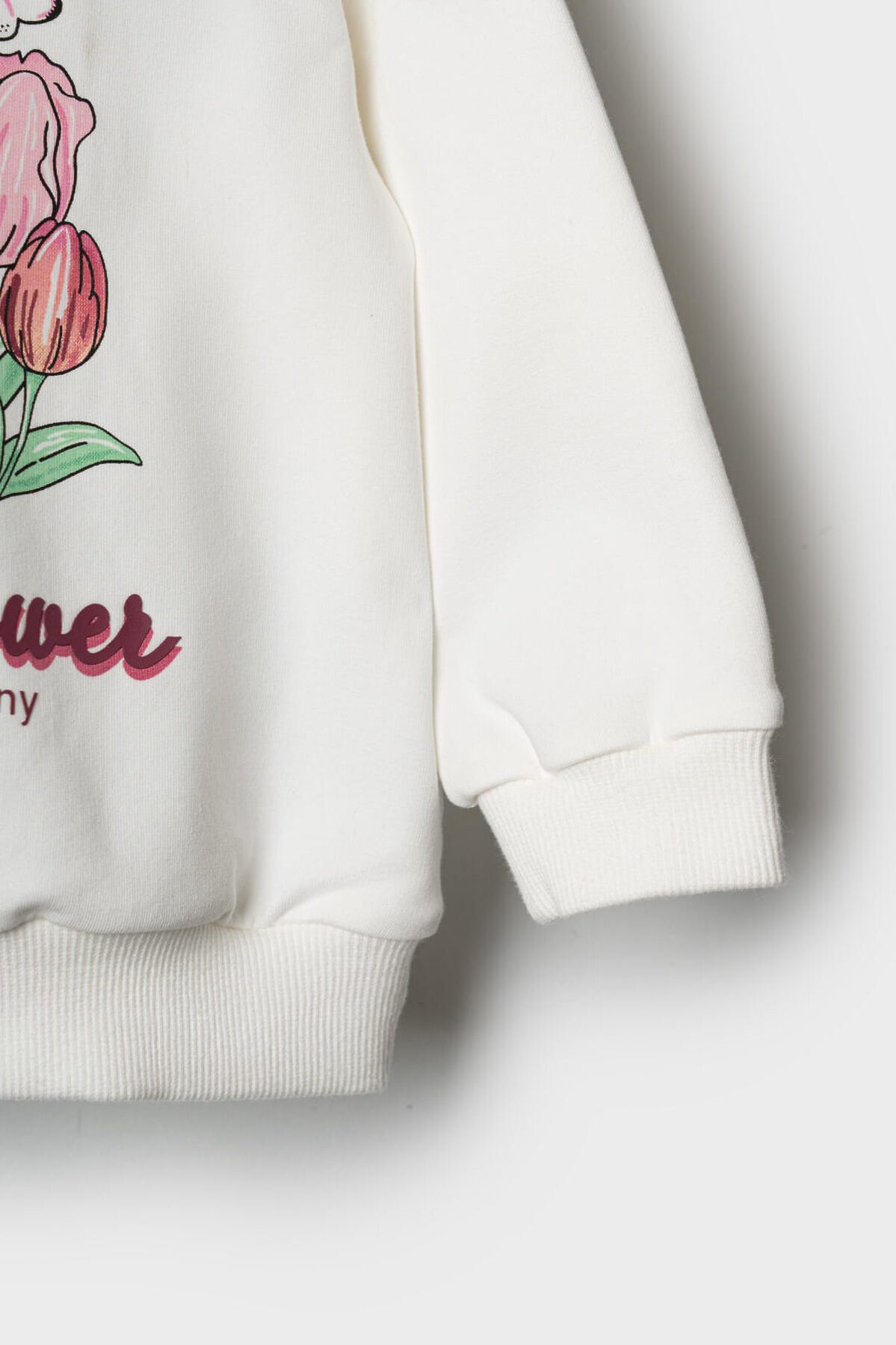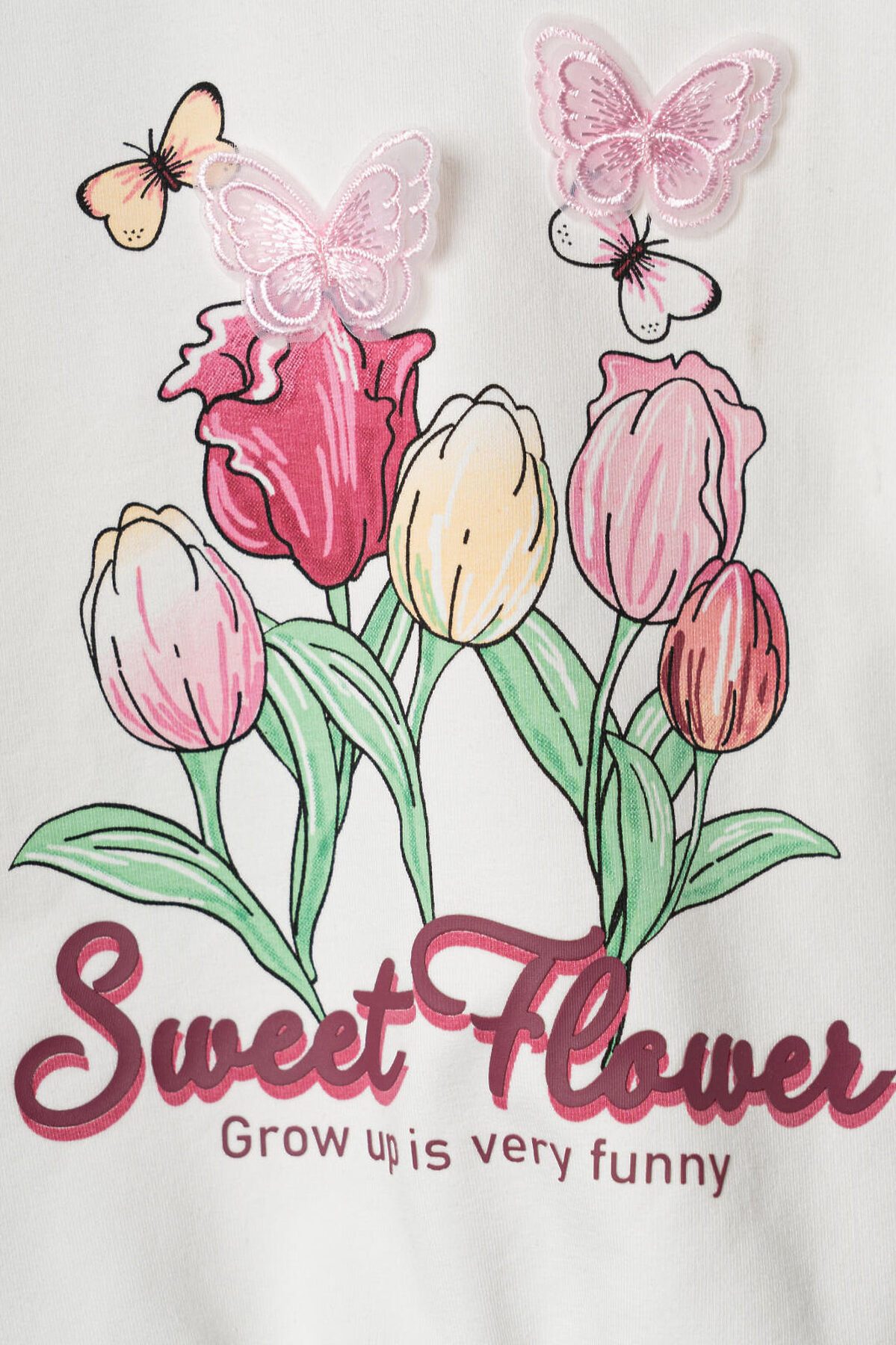 Детский свитшот для девочки. Выполнен из хлопкового футера без начеса. На передней части — нежный принт с тюльпанами и бабочками. На плече застежка на кнопки для удобного переодевания. Низ изделия и рукава оформлены эластичными резинками.