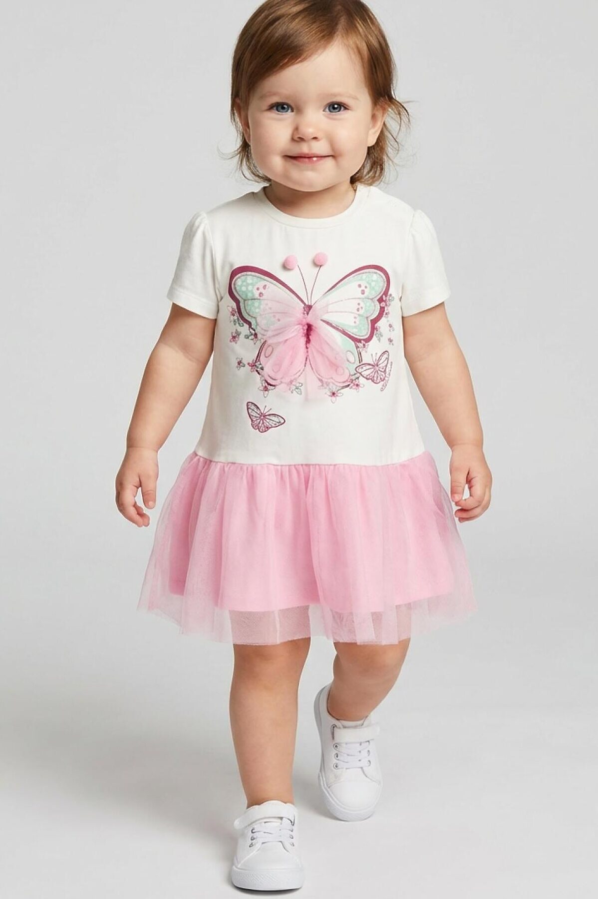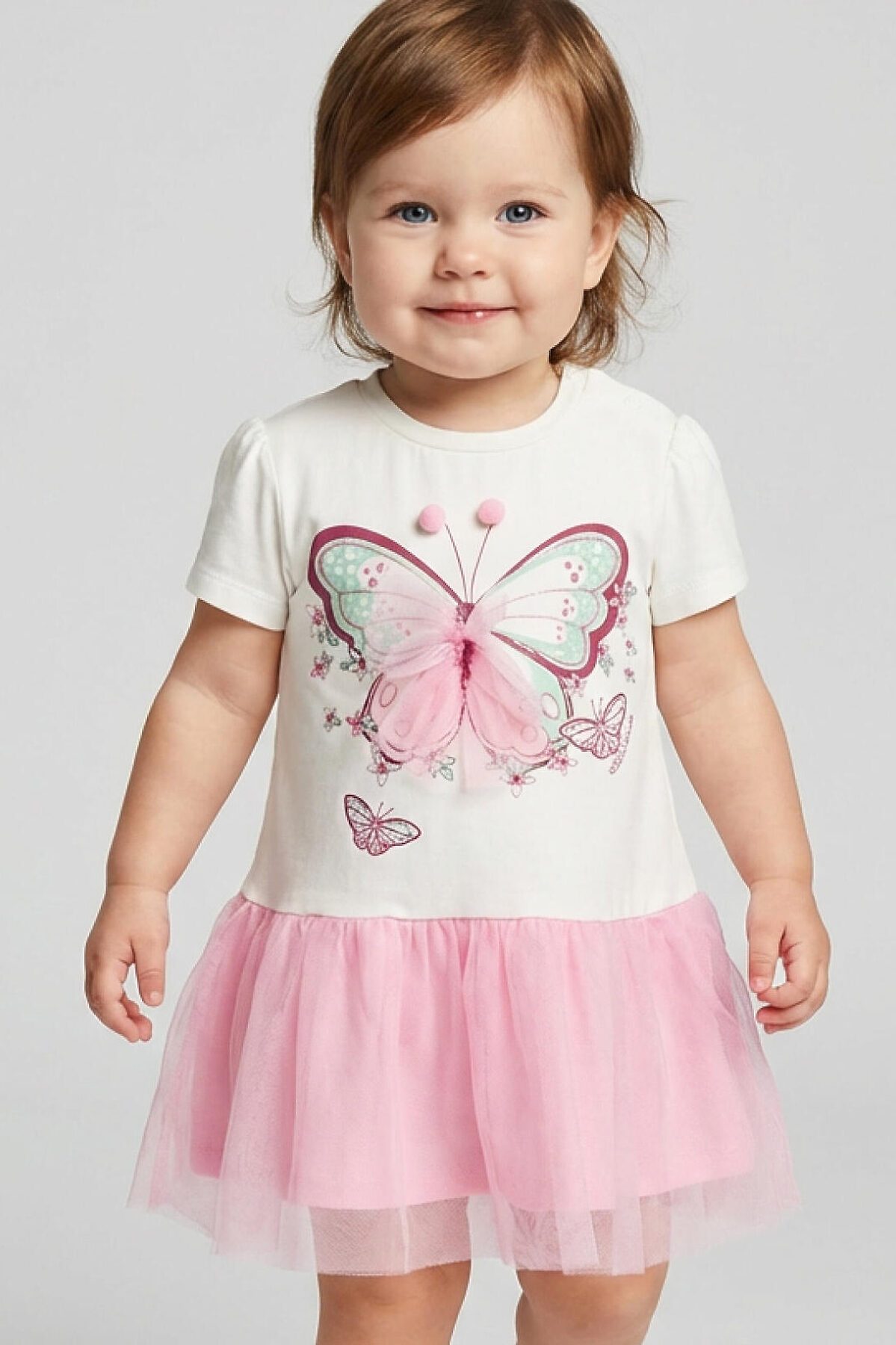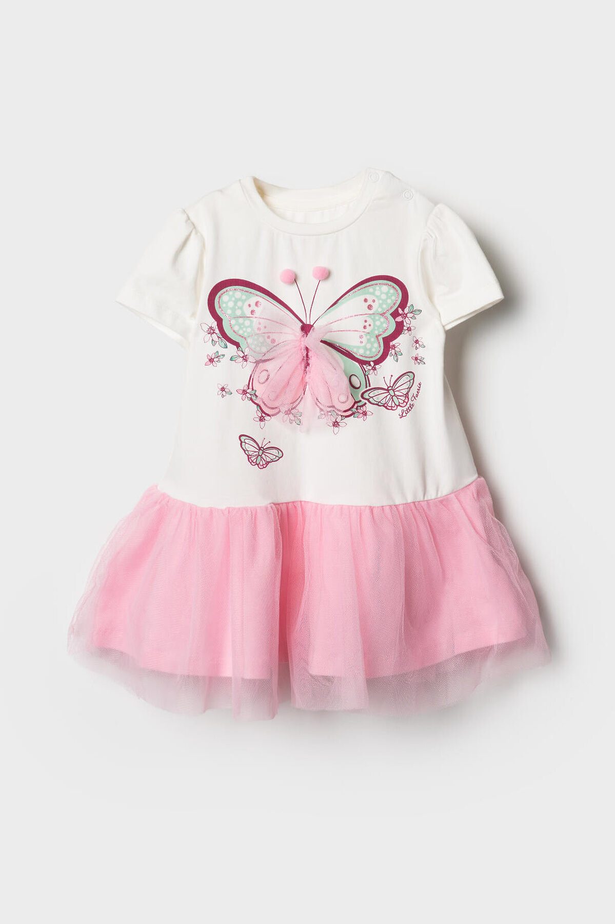 Нарядное детское платье для девочки. Модель из комбинации хлопкового трикотажа джерси и сетки. Верх выполнен в виде футболки с округлой горловиной, рукавами-фонариками и милым принтом бабочки. Бабочка украшена объёмными элементами: крылья из розовой сетки и мягкие помпоны. Нижняя часть — пышная юбочка из двух слоёв розовой сетки. На плече — кнопки, чтобы платье было удобно надевать через голову.