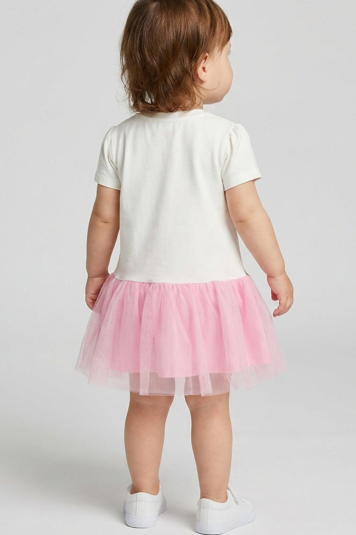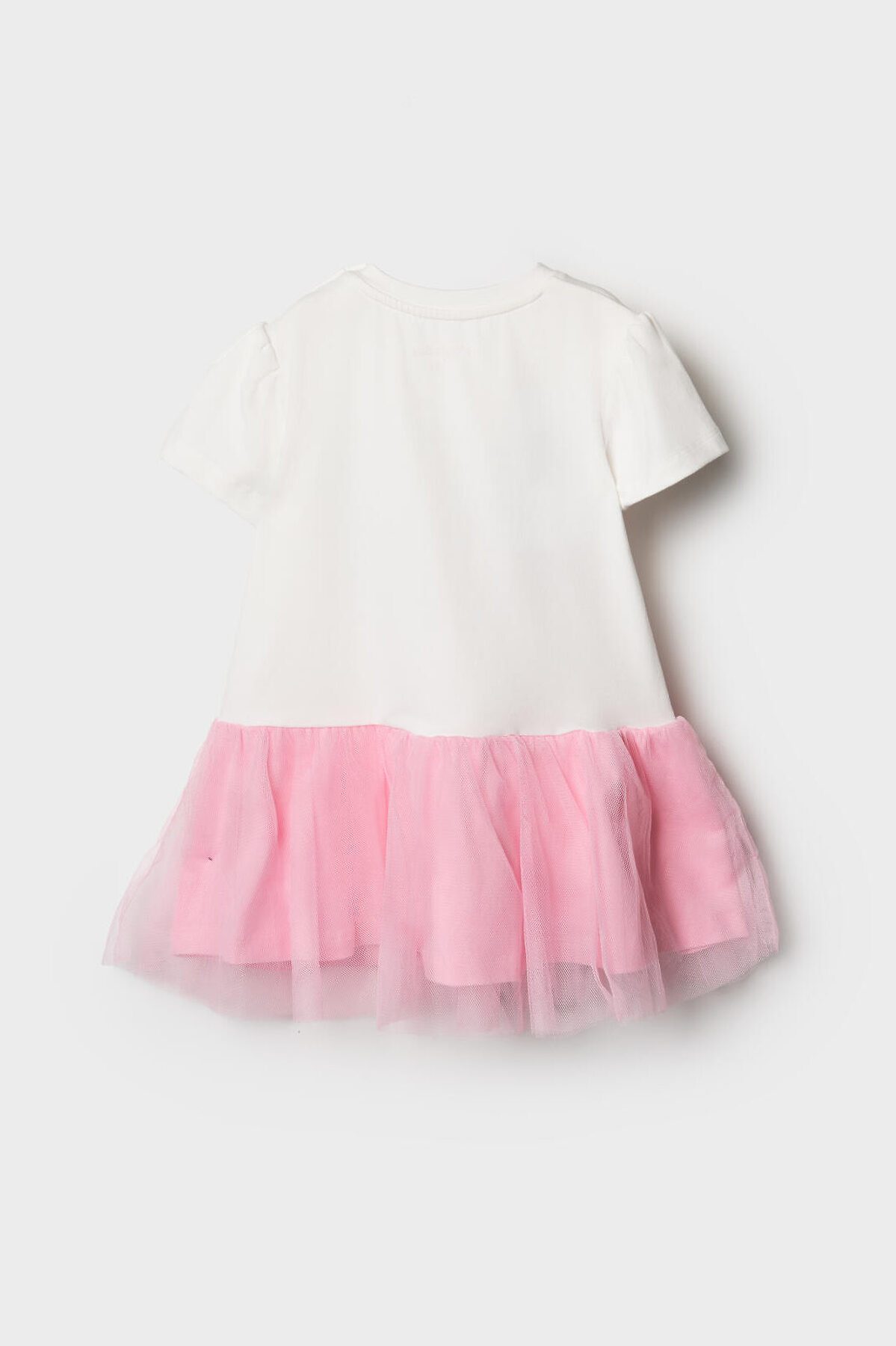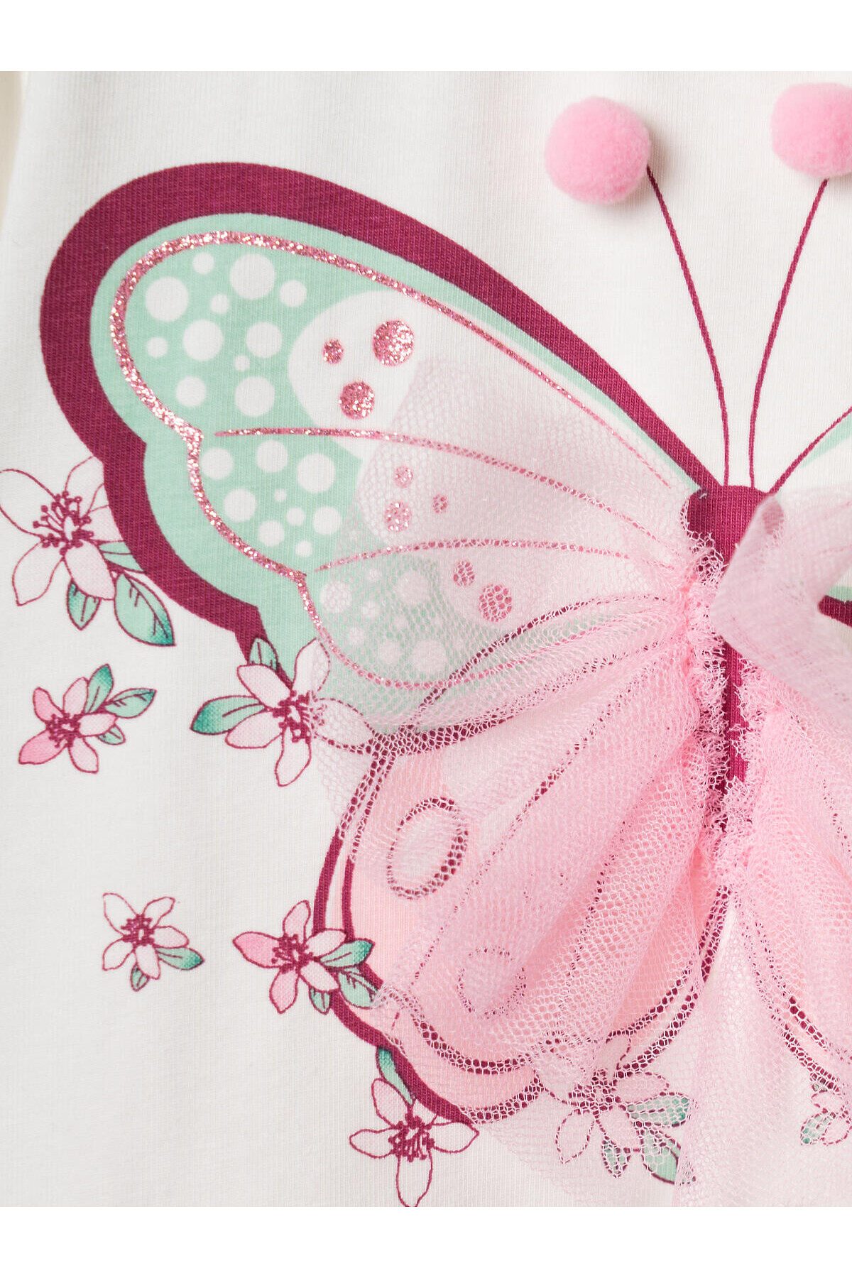 Нарядное детское платье для девочки. Модель из комбинации хлопкового трикотажа джерси и сетки. Верх выполнен в виде футболки с округлой горловиной, рукавами-фонариками и милым принтом бабочки. Бабочка украшена объёмными элементами: крылья из розовой сетки и мягкие помпоны. Нижняя часть — пышная юбочка из двух слоёв розовой сетки. На плече — кнопки, чтобы платье было удобно надевать через голову.