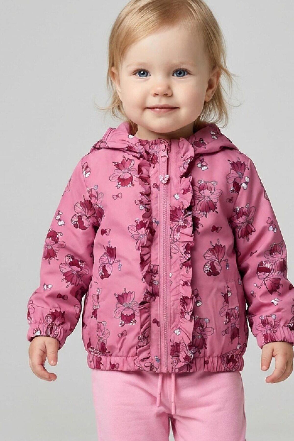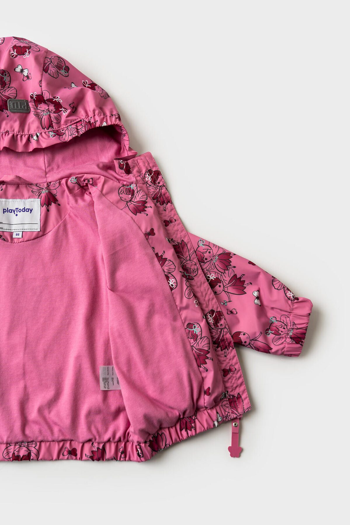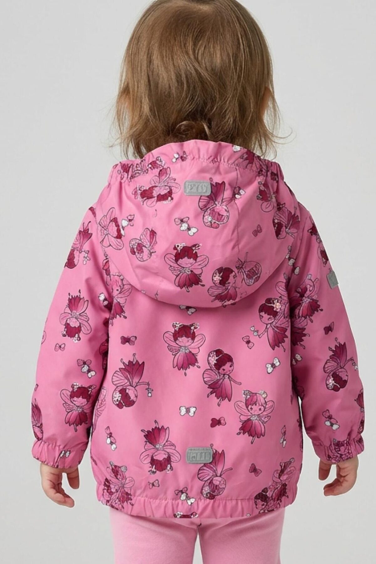 Детская ветровка для девочки. Температурный режим от +20С до +10С. Ткань с ветрозащитным и водоотталкивающим покрытием. Внутри трикотажная подкладка. Капюшон несъемный на резинке. Два боковых кармана на липучке. Низ изделия и рукава собраны на резинку для плотного прилегания. На спинке, капюшоне и рукавах есть светоотражающие элементы для безопасности в темное время суток.