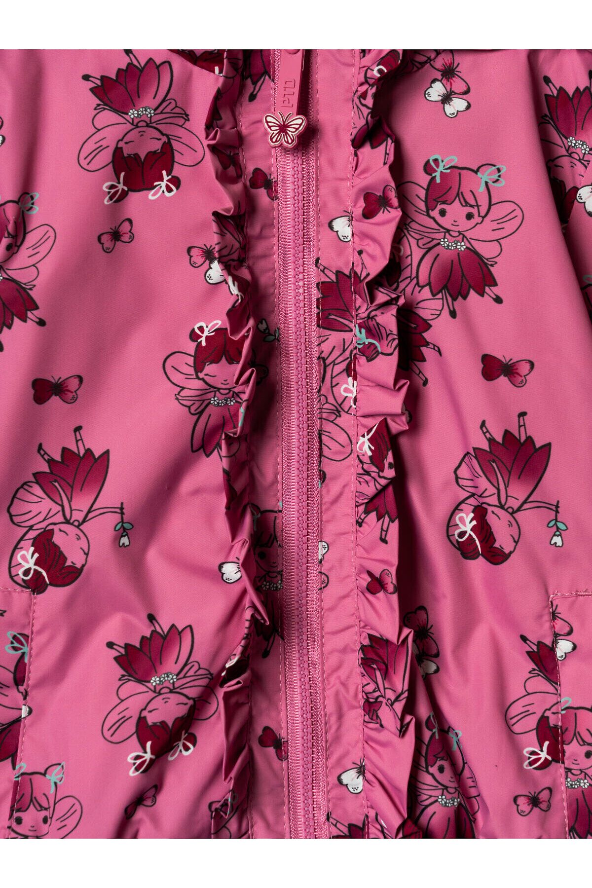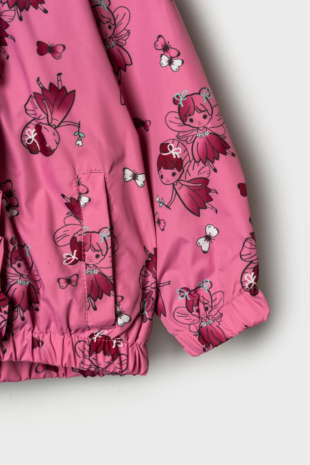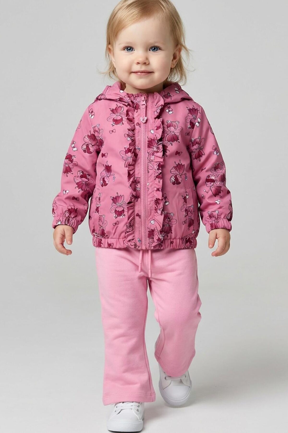 Детская ветровка для девочки. Температурный режим от +20С до +10С. Ткань с ветрозащитным и водоотталкивающим покрытием. Внутри трикотажная подкладка. Капюшон несъемный на резинке. Два боковых кармана на липучке. Низ изделия и рукава собраны на резинку для плотного прилегания. На спинке, капюшоне и рукавах есть светоотражающие элементы для безопасности в темное время суток.