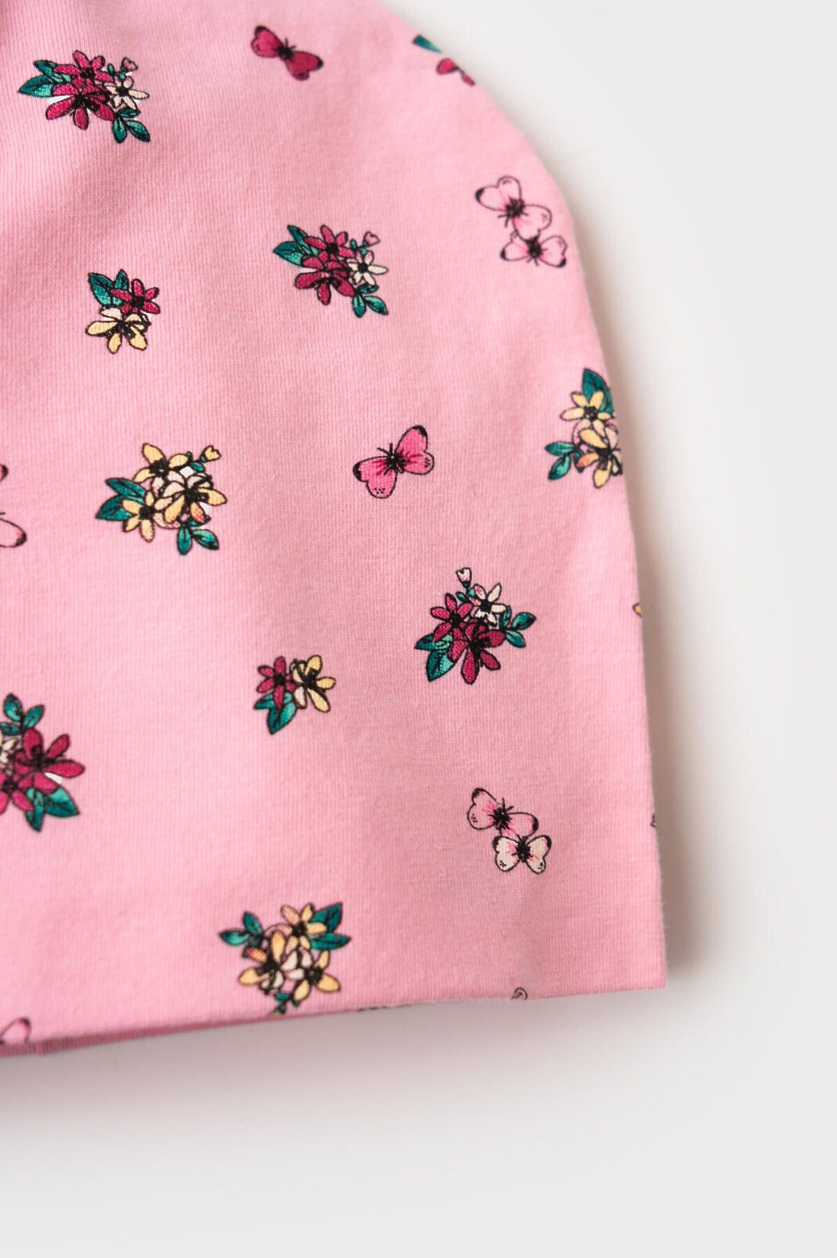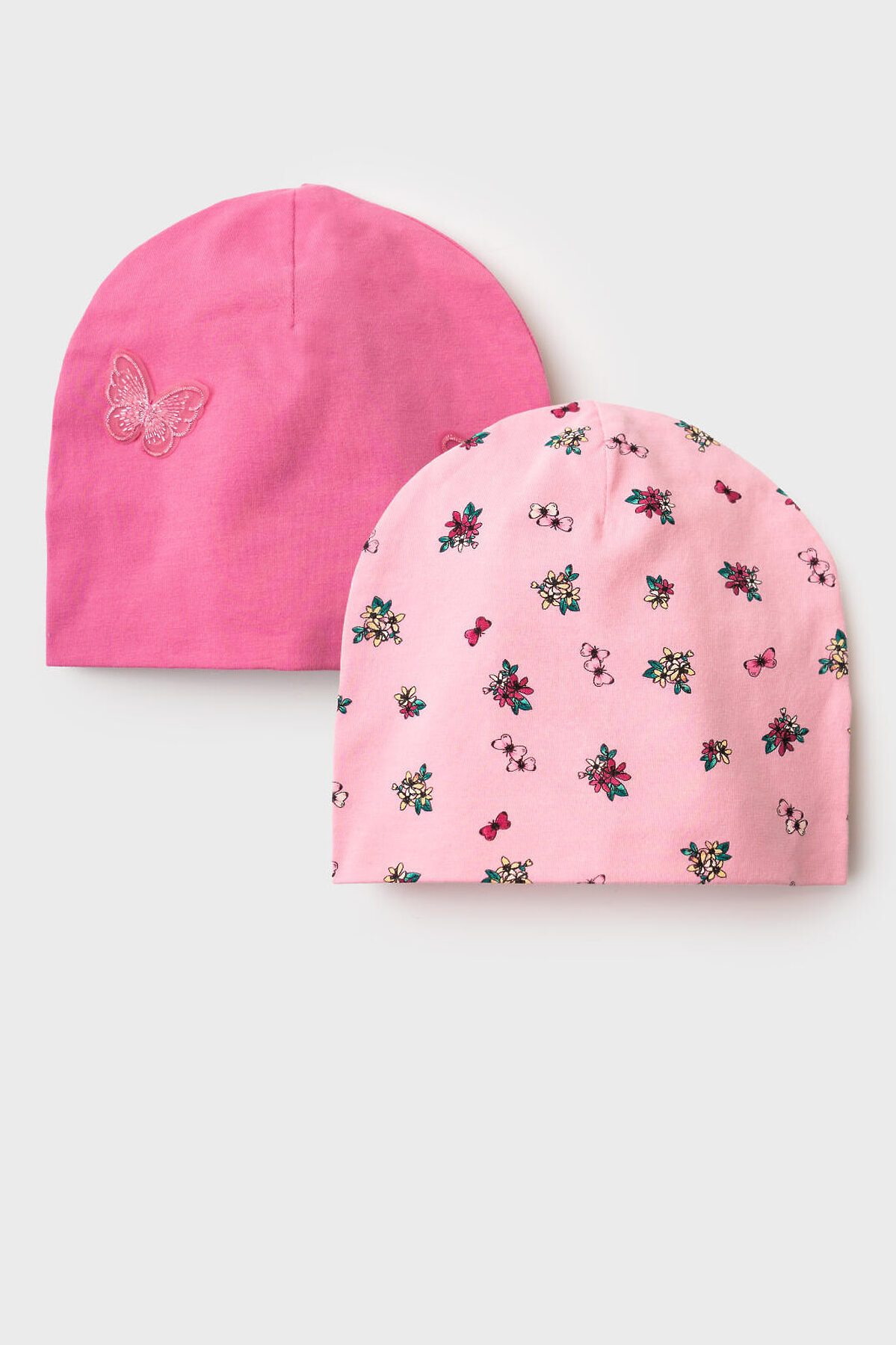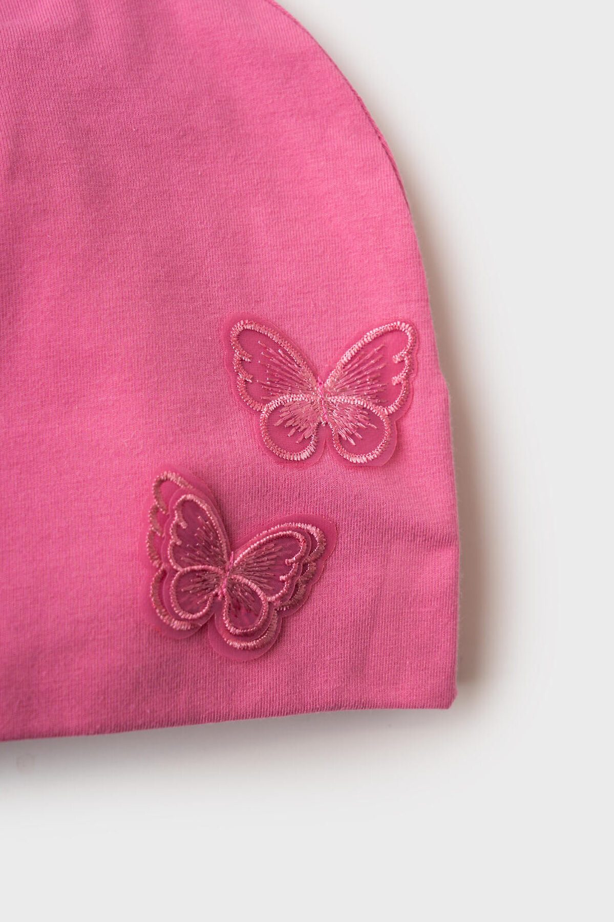Набор из 2 детских шапок для девочки. Модель из хлопкового трикотажа. Декор из бабочек и цветов.