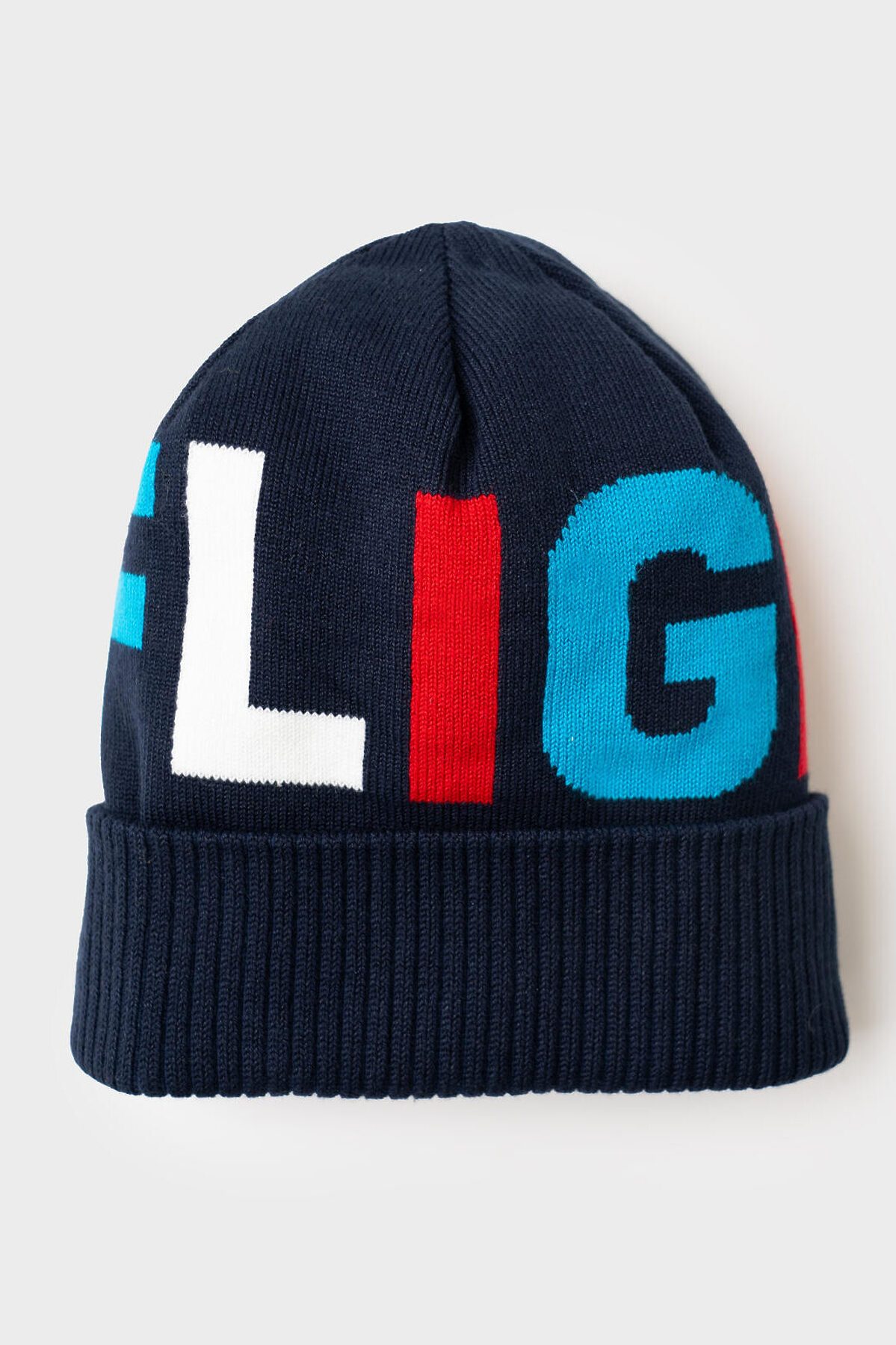 Вязаная детская шапка для мальчика. Модель, из трикотажа с высоким содержанием хлопка. Большая жаккардовая надпись. Одинарная вязка. Внизу — мягкий отворот, который помогает шапке лучше держаться на голове.