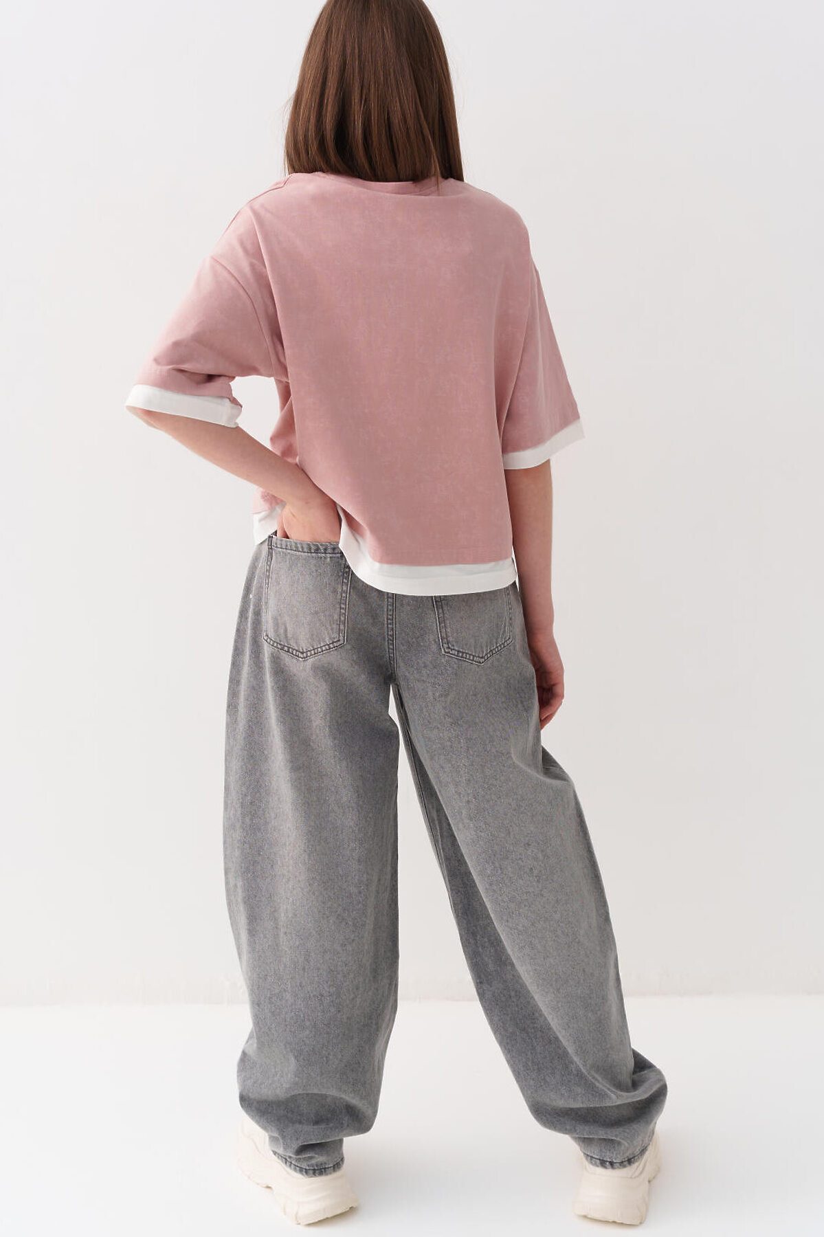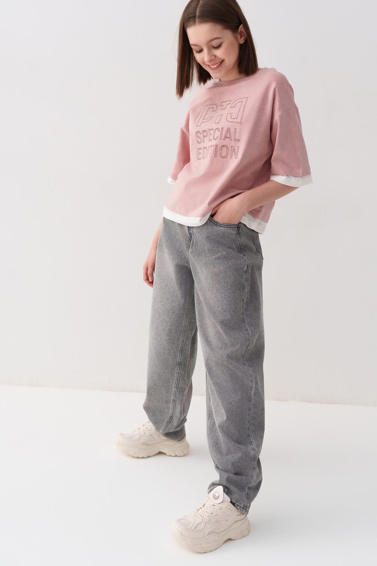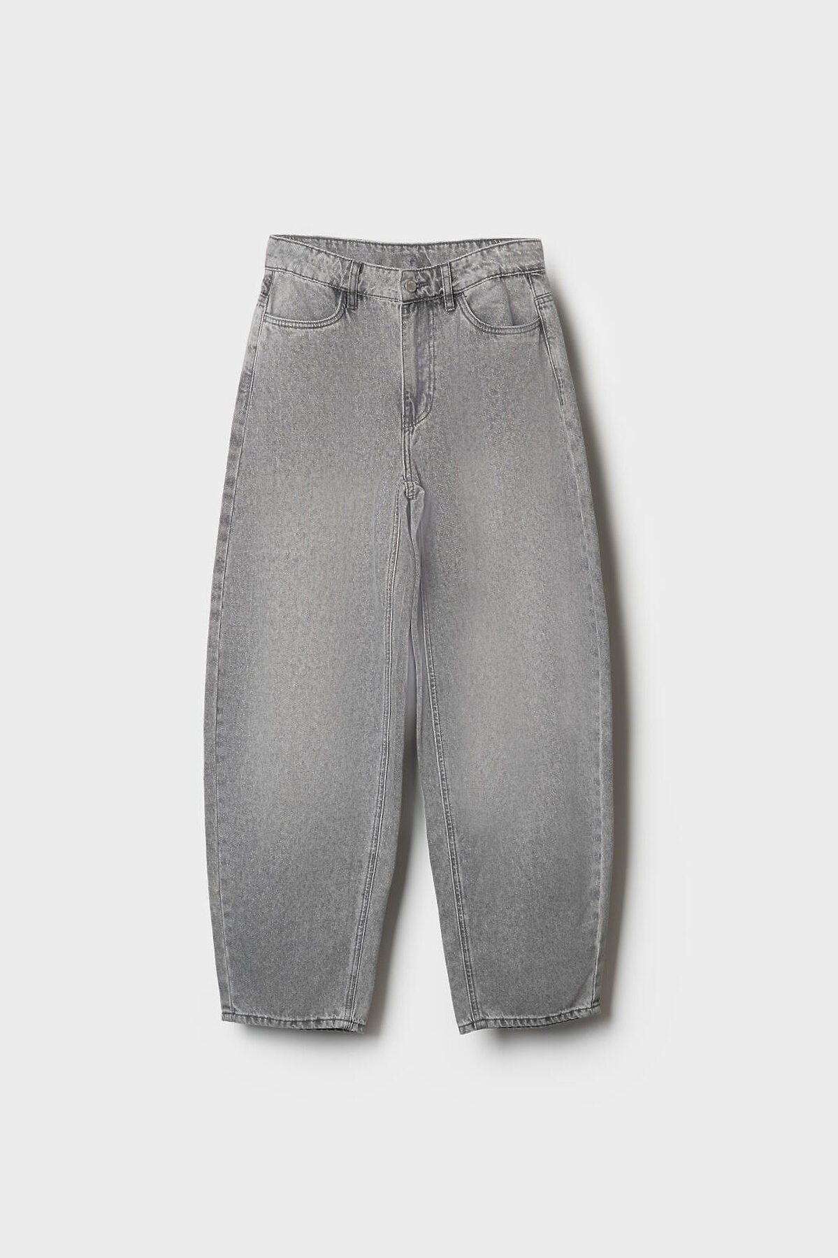 Джинсы багги для девочки подростка. Свободный крой baggy, выполнены из вареного серого денима. Спереди удобные боковые карманы, сзади — накладные. Застежка на молнию и болт. На поясе предусмотрена регулировка за счёт внутренней резинки с пуговицей. Украшены декоративным лейблом на спинке. Отличный вариант для повседневной носки в весенне-летний сезон.