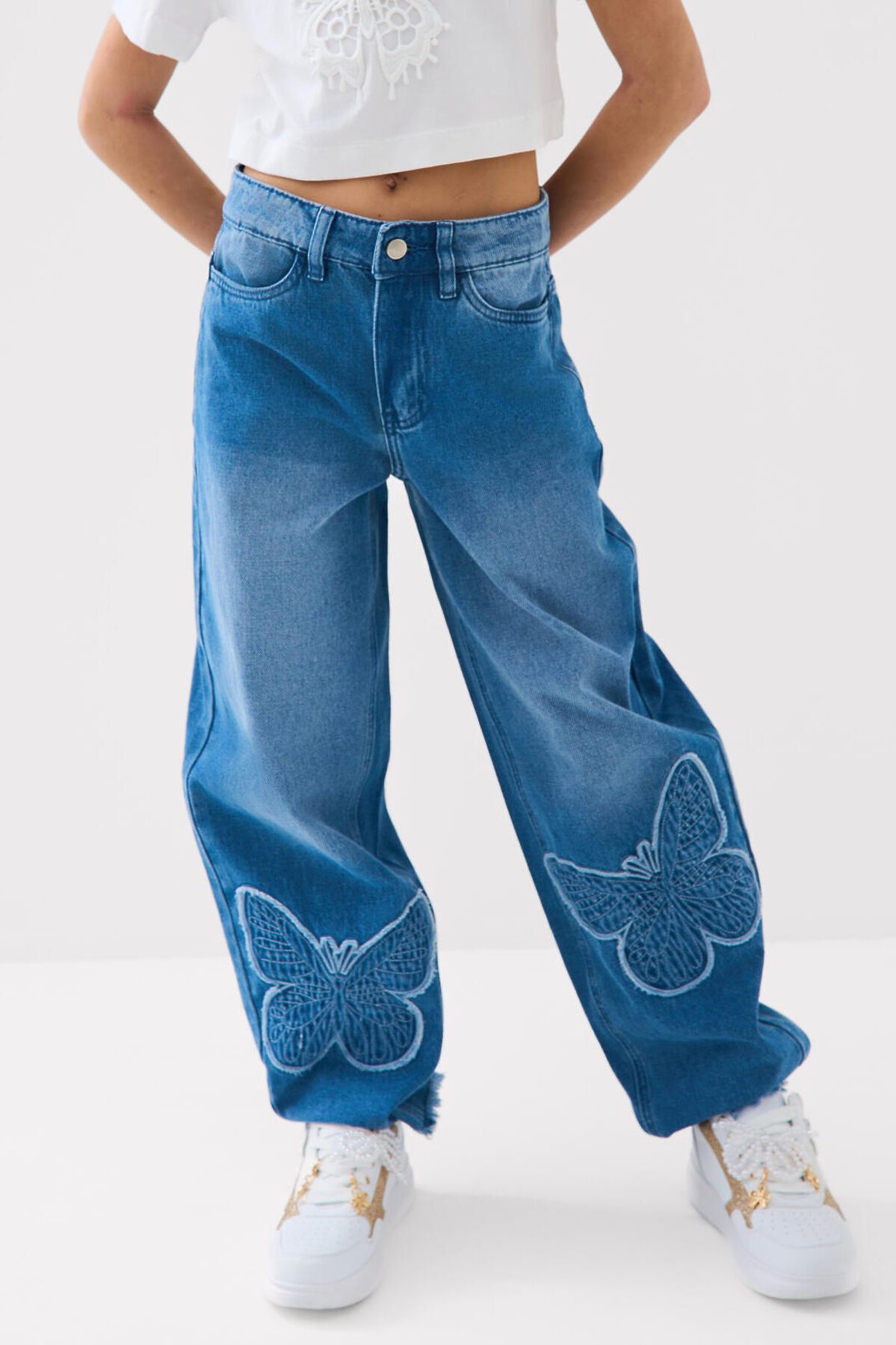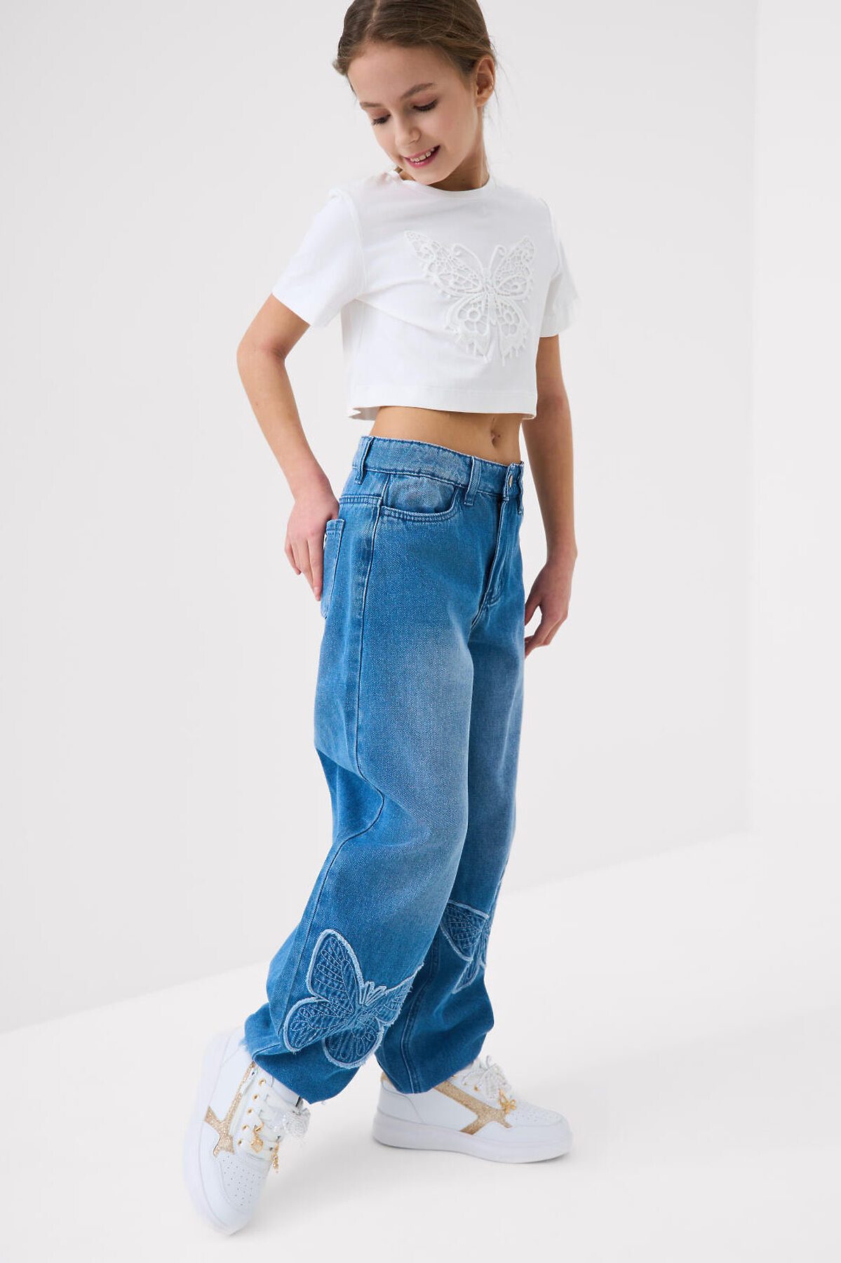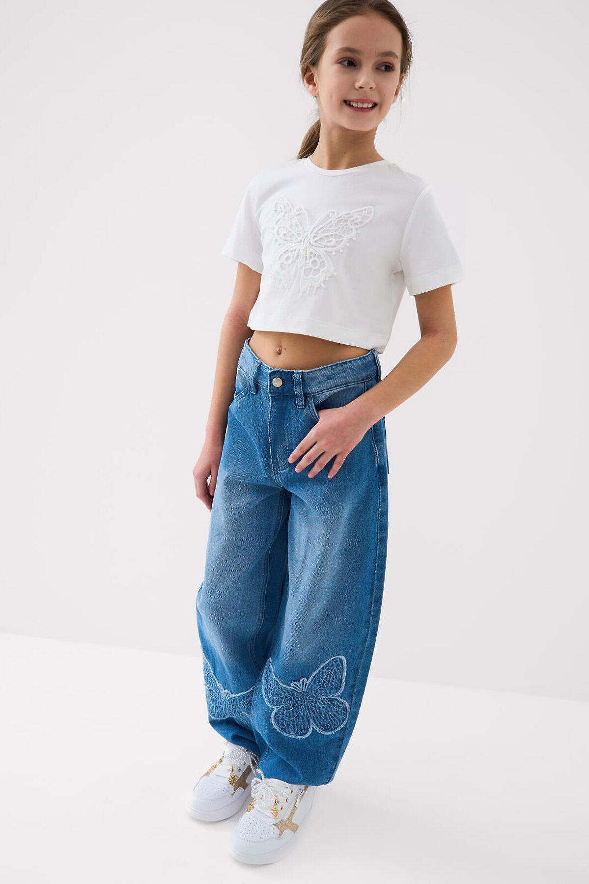 Джинсы багги для девочки подростка. Широкие джинсы из светло-синего денима с оригинальной посадкой: свободные по бедрам и немного зауженные к щиколотке. Спереди — два боковых кармана, сзади — два накладных. Застежка — на молнию и болт. По талии предусмотрен регулируемый внутренний пояс на резинке. Эффектные декоративные бабочки, выполненные в виде объемной вышивки с вырезанными краями, расположены на коленях.