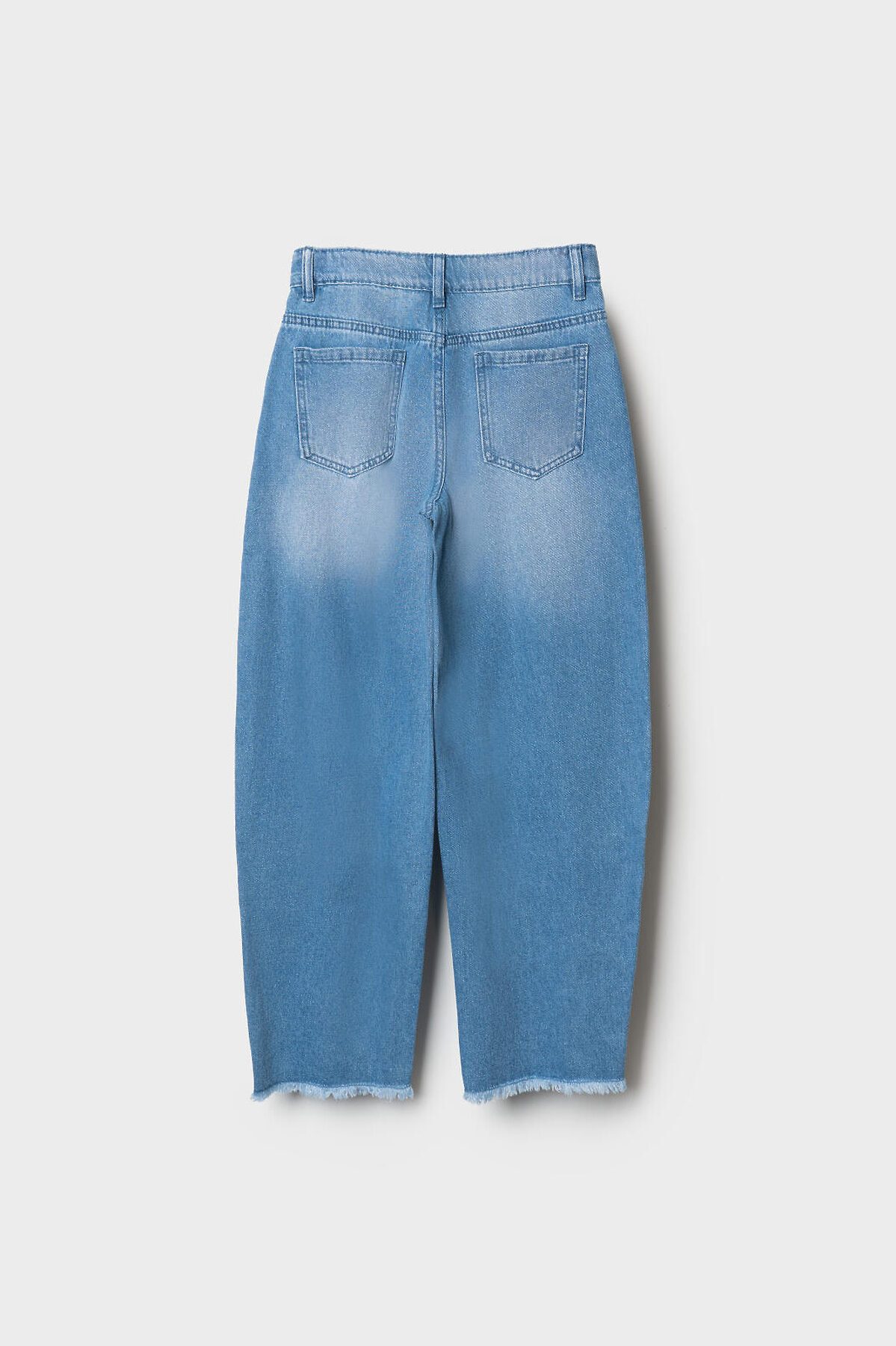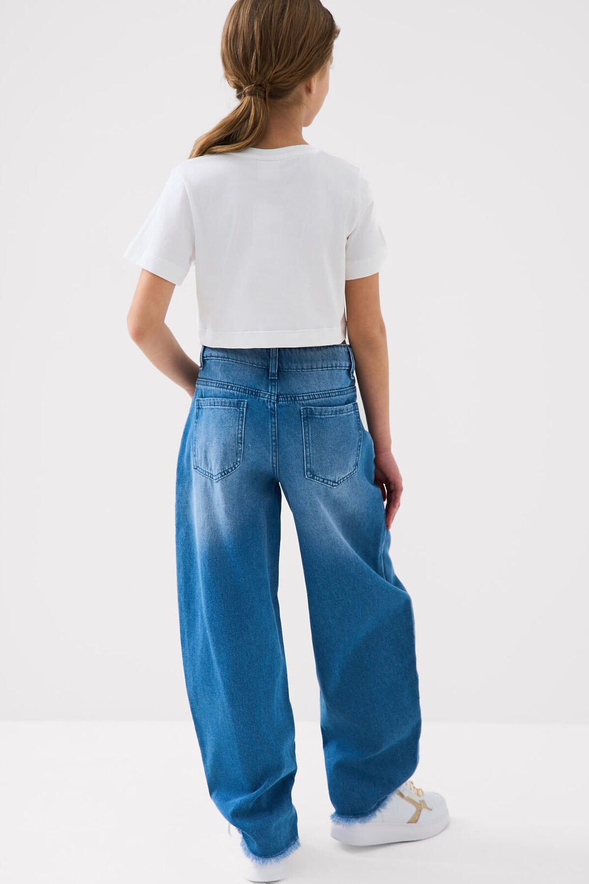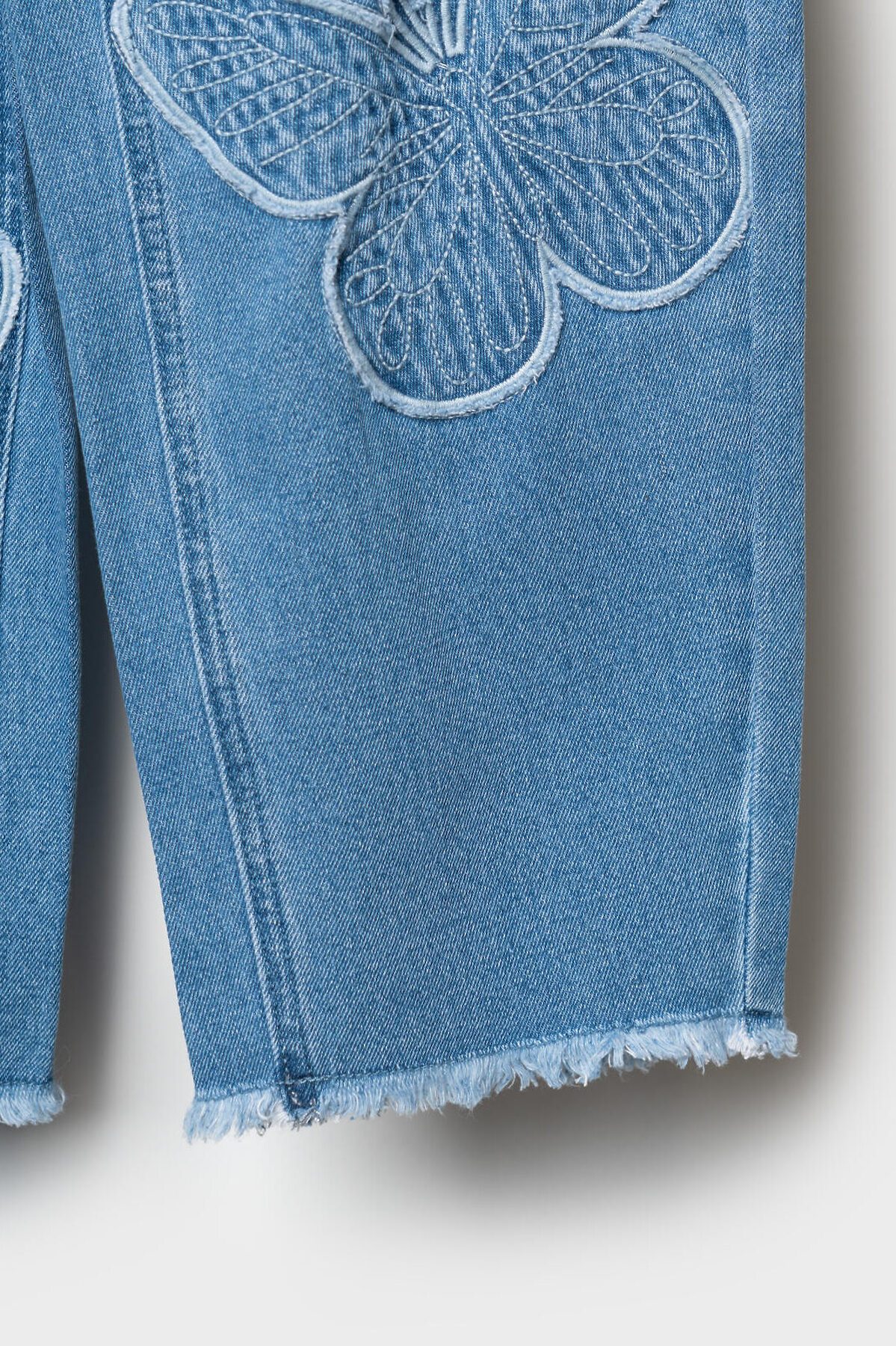 Джинсы багги для девочки подростка. Широкие джинсы из светло-синего денима с оригинальной посадкой: свободные по бедрам и немного зауженные к щиколотке. Спереди — два боковых кармана, сзади — два накладных. Застежка — на молнию и болт. По талии предусмотрен регулируемый внутренний пояс на резинке. Эффектные декоративные бабочки, выполненные в виде объемной вышивки с вырезанными краями, расположены на коленях.