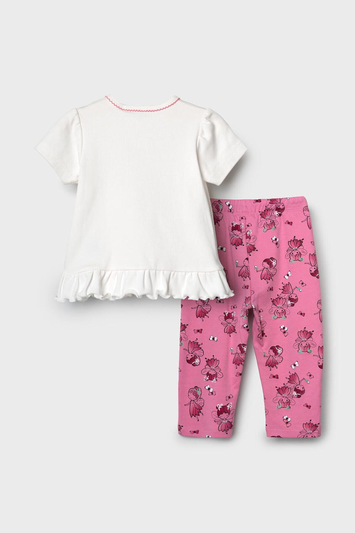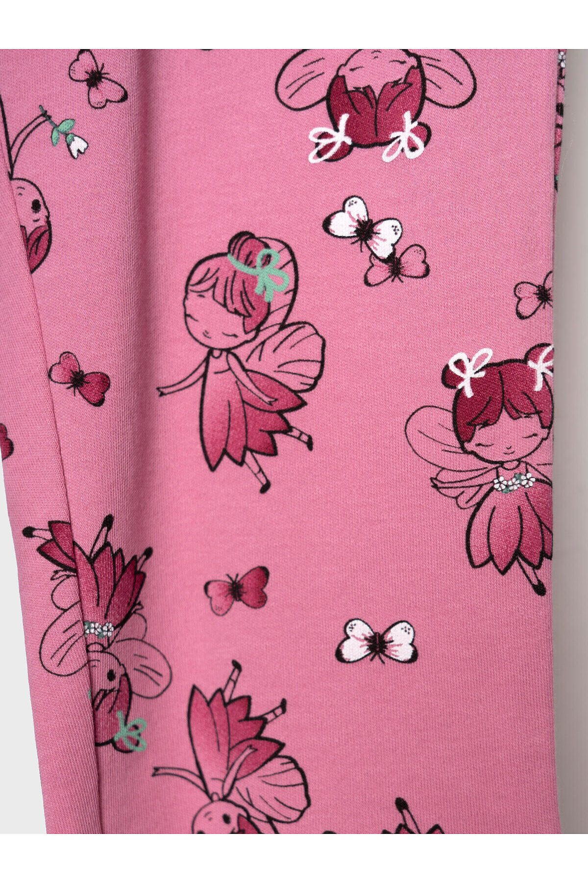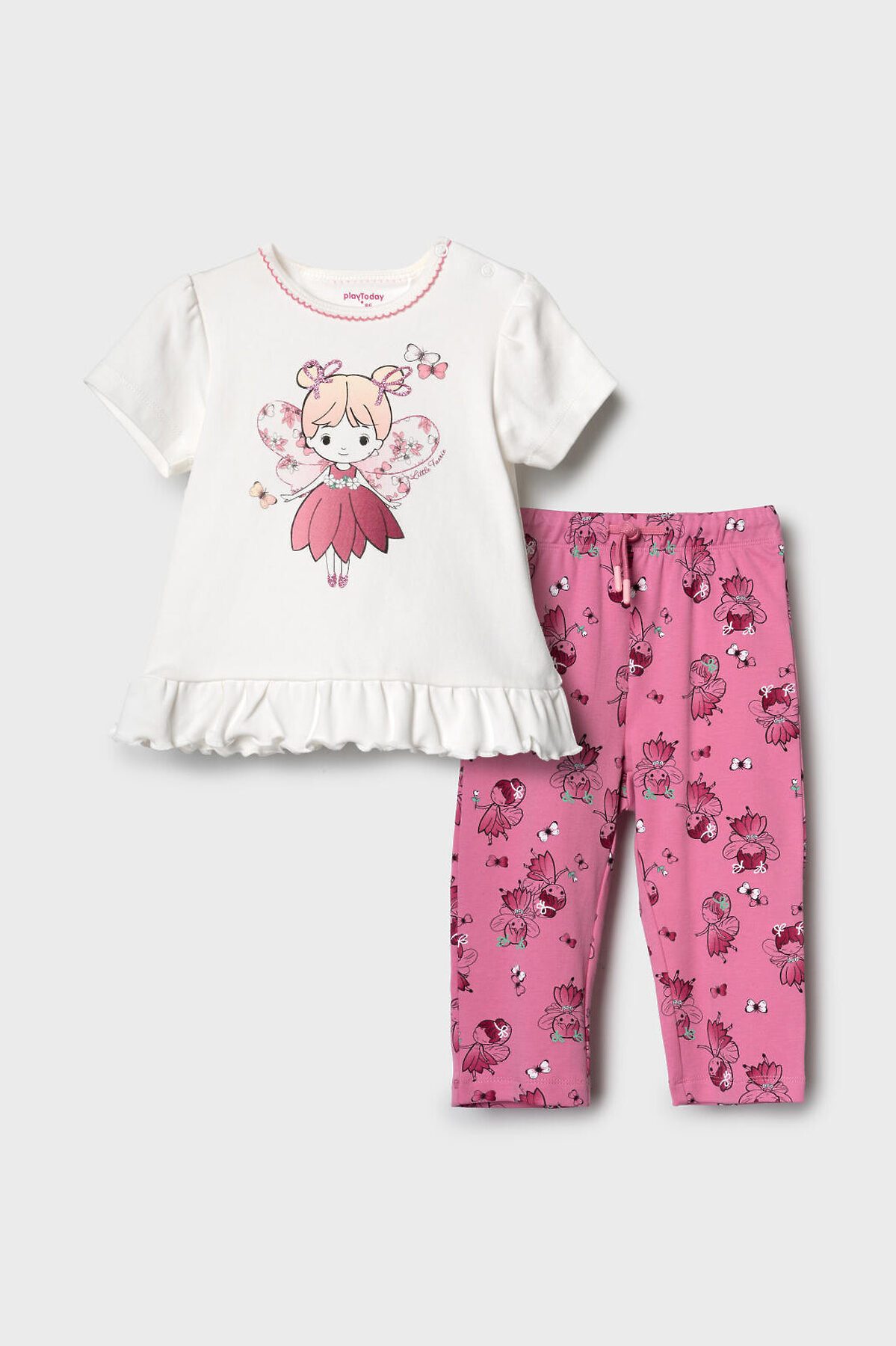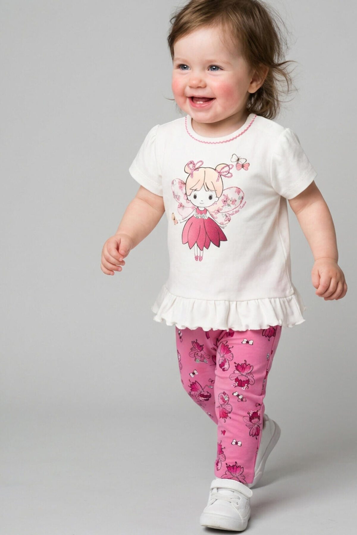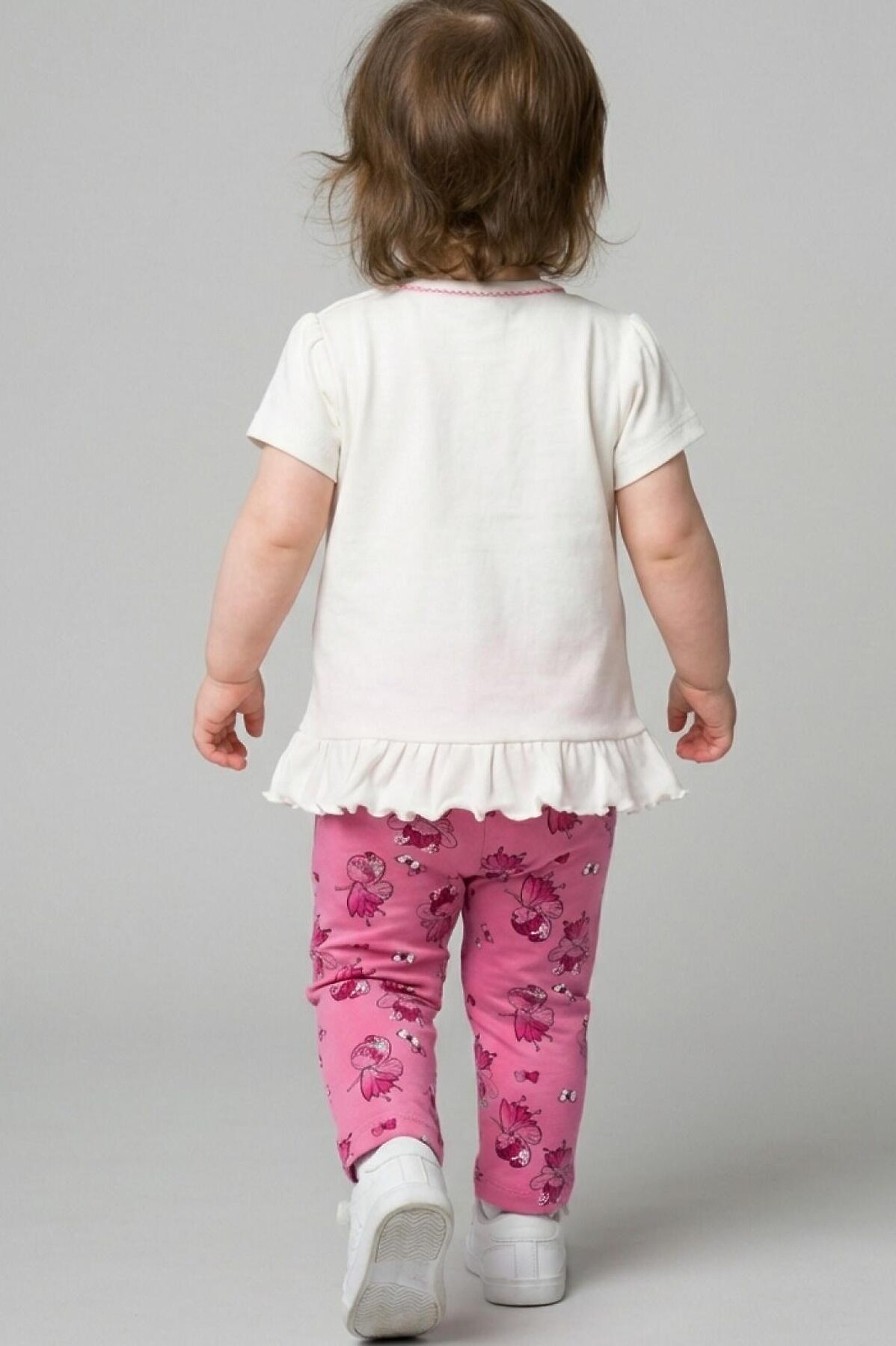 Нежный детский комплект для девочки. Состоит из футболки с коротким рукавом и брюк. Выполнен из хлопкового трикотажа. Футболка украшена крупным принтом с феей. По низу футболки - рюша, которая добавляет образу воздушности. Горловина округлая, а на плече предусмотрены кнопки для удобного переодевания. Брюки с рисунком с феями, цветами и бабочками. Посадка высокая, пояс на мягкой резинке с декоративным шнурком для регулировки посадки.
