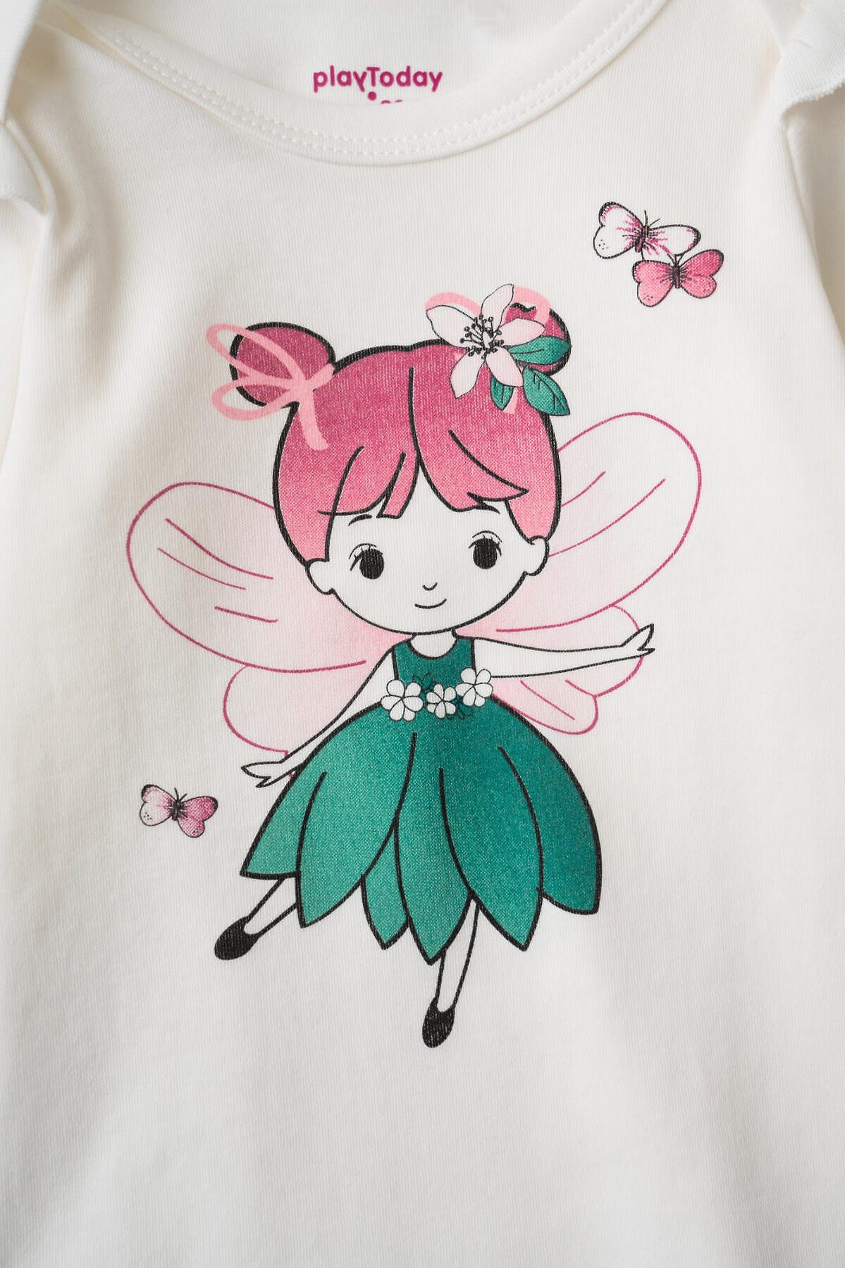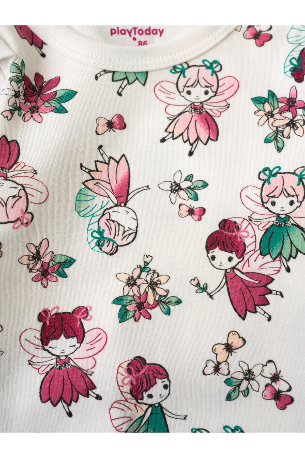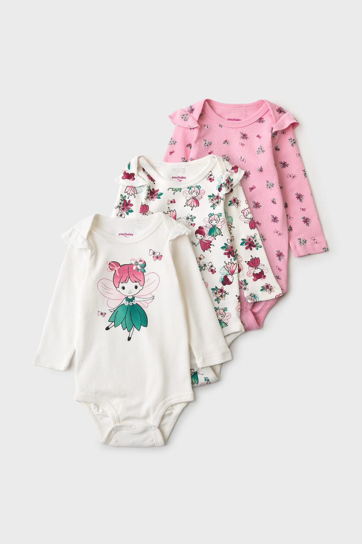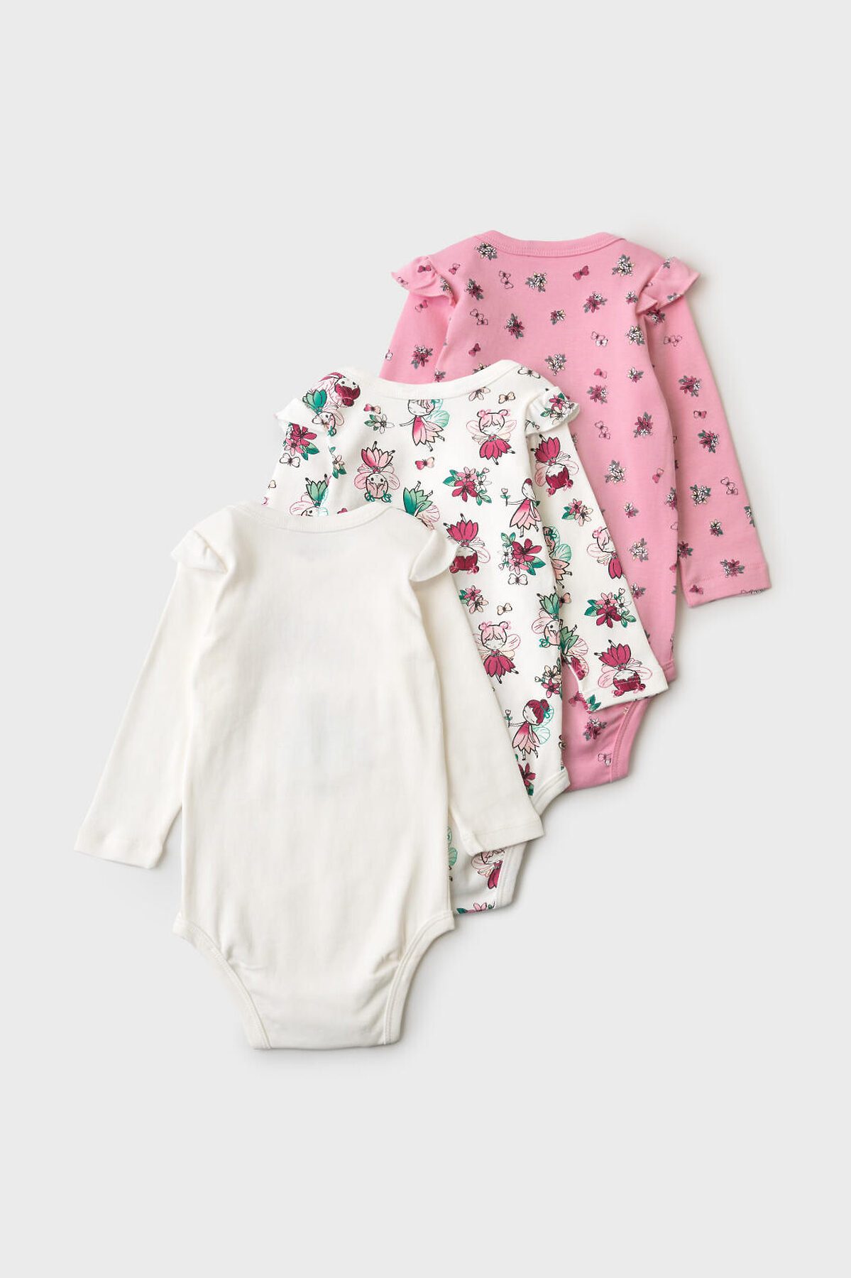 Комплект из трёх боди для новорождённой девочки. Все изделия выполнены из мягкой хлопковой ткани, с длинными рукавами и удобной застёжкой на кнопки снизу. Два ряда кнопок, боди растет вместе с малышом. У каждого боди — милые рюши на плечах и разный дизайн: одно с крупным принтом феи, второе — с принтом фей и цветов, третье — розовое с мелким цветочным рисунком.