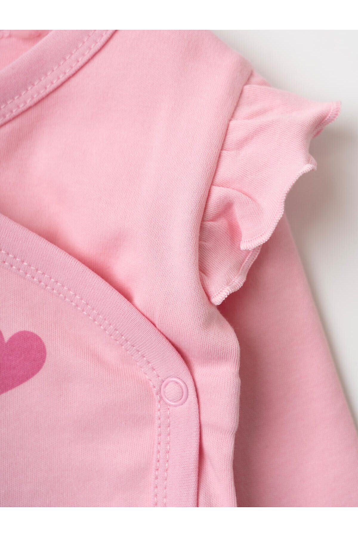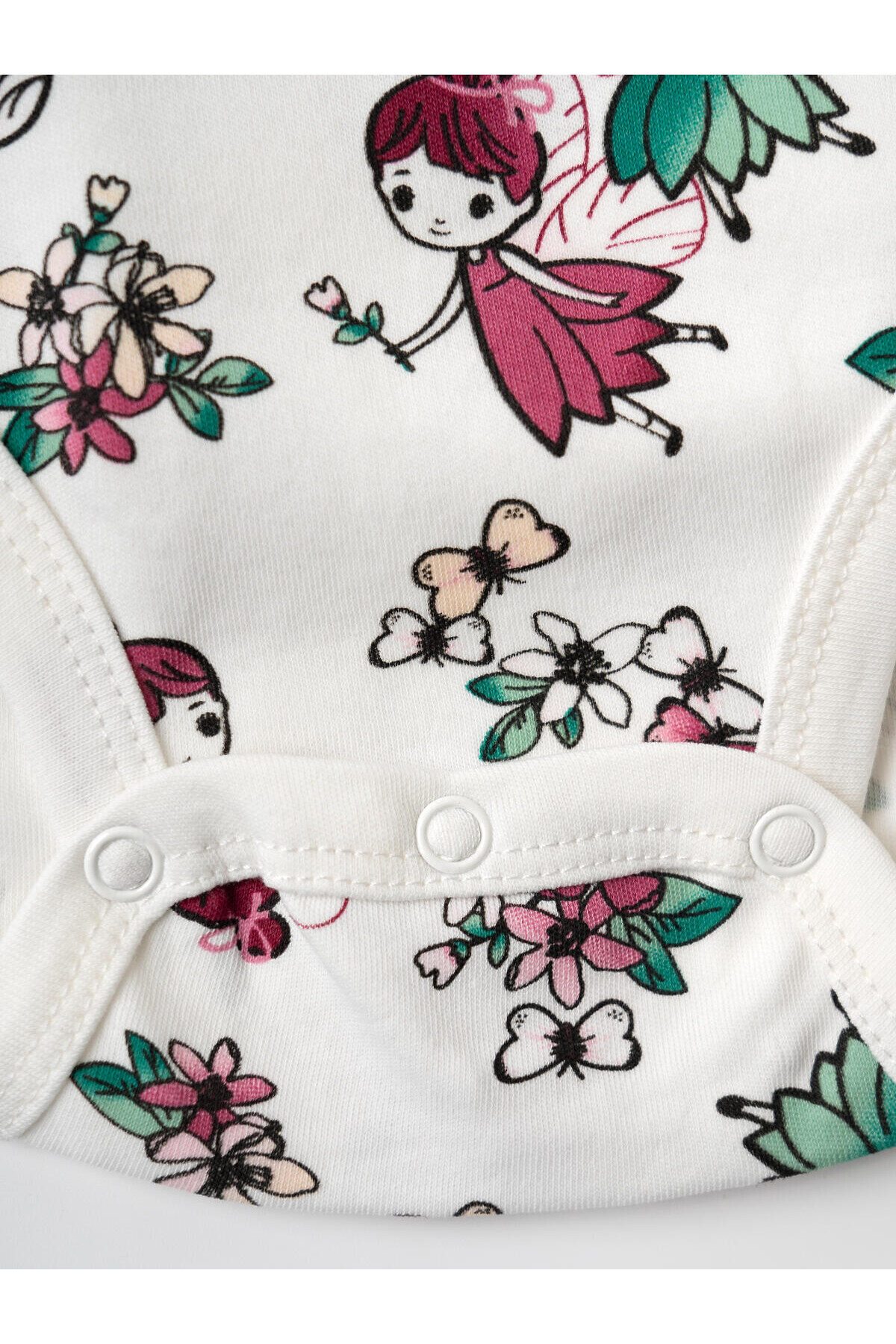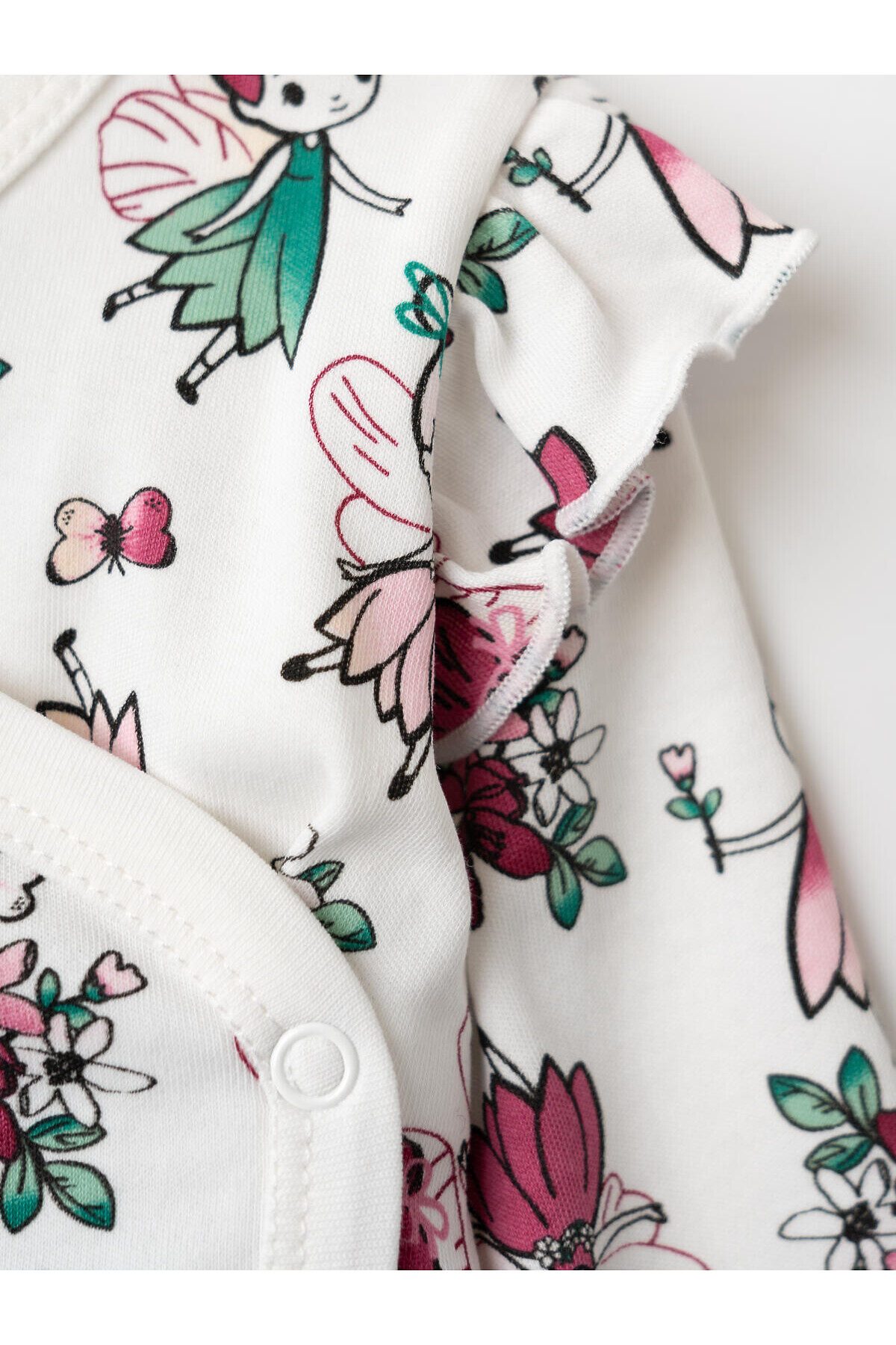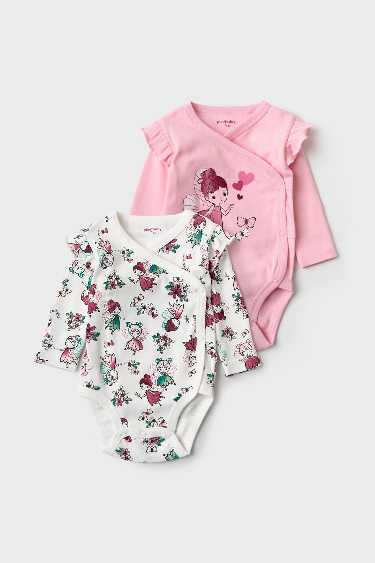 Комплект из двух боди для новорождённой девочки, с длинными рукавами и удобной застёжкой на запах. Одно из боди — розового цвета с принтом феи и бабочек спереди, другое — с ярким цветочным и сказочным принтом на светлом фоне. Модель украшена милыми рюшами на плечах, что придаёт особый очаровательный вид. На маленькие размеры (56 и 62) предусмотрены варежки на рукавах, чтобы защитить малыша от царапин. Материал мягкий, хлопковый интерлок — приятный к телу, хорошо дышит. Застёжки — удобные металлические кнопки. Два ряда кнопок, боди растет вместе с малышом.