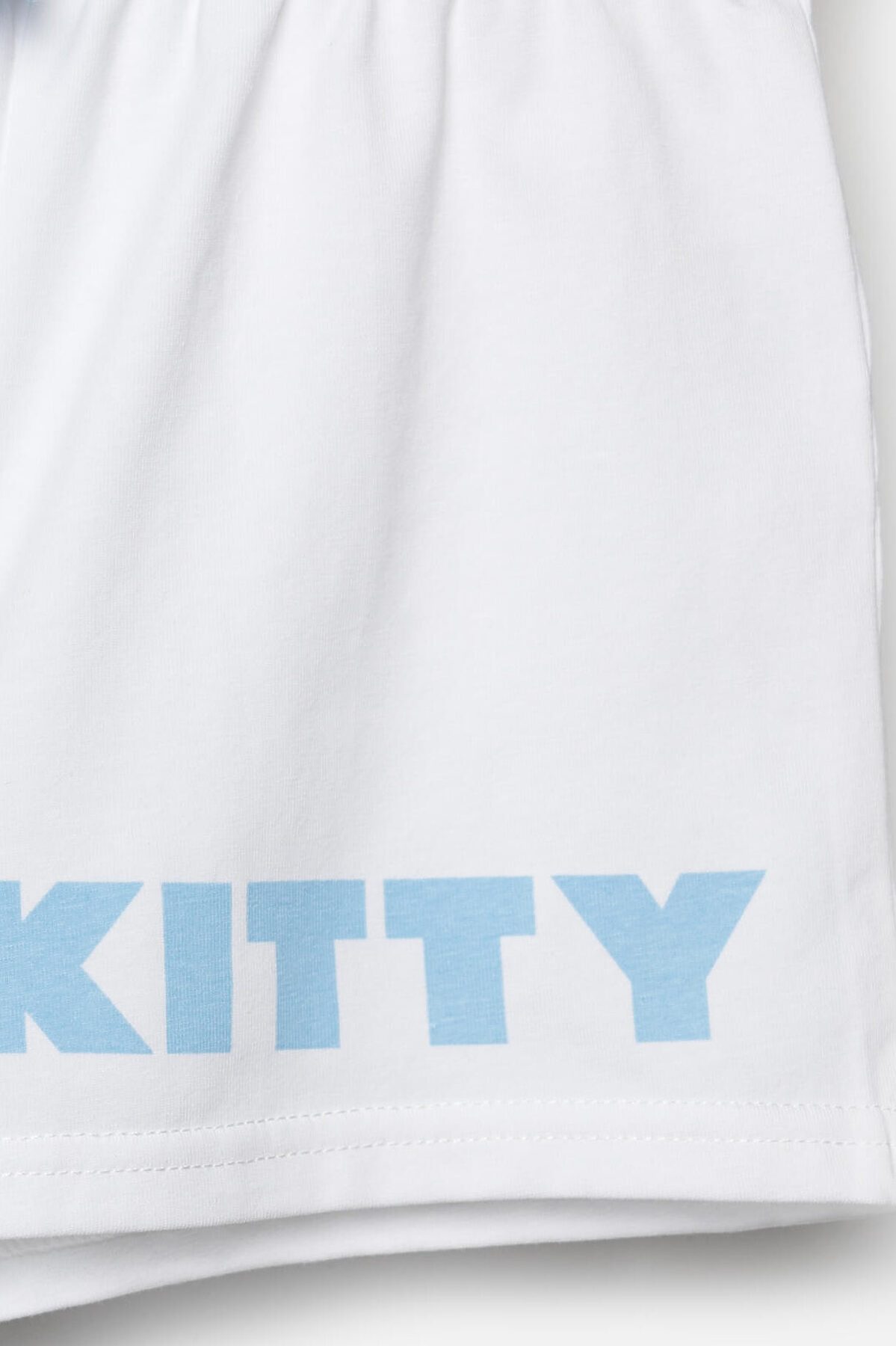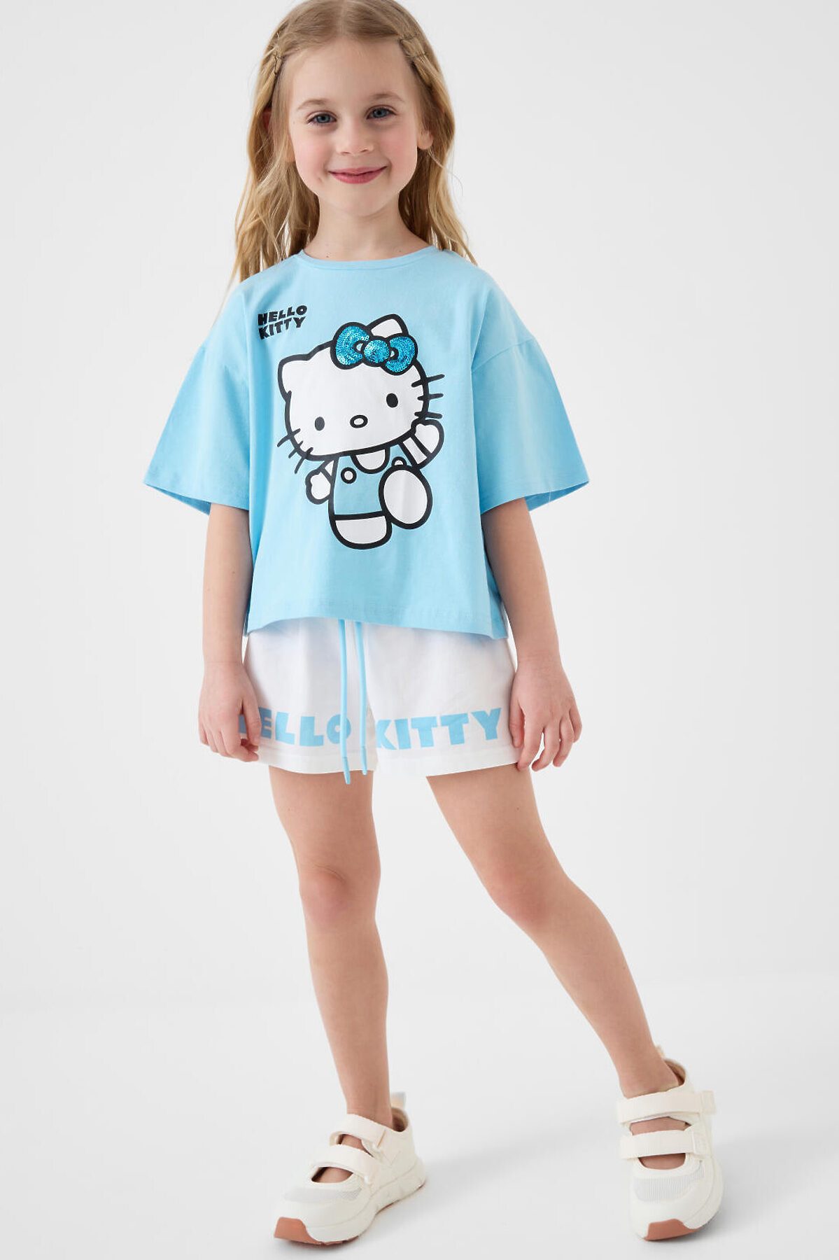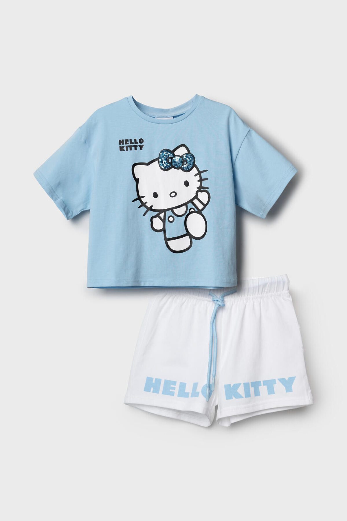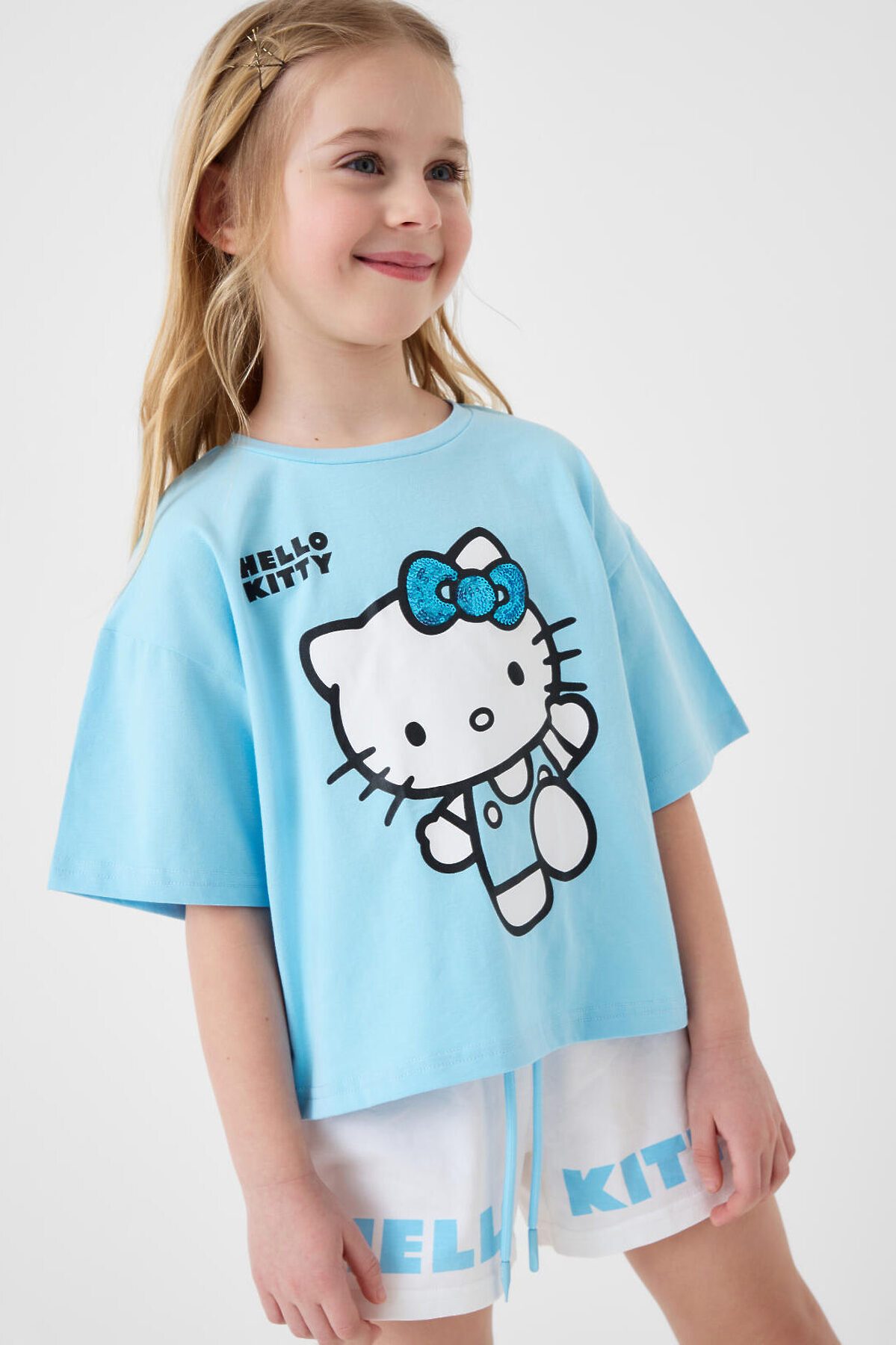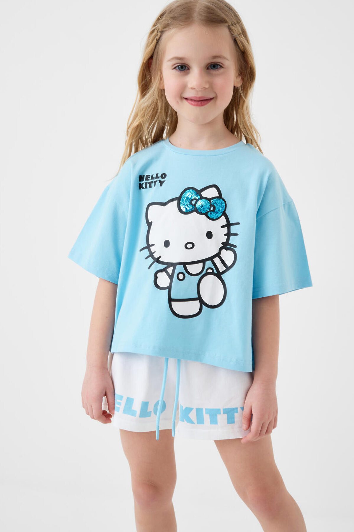 Детский костюм для девочки. Состоит из футболки и шорт. Выполнен из хлопкового трикотажа. Футболка оверсайз, с коротким рукавом. Яркий принт с любимым персонажем "Hello Kitty". Шорты свободные, с эластичным поясом и шнурком для регулировки посадки.