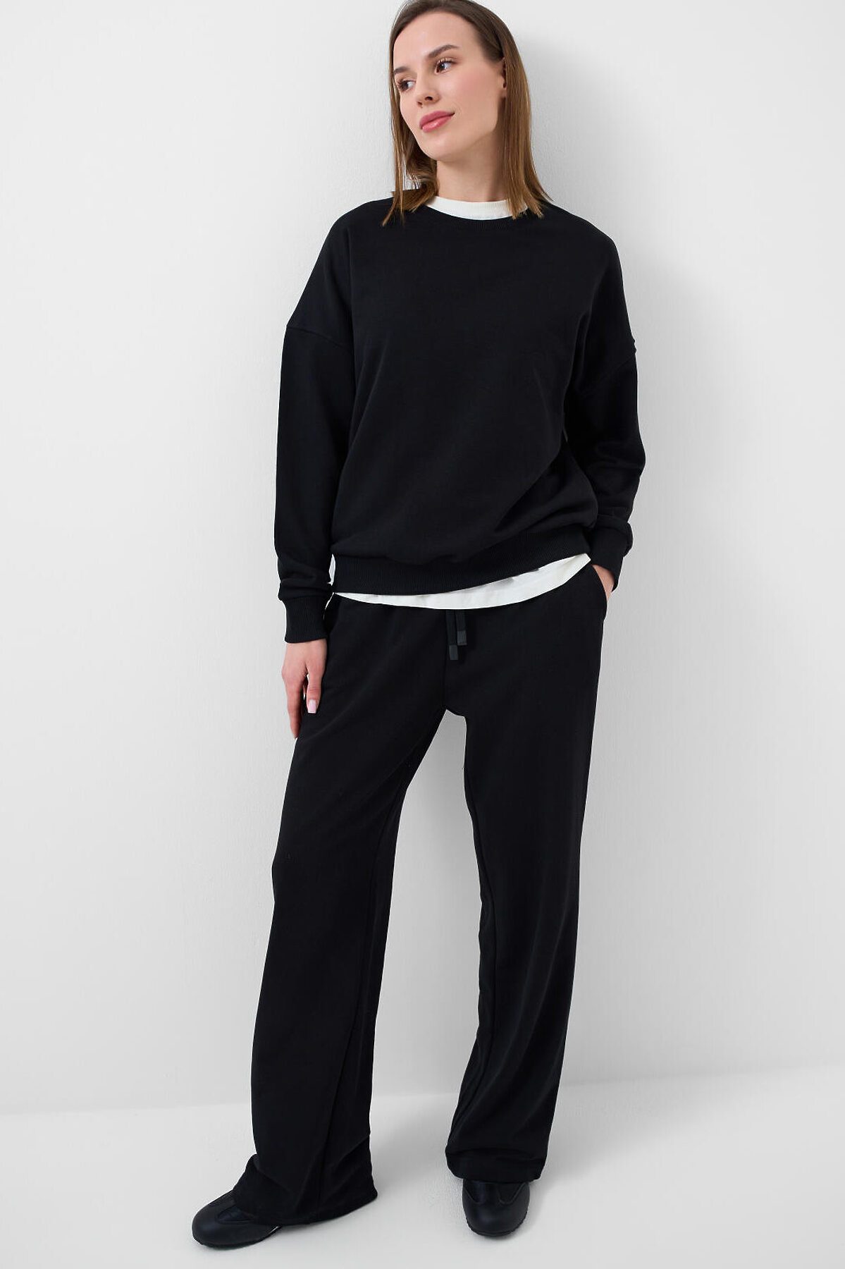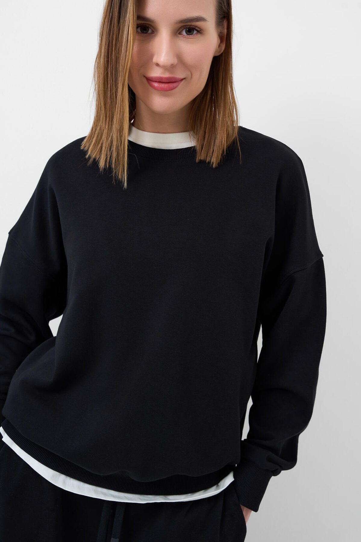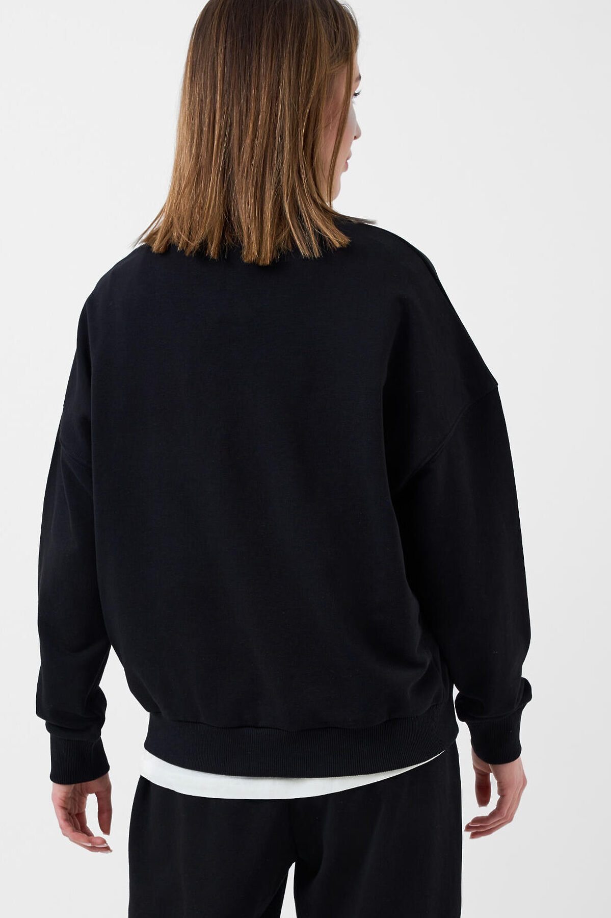 Женский черный свитшот оверсайз. Выполнен из хлопкового футера без начеса. Горловина, манжеты и низ изделия выполнены из эластичного риба, что обеспечивает комфортную посадку.